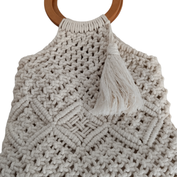 Η τσάντα διαθέτει δύο ξύλινα χερούλια με διάμετρο 14 εκ. και μια εντυπωσιακή φούντα που προσθέτει στυλ. Οι διαστάσεις της είναι 25×24 εκ., ενώ το συνολικό ύψος της με τα χερούλια φτάνει τα 39 εκ. Το σχέδιο της είναι υπέροχο και ενισχύει το boho στυλ της.