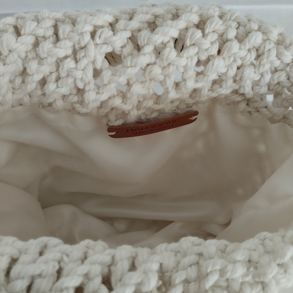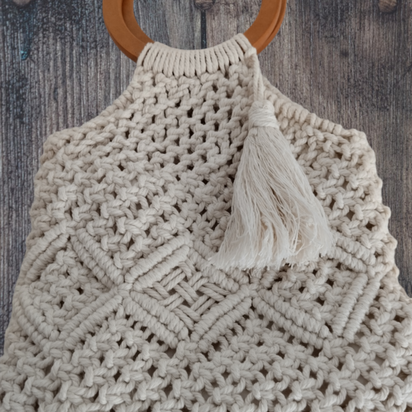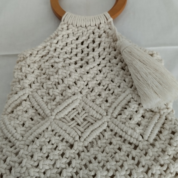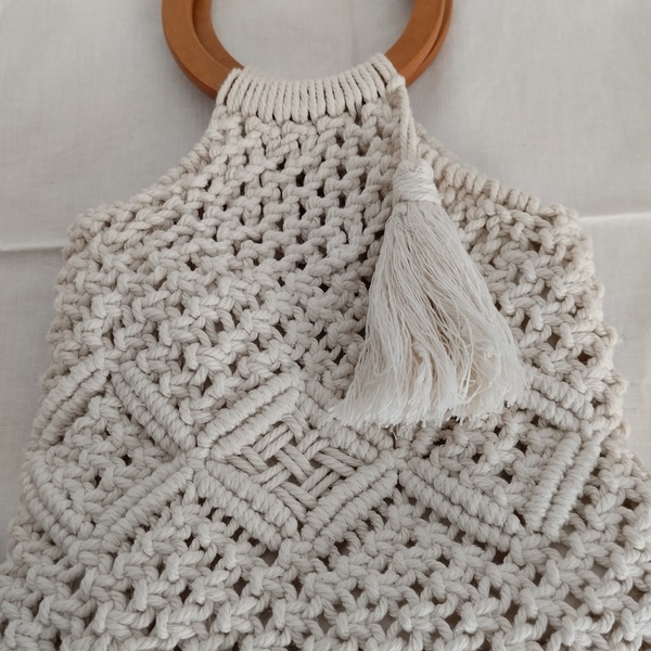 Αυτή η όμορφη και βολική τσάντα μακραμέ είναι ιδανική για όλες τις ώρες της ημέρας. Κατασκευασμένη από ειδικό βαμβακερό κορδόνι κατάλληλο για μακραμέ, είναι ανθεκτική και πλένεται εύκολα στο πρόγραμμα των βαμβακερών χωρίς να παθαίνει τίποτα.