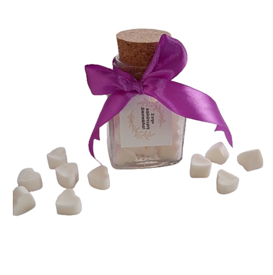 Γυάλινο τετράγωνο βαζάκι 5χ5εκ. (το γυαλί) με πώμα φελλού και 30τμχ χειροποίητα wax melts μίνι λευκές καρδιές.