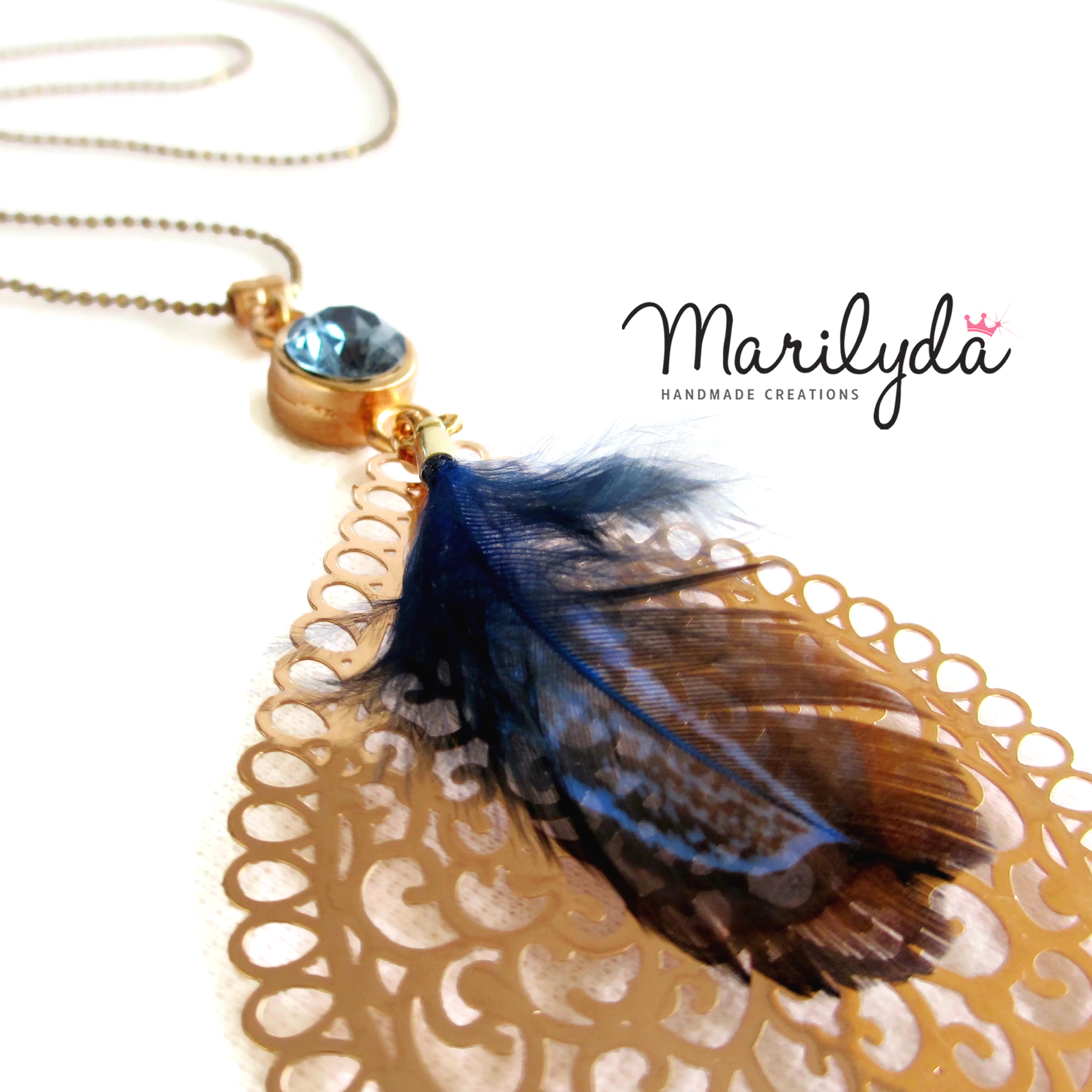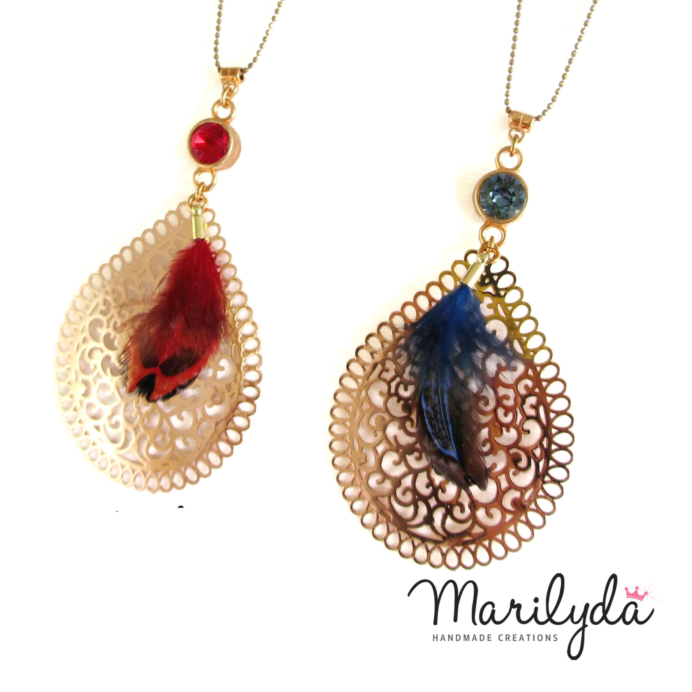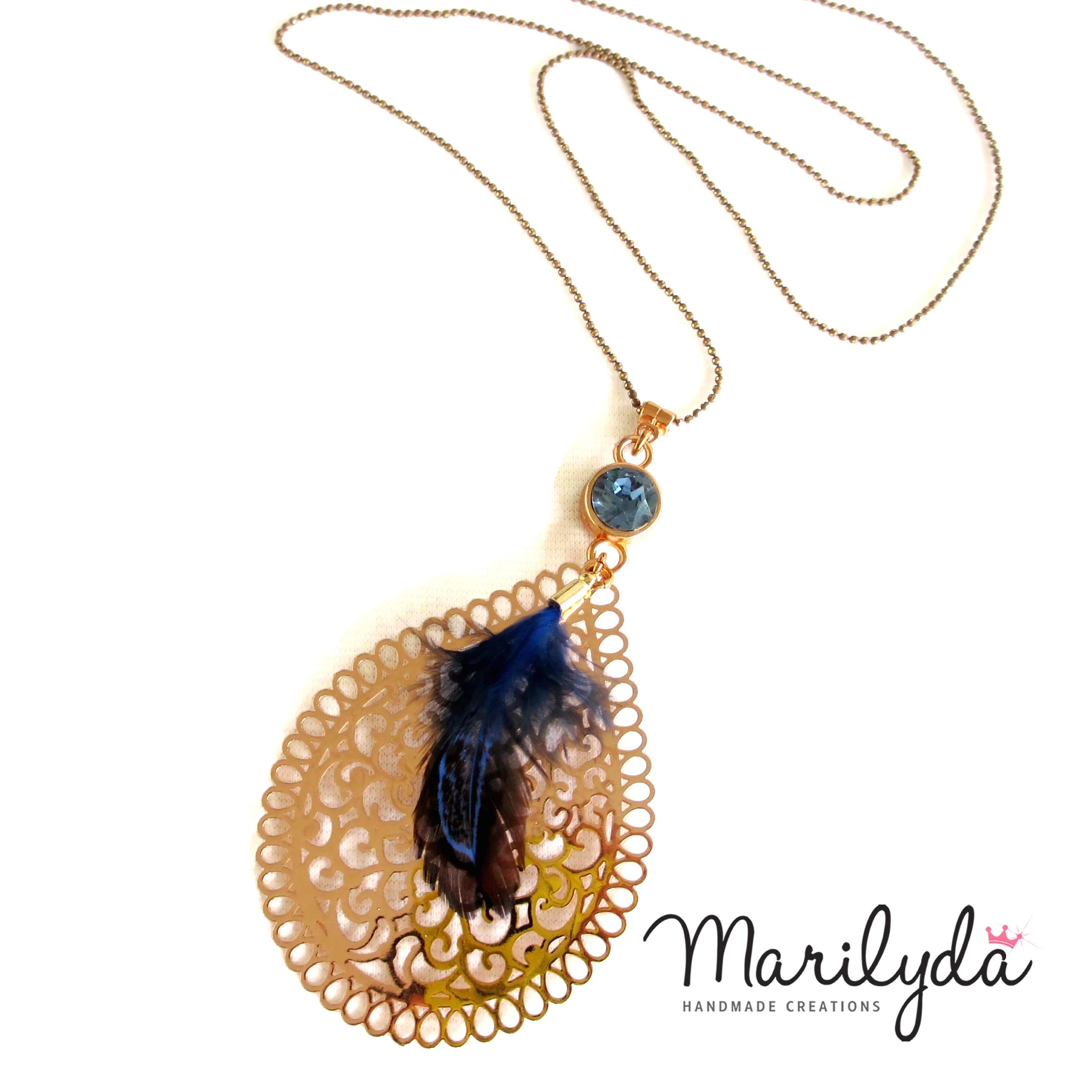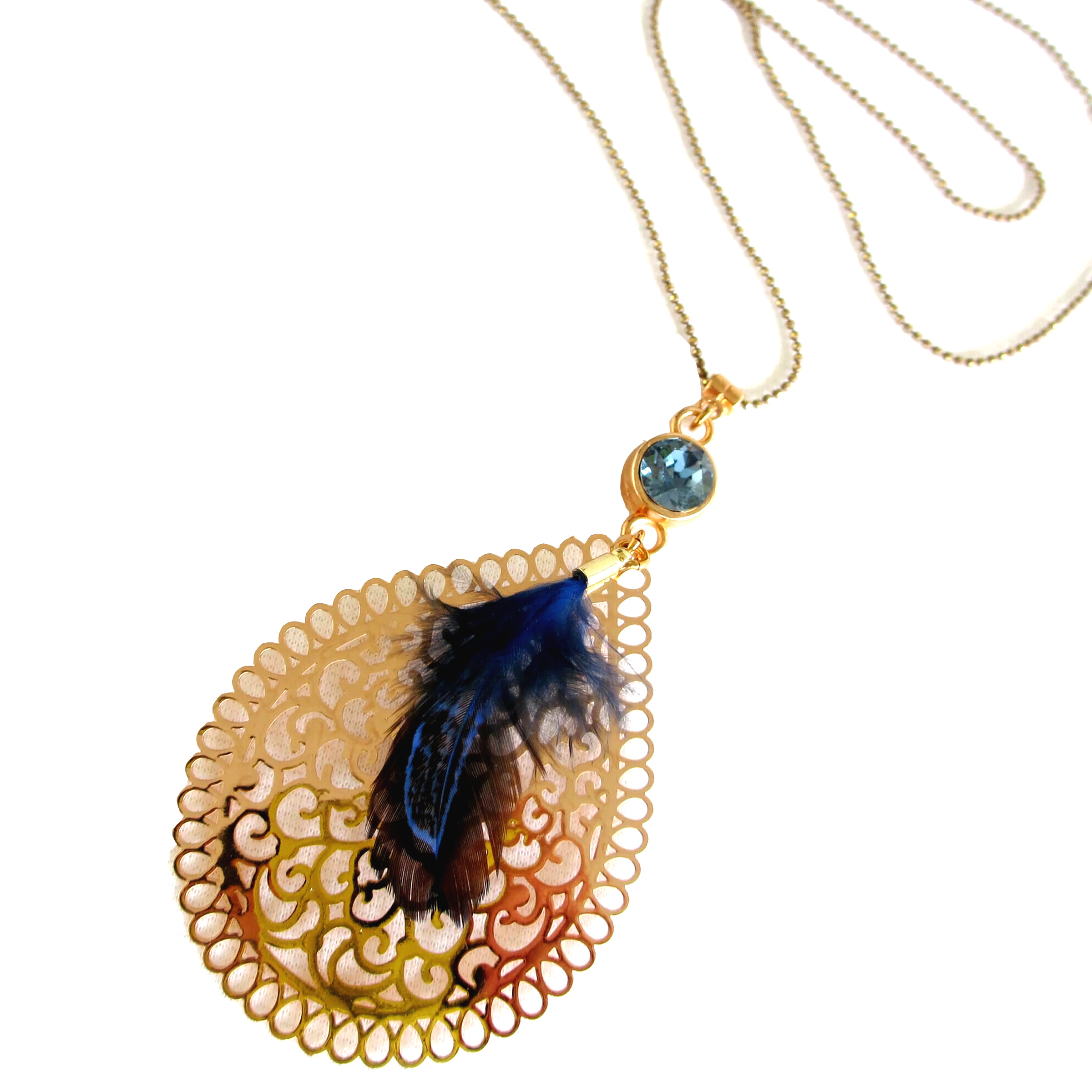 Ιδιαίτερο κολιέ με κρύσταλλο Swarovski, επιχρυσωμένο filigree rose gold σε σχήμα δάκρυ και ιδιαίτερο φτερό πετεινού σε δύο απίθανα χρώματα!