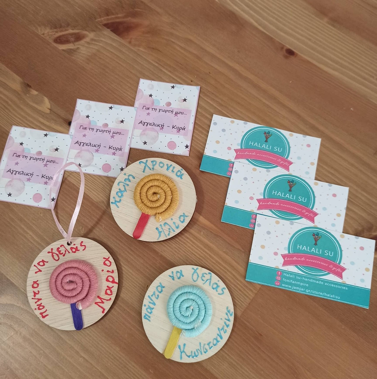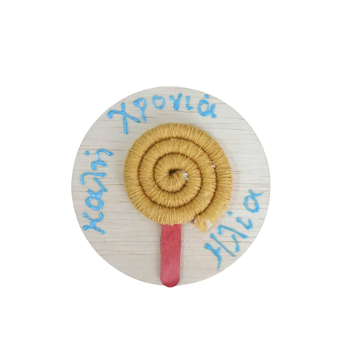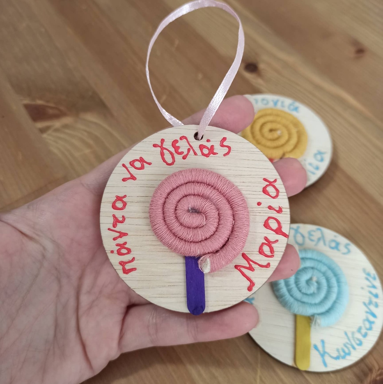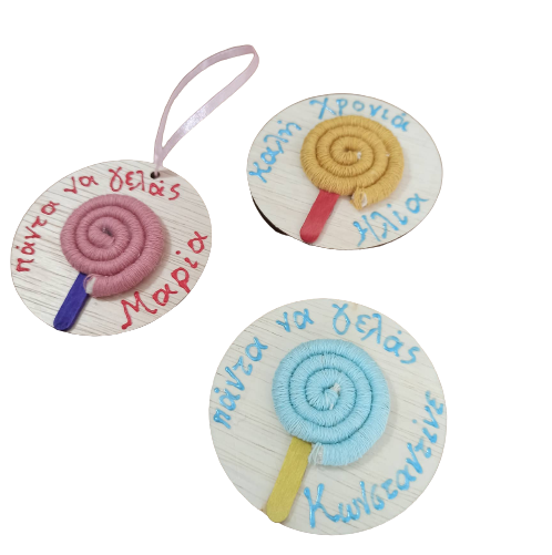 -μαγνητάκι με μακραμέ γλειφιτζουράκι σε ξύλινη βάση σε διάφορους συνδυασμούς χρωμάτων, ευχή και όνομα
