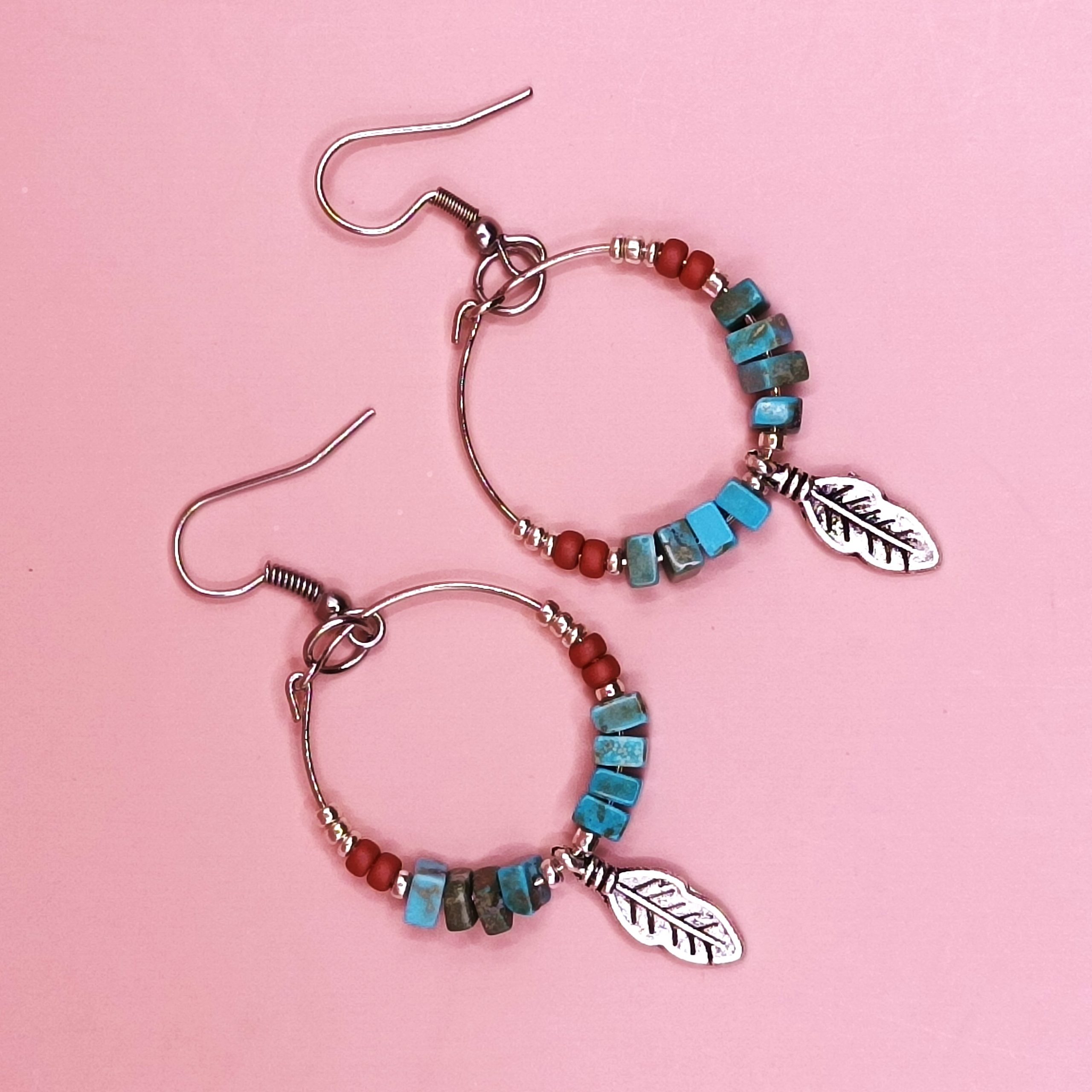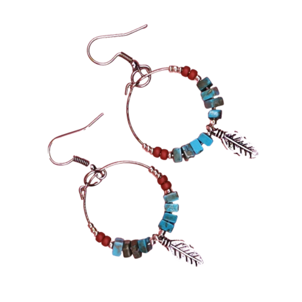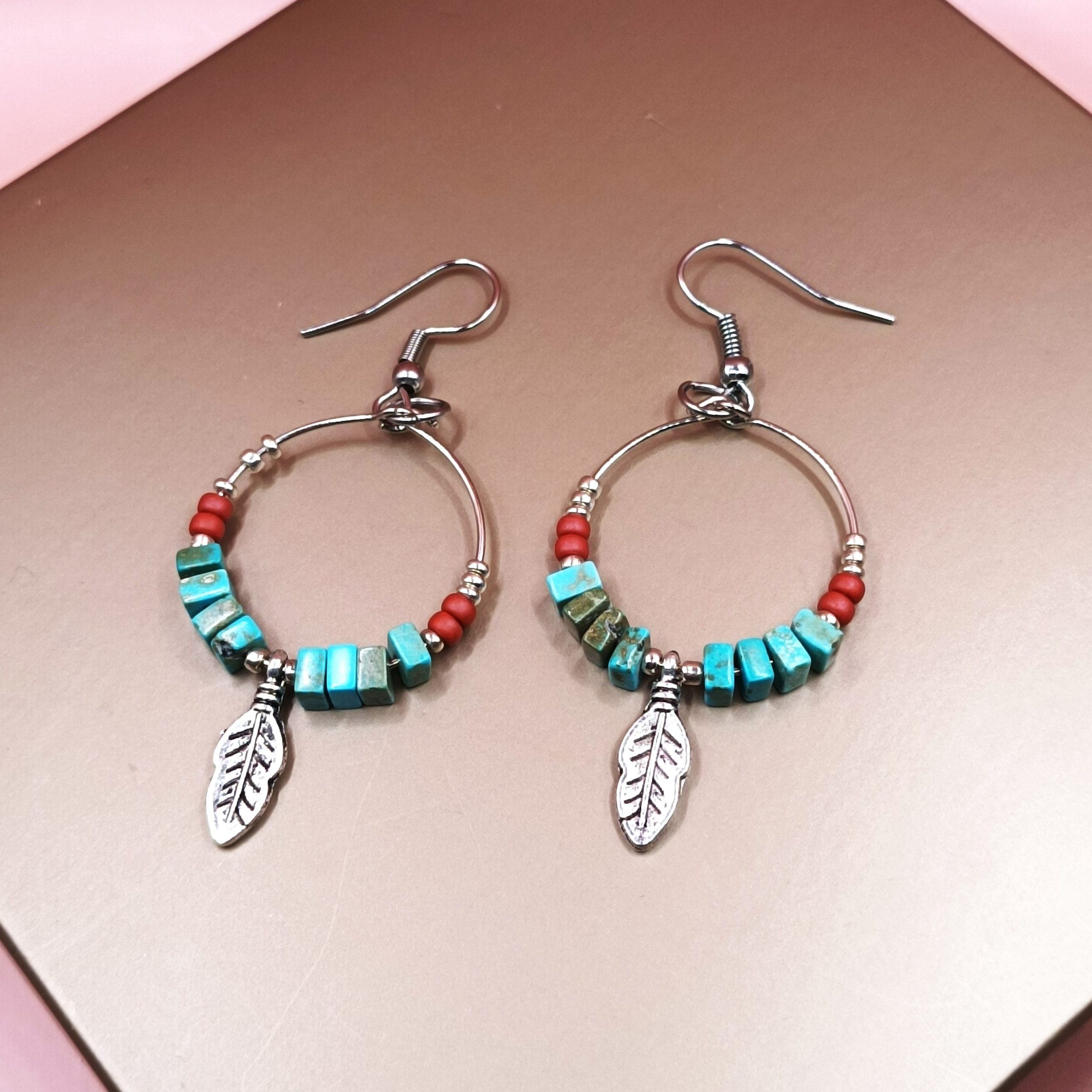 Σκουλαρίκια κρίκοι κρεμαστοί με ημιπολύτιμους λίθους τυρκουάζ και μεταλλικό φυλλαράκι. Γάντζος ατσάλινος. Συνολικό ύψος 6εκ.