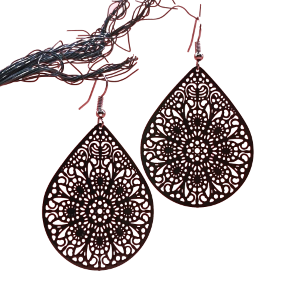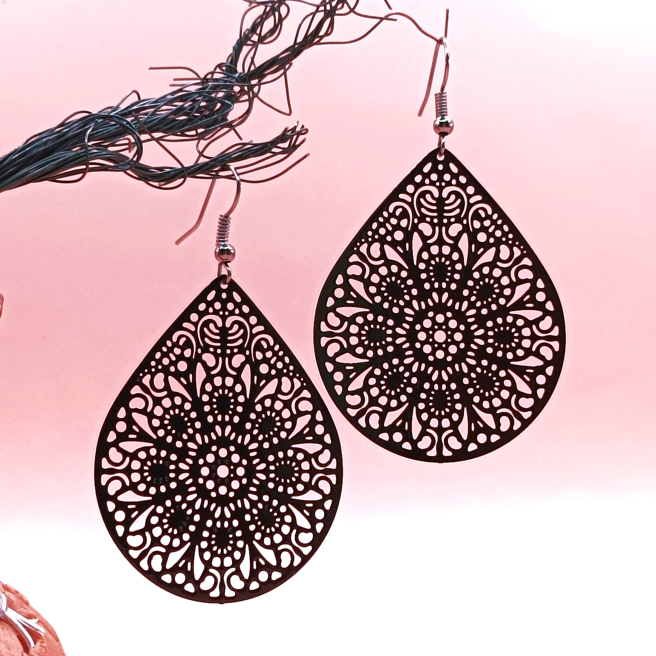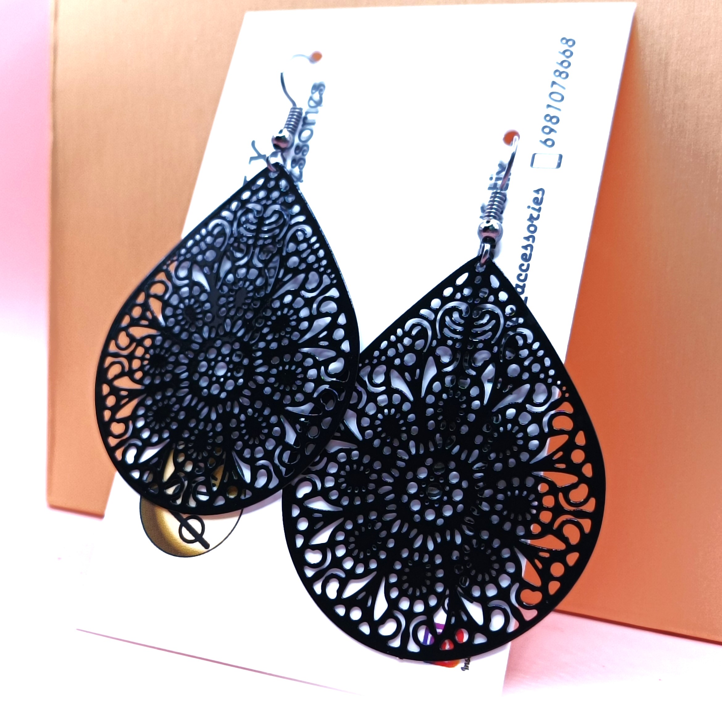 Boho μεγάλα σκουλαρίκια με μαύρο μεταλλικό φιλιγκρί (ελαφρύ διάτρητο μεταλλικό στοιχείο) σε γάντζο.