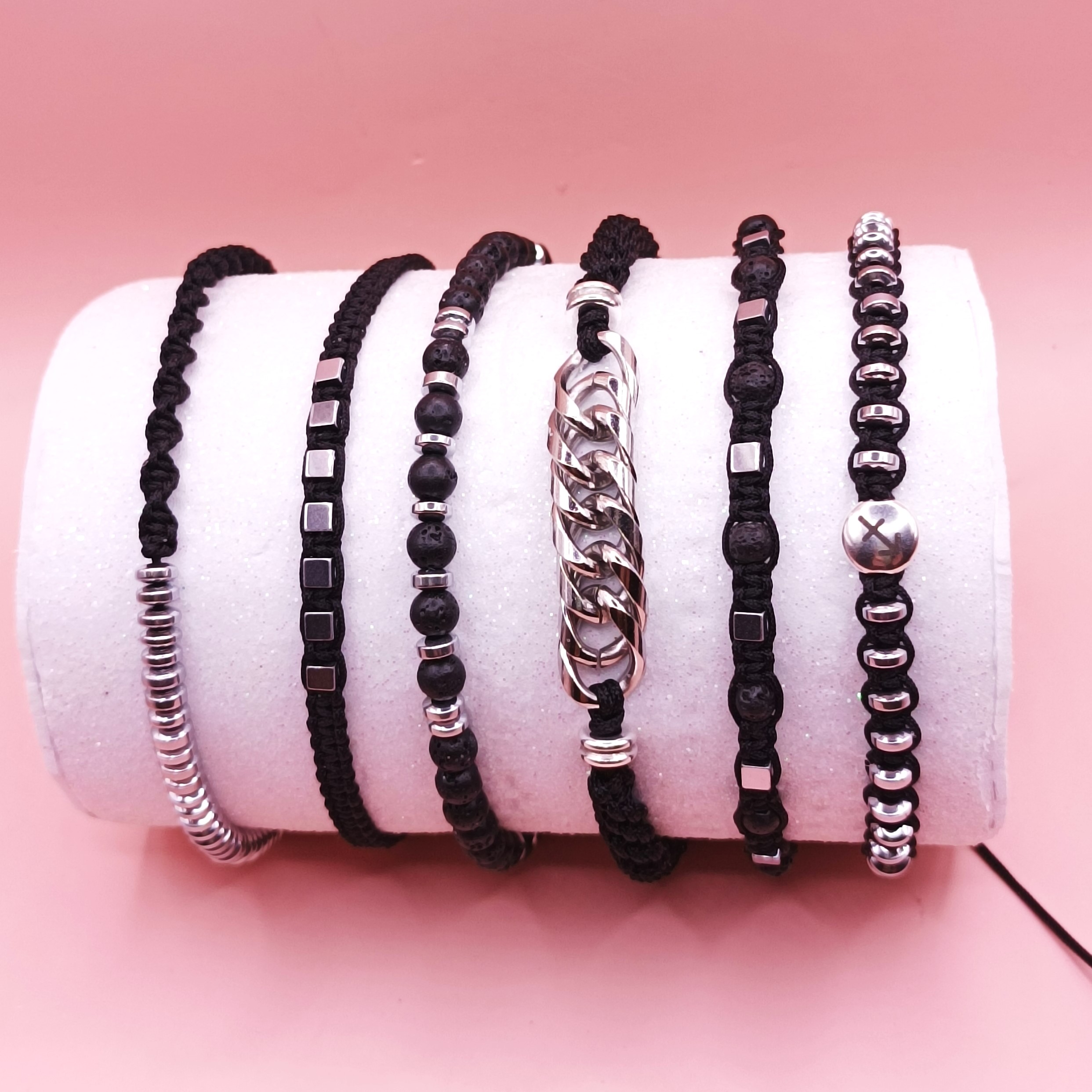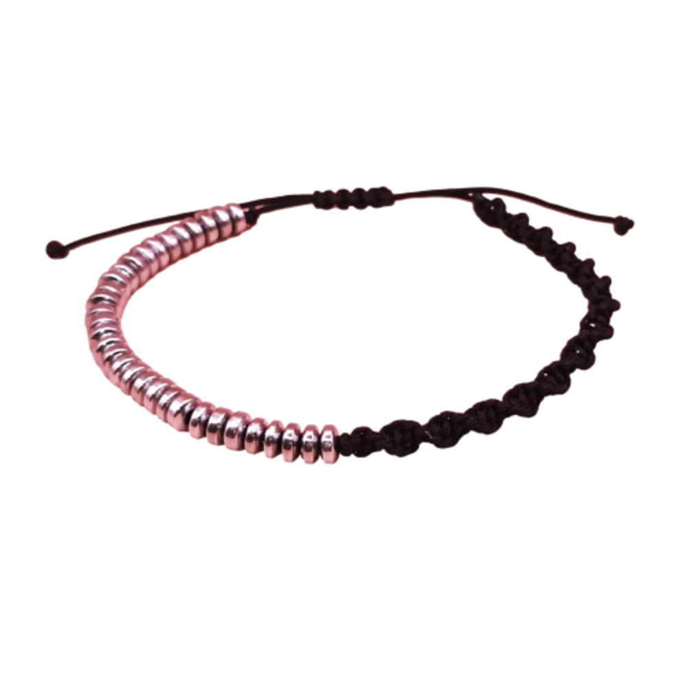 Ανδρικό βραχιόλι με ημιπολύτιμους λίθους αιματίτη σε ροδέλες και πλεκτό κορδόνι σε DNA (στριφτό) πλέξιμο μακραμέ. Ρυθμιζόμενο μήκος.