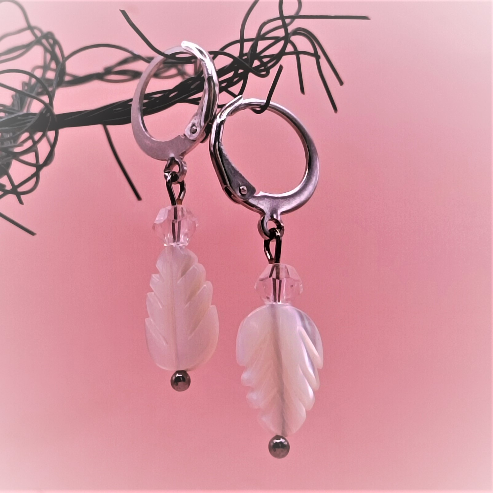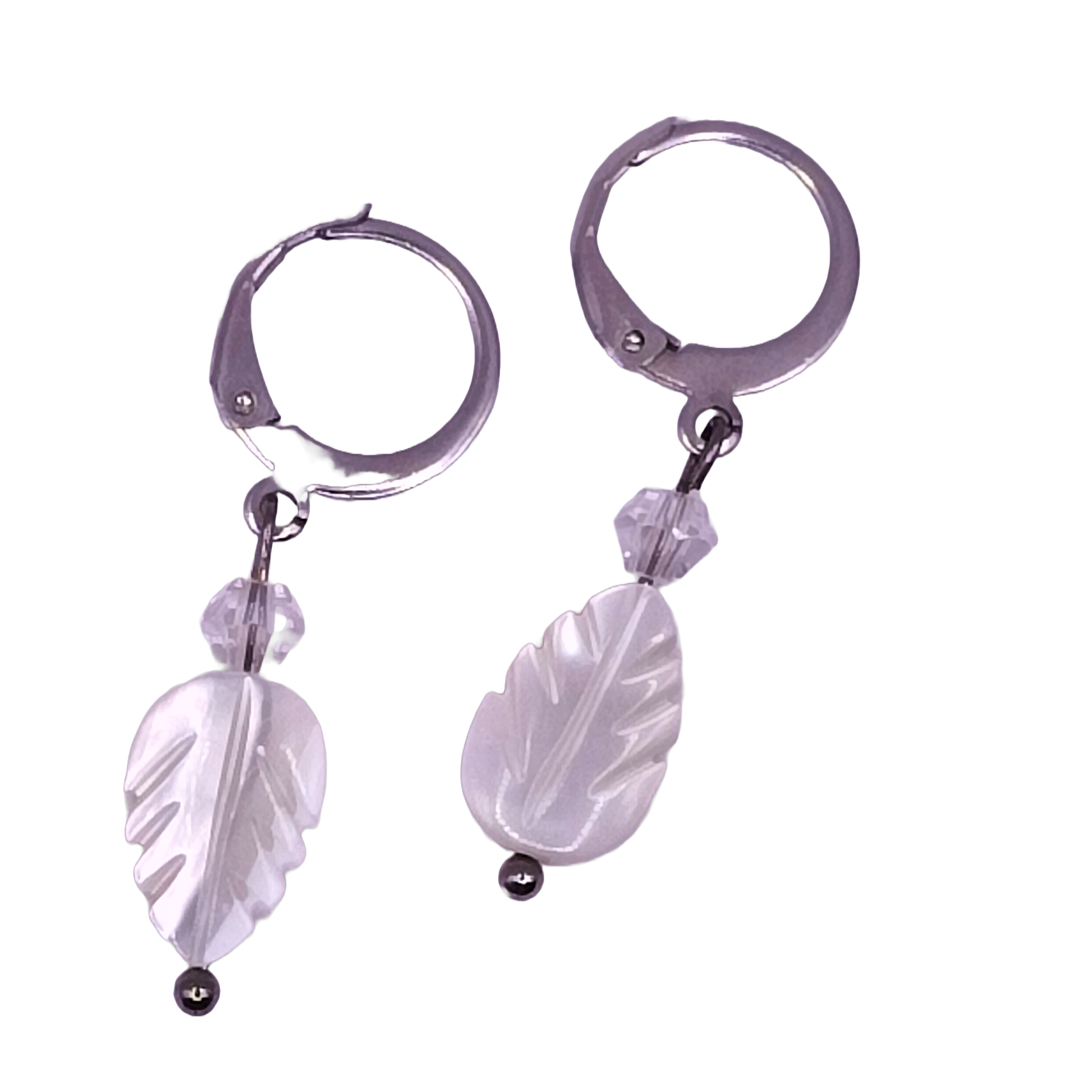 Φύλλο φίλντισι λευκό περλέ και κρυσταλλάκια Swarovski ιριδίζοντα με μοναδική λάμψη, σε ανοιγόμενο κρικάκι ατσάλινο αντιαλλεργικο.