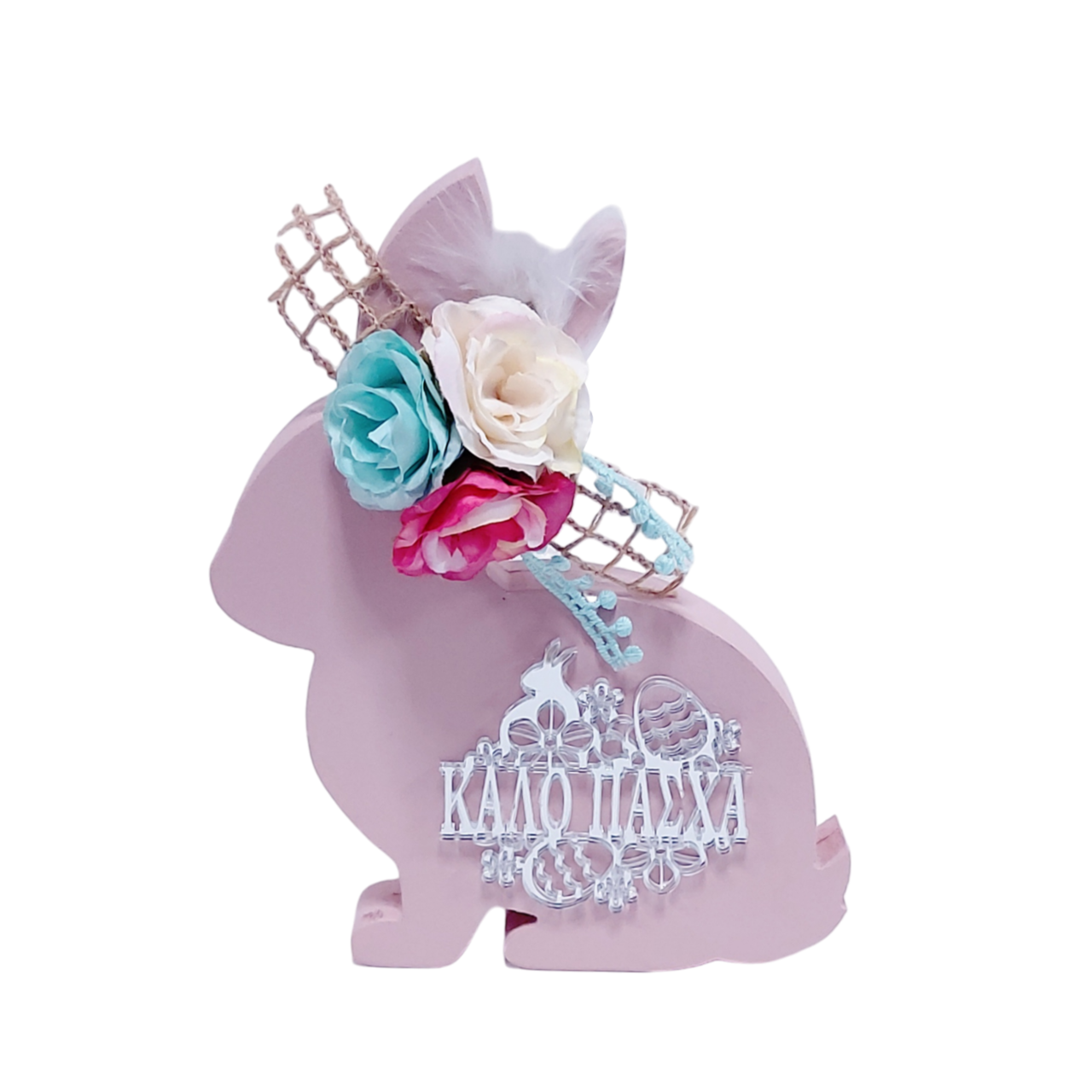 Πασχαλινός ξύλινος διακοσμητικός λαγός 15 εκ με πλέξιγκλας στοιχείο και λουλούδια.