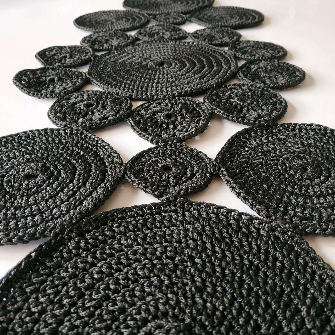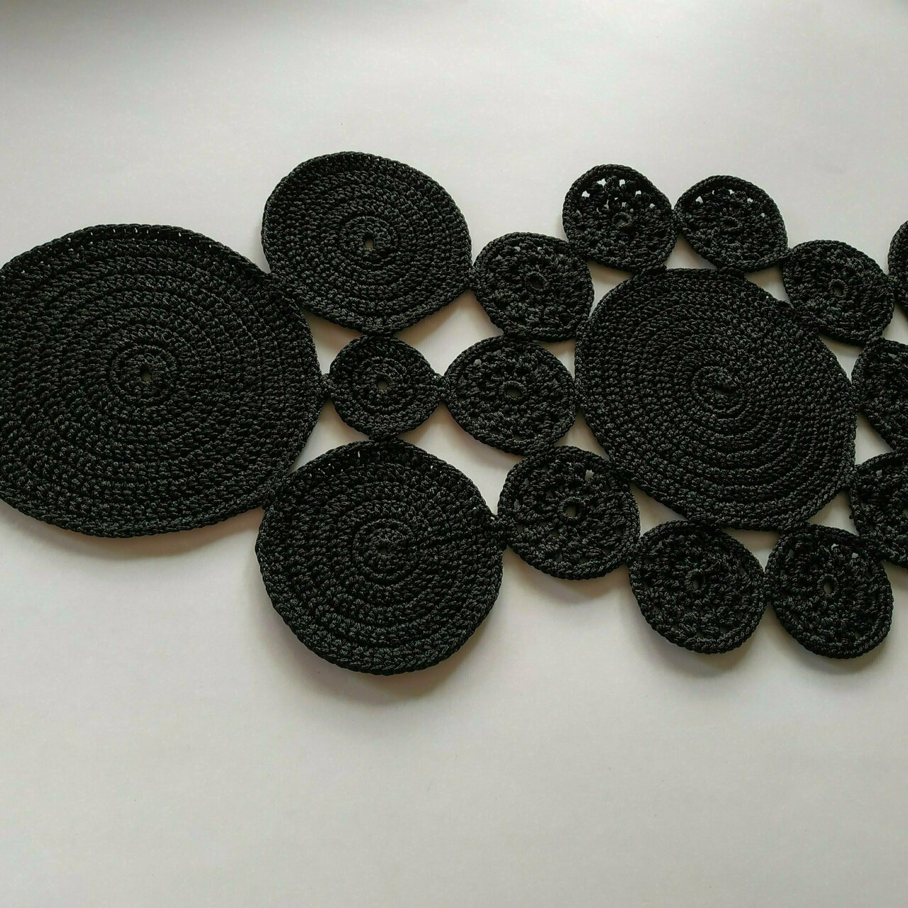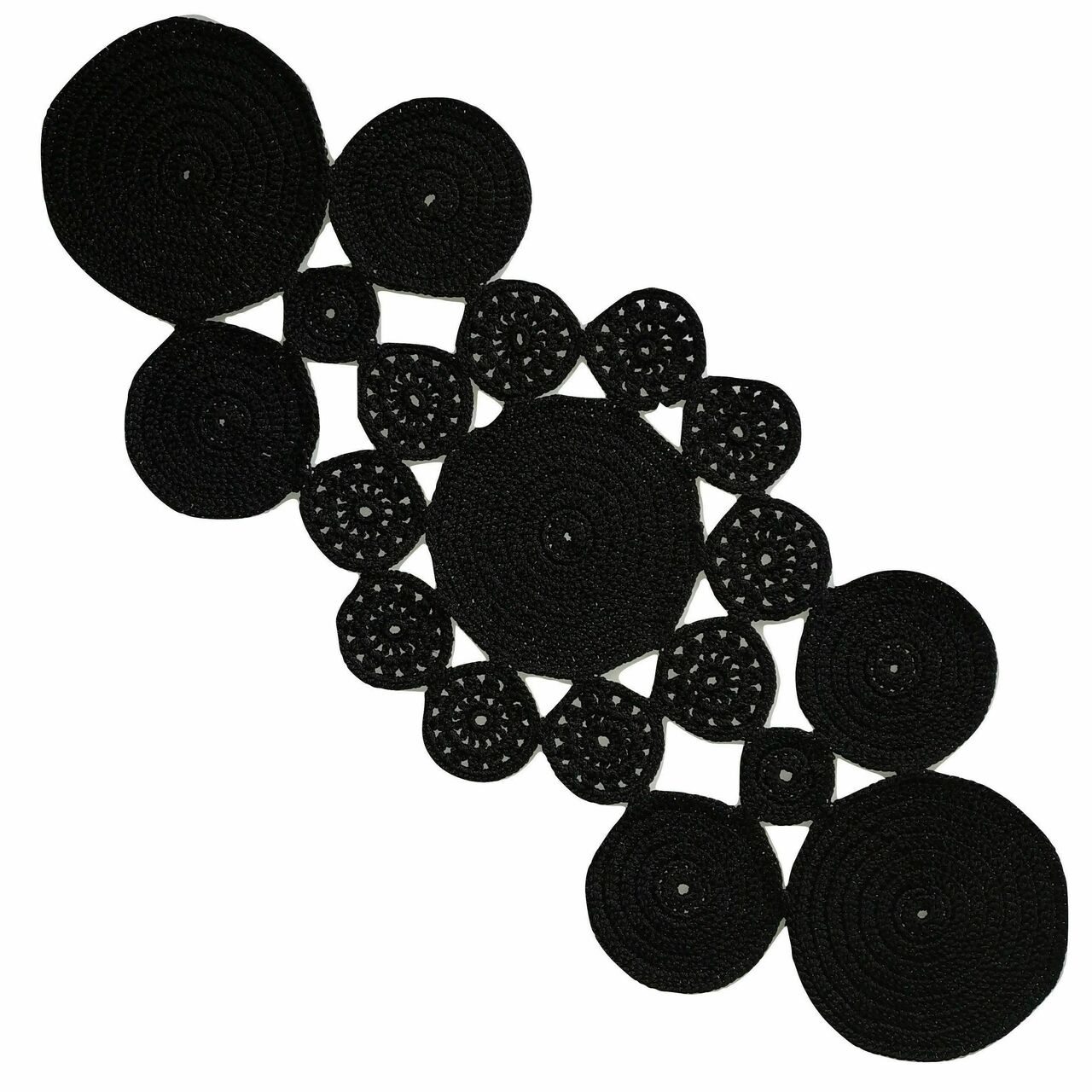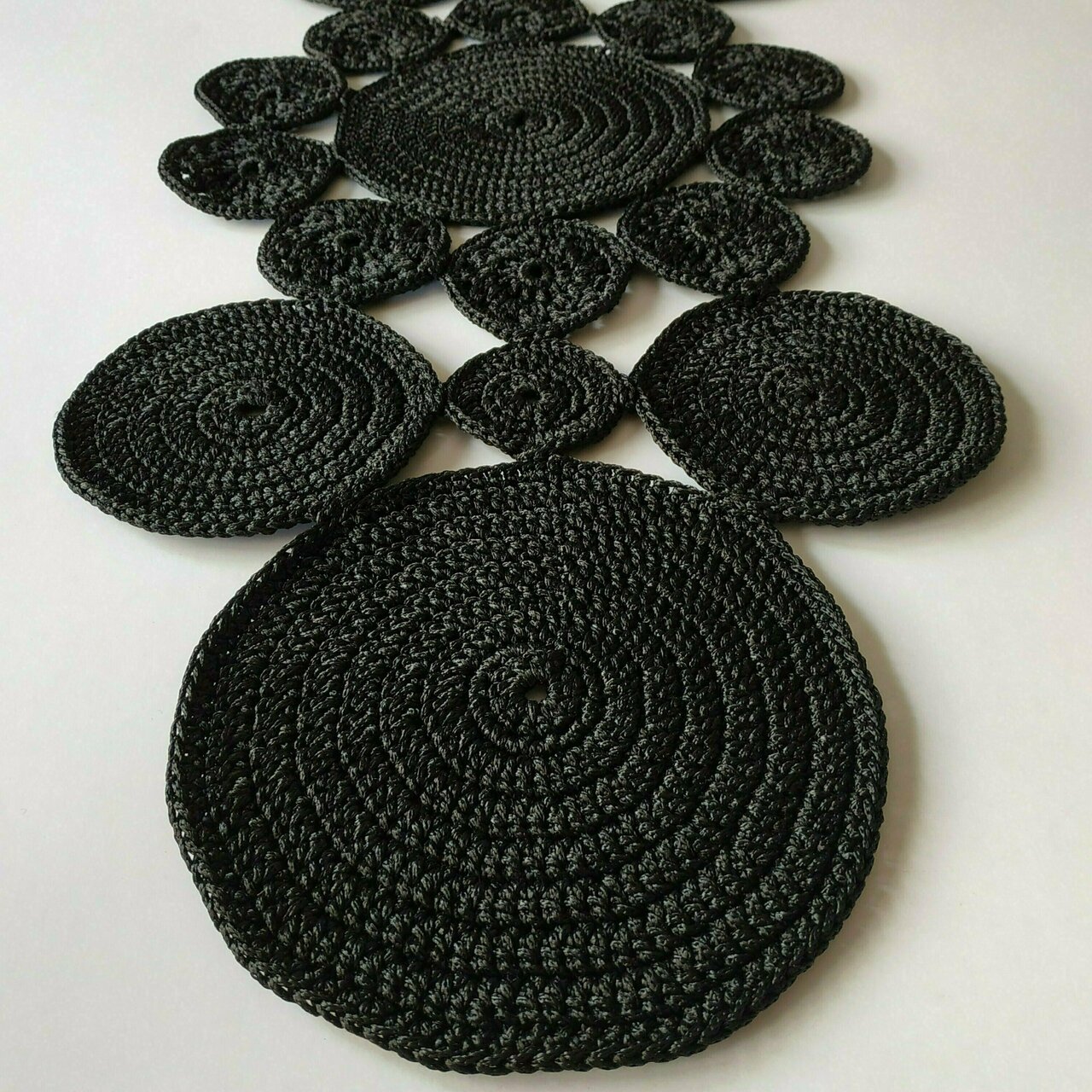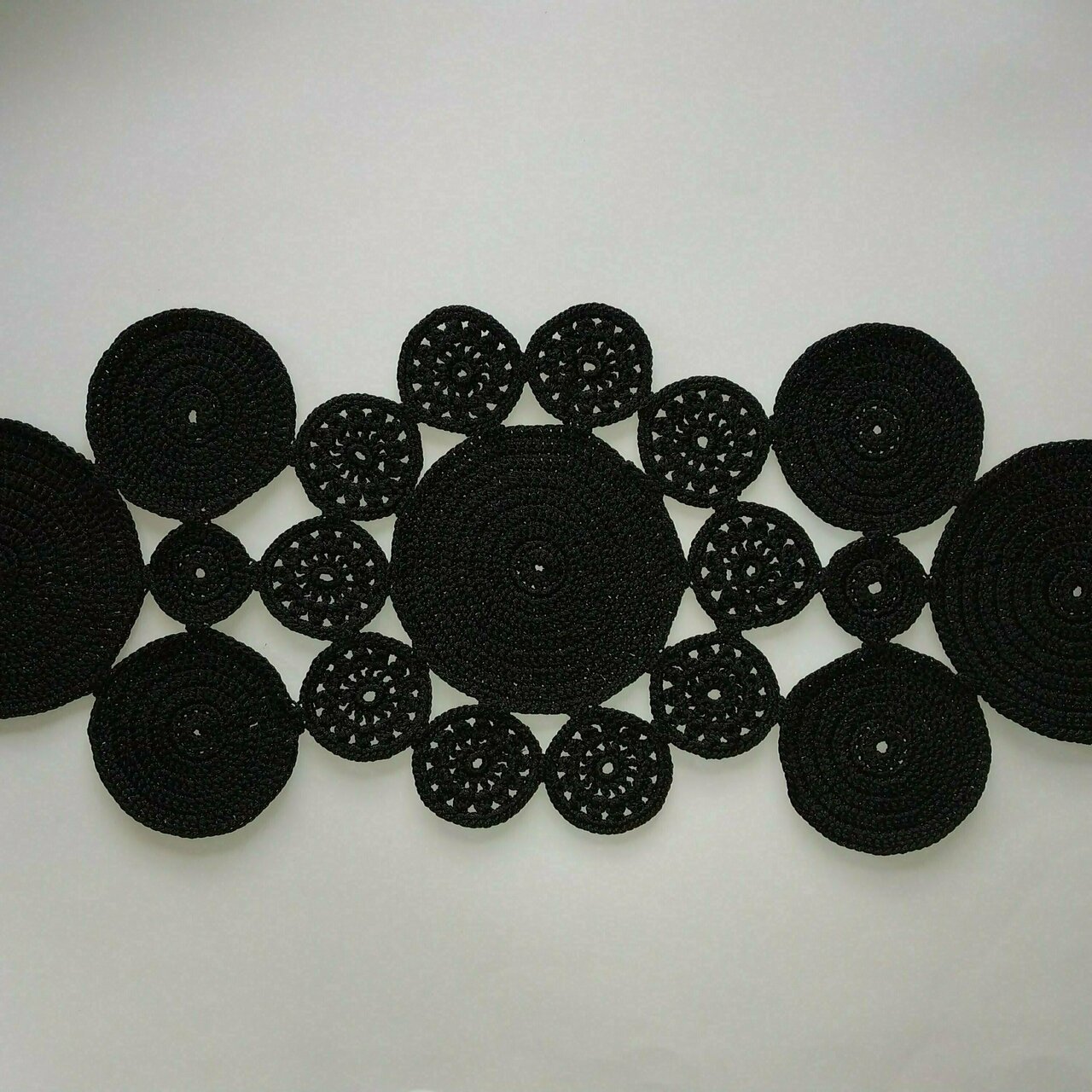 Ένα μοντέρνο ράνερ για το τραπέζι σας σε μαύρο χρώμα, πλεγμένο με το βελονάκι. Το νήμα μακραμέ που χτησιμποιήθηκε, του δίνει μια μοντέρνα νότα. Αποτελεί νέα τάση της μόδας.