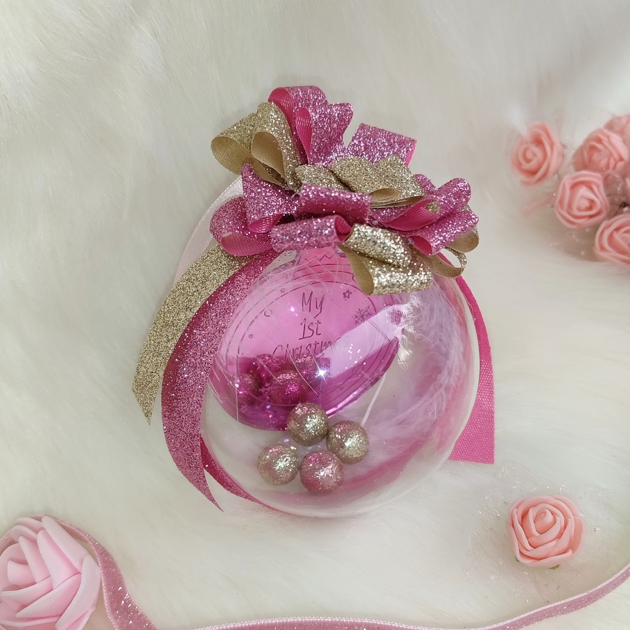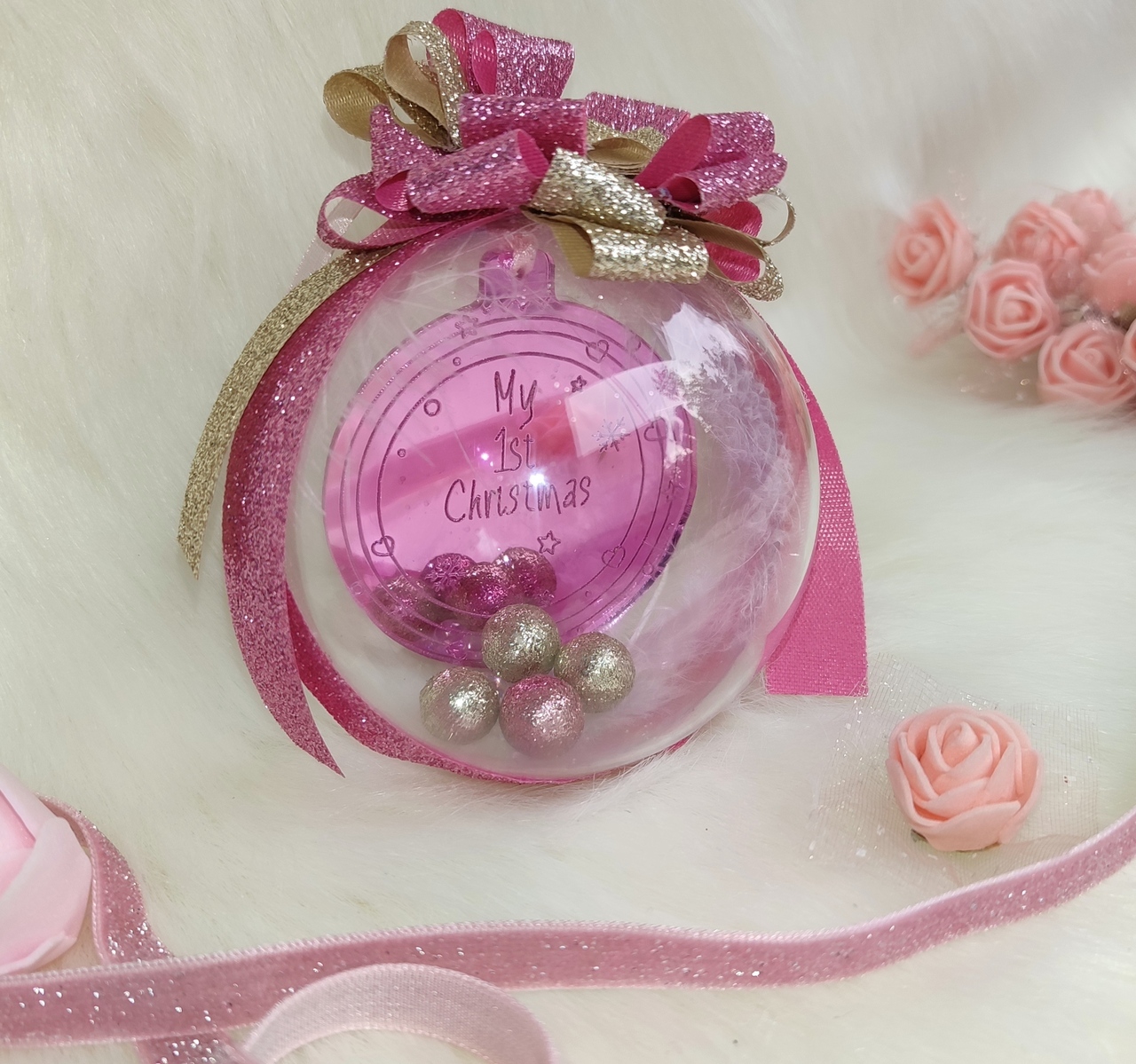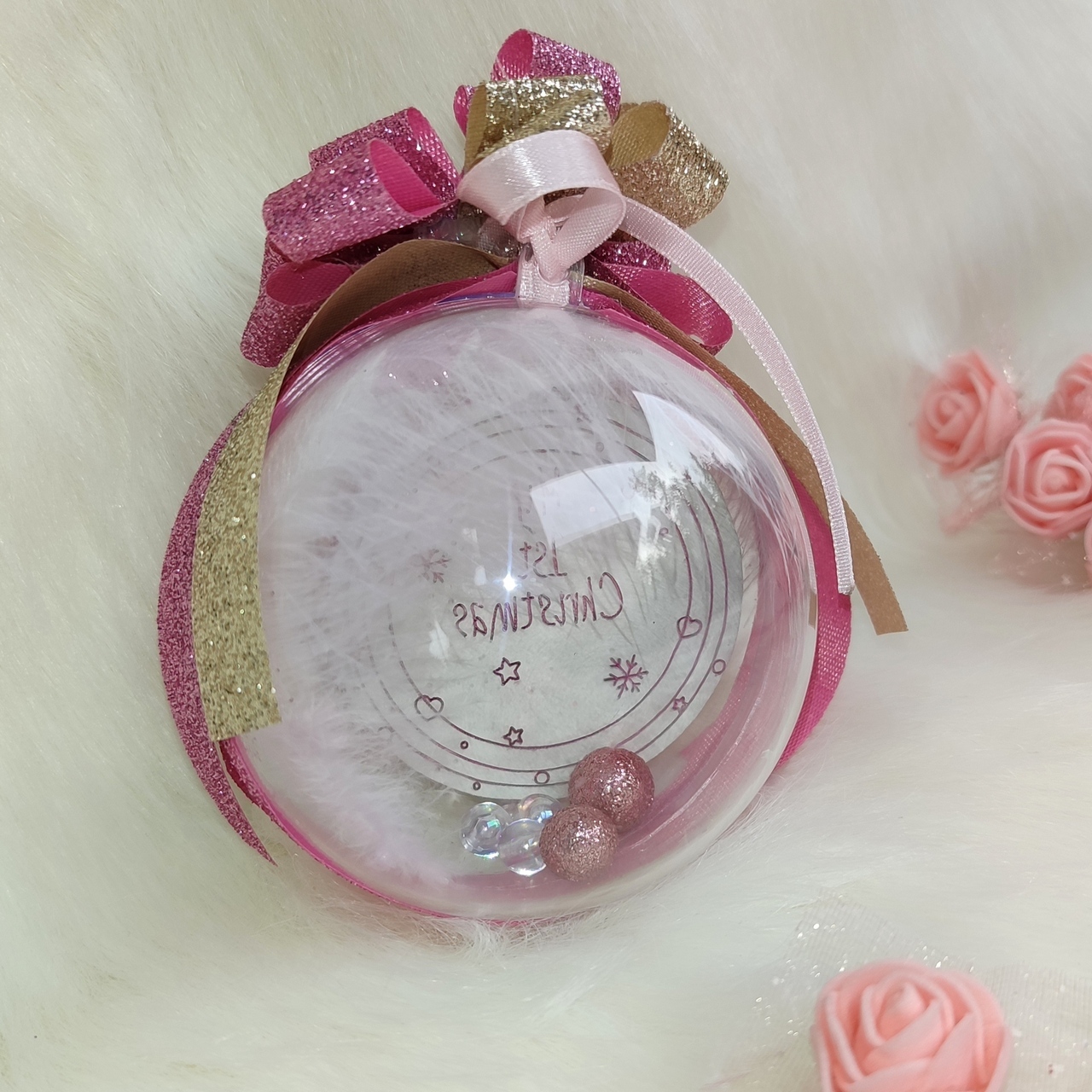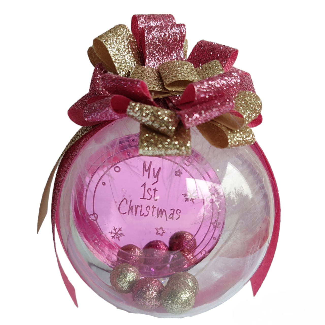 Χειροποίητη χριστουγεννιάτικη διαφανής μπάλα με έντονο ροζ plexi στολίδι που γράφει “My 1st Christmas”.