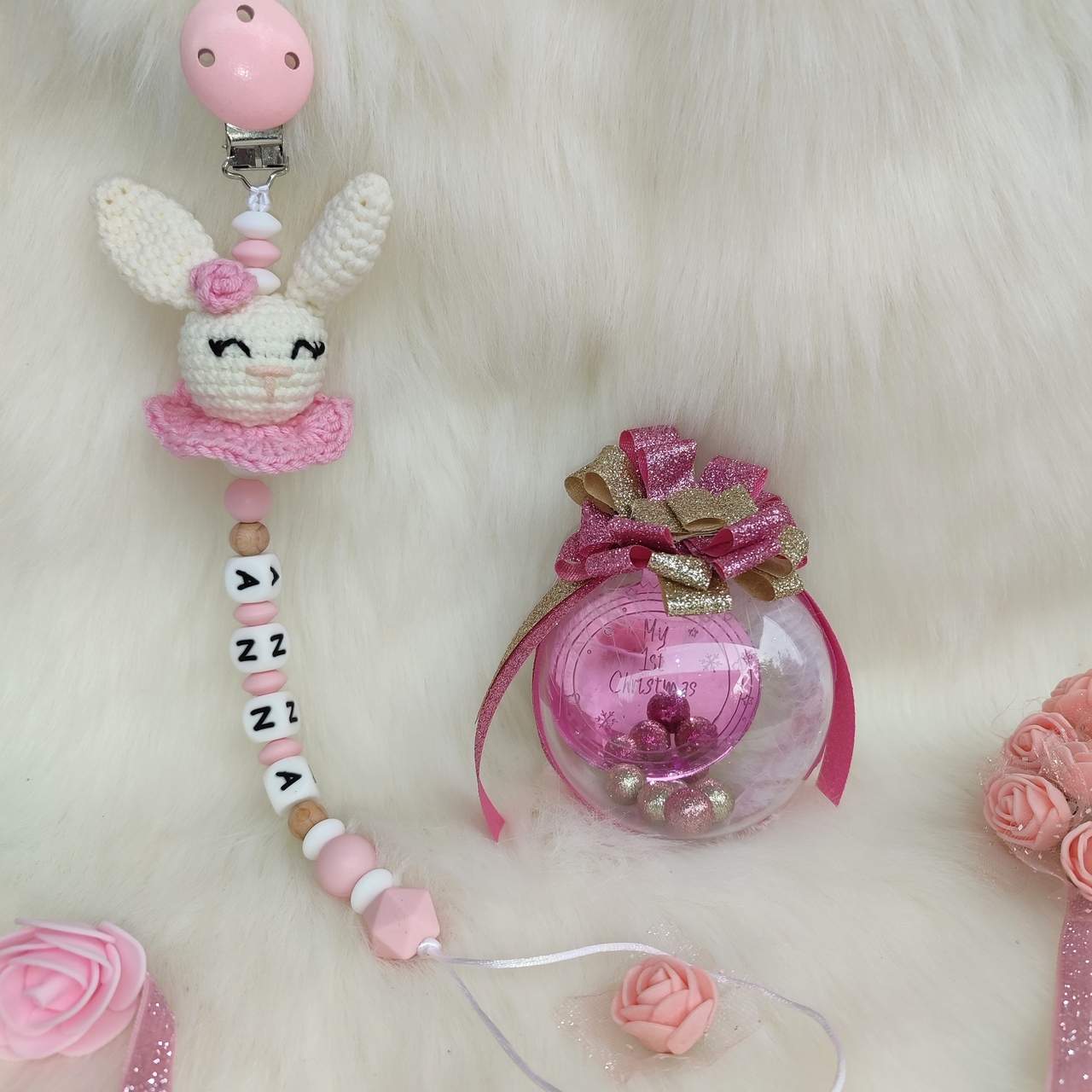 Μπορεί να γίνει ένα υπέροχο σετ δώρου μαζί με ροζ κλιπ πιπίλας πλεκτό λαγουδάκι με όνομα ή χωρίς, όπως φαίνεται στην τελευταία φωτογραφία.