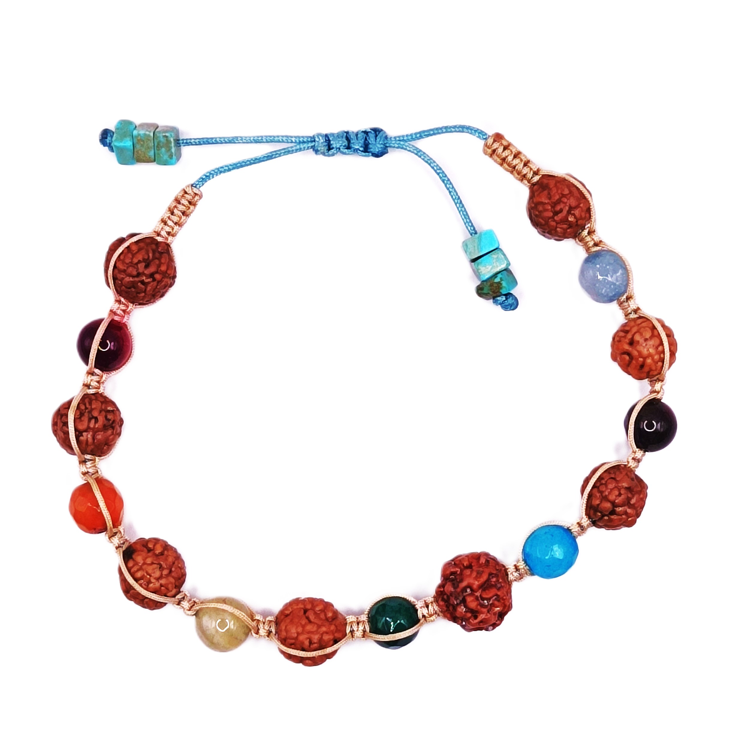 Βραχιόλι με καρπούς Rundraksha από ιερό δέντρο του Νεπάλ. Ονομάζονται αλλιώς «τα δάκρυα του Σίβα» και προσφέρουν προστασία, καλοτυχία, υγεία, πλούτο. Αχάτης στα 7 χρώματα των Τσάκρα για ισορροπία. Ρυθμιζόμενο μήκος.