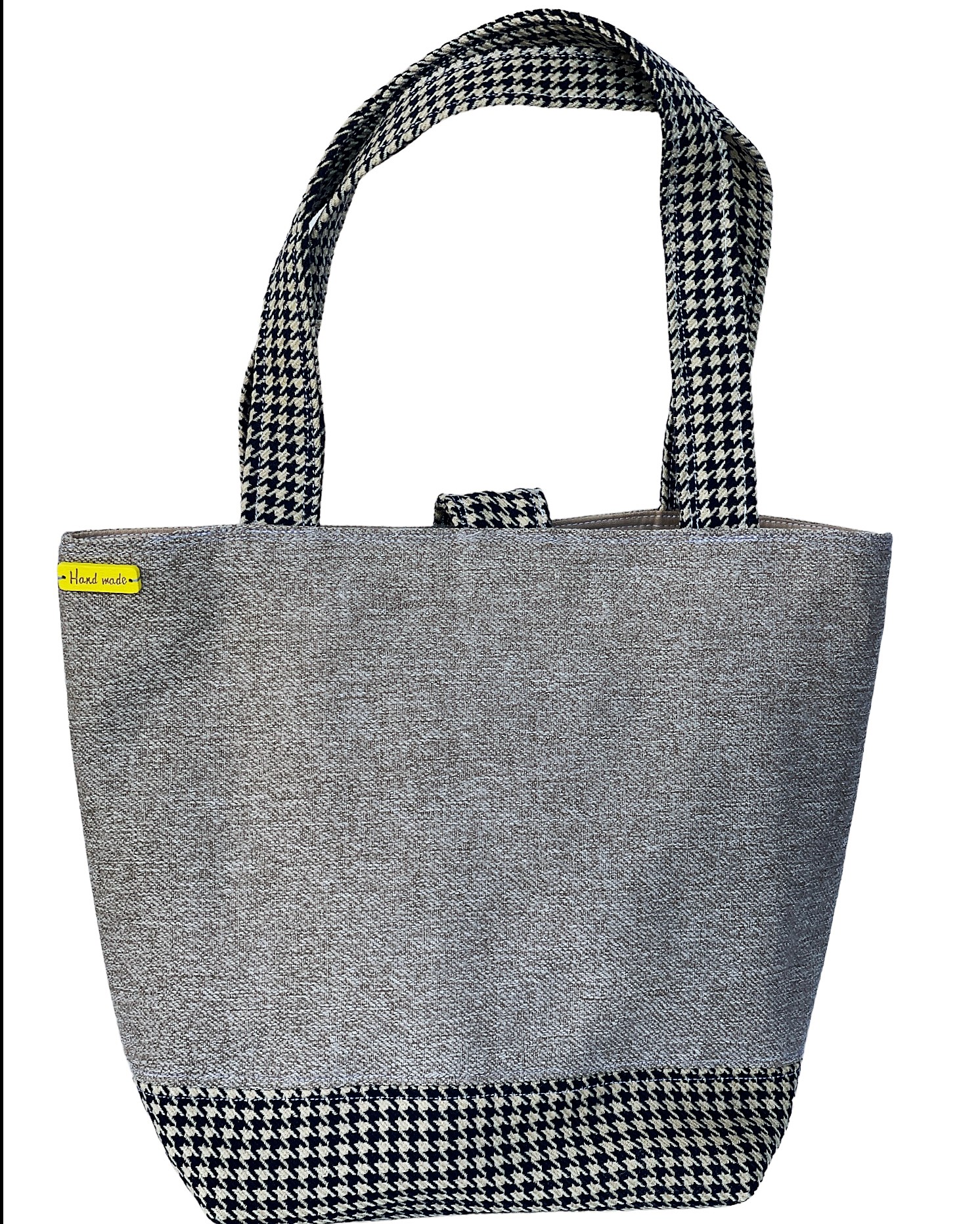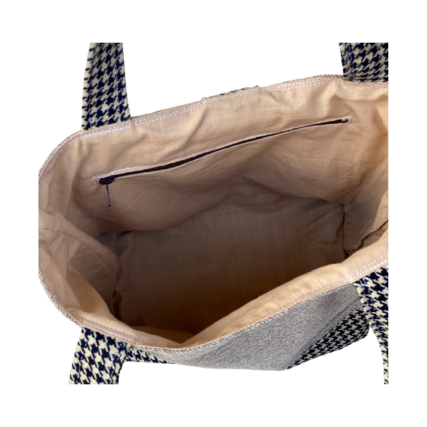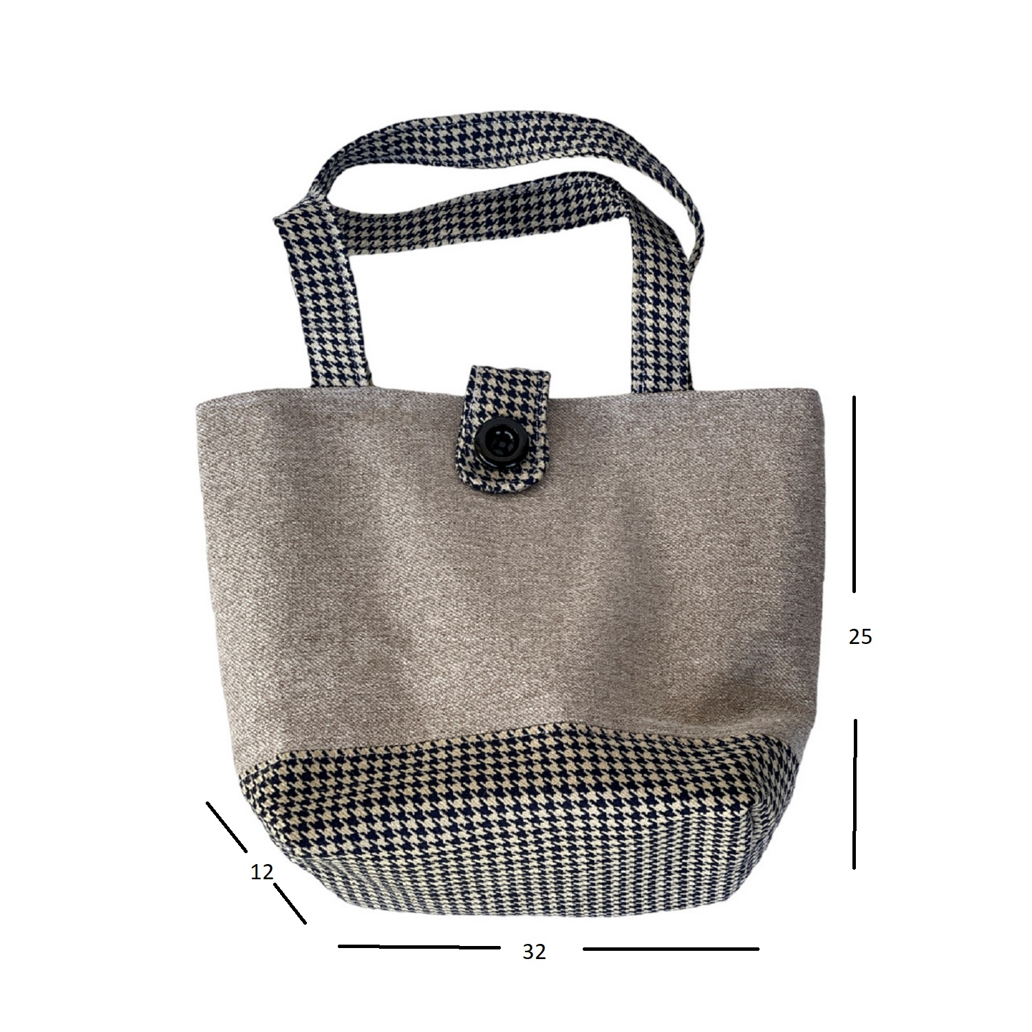 Μοναδική κομψή χειροποίητη τσάντα tote χειρός με φαρδύ πάτο, μαγνητικό κούμπωμα και διακοσμητικό μεγάλο μαύρο κουμπί. Η βάση και τα λουράκια είναι από συνθετικο μάλλινο ύφασμα μαύρο με μπεζ ενώ το επάνω μέρος είναι από ύφασμα χρώματος μελί-μπεζ. Έχει ελαφριά ενίσχυση και εσωτερικά είναι επενδεδυμένη με 100% βαμβακερό ύφασμα και έχει μια τσέπη που κλείνει με φερμουάρ.