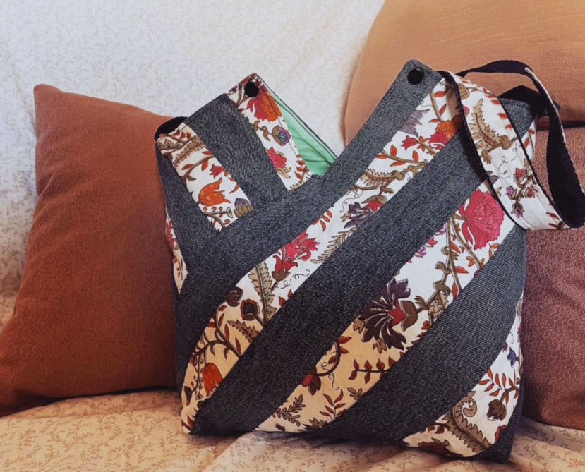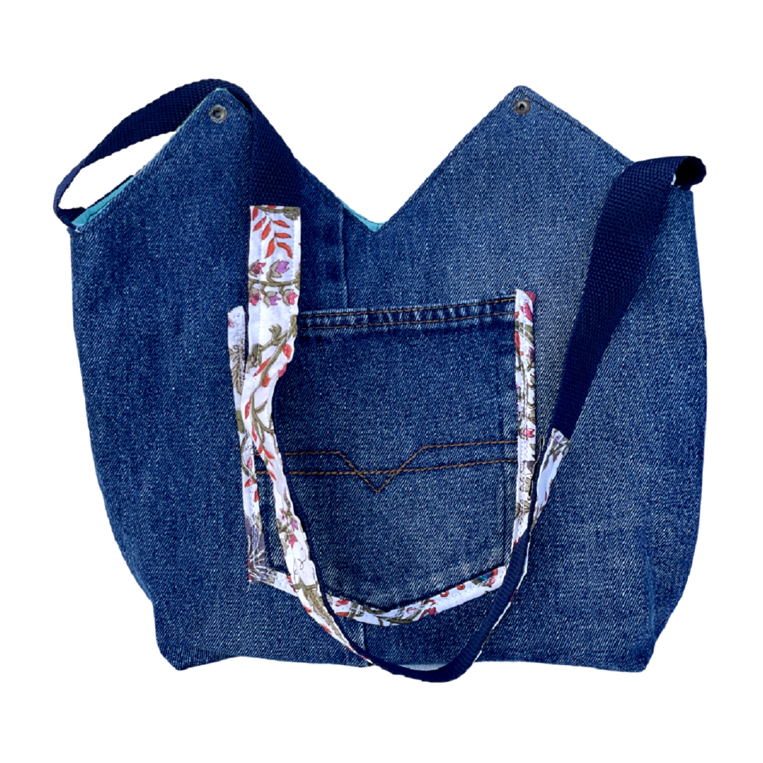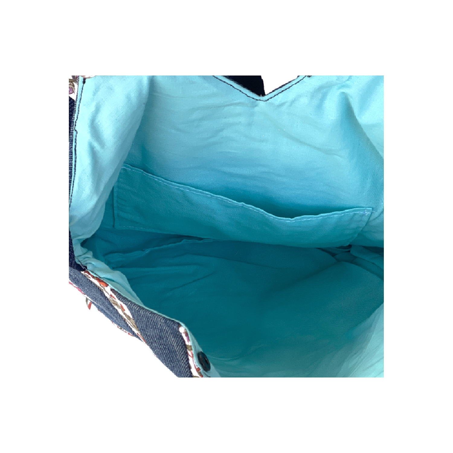 Μοναδική μεγάλη χειροποίητη υφασμάτινη τσάντα tote ώμου από τζιν και βαμβακερό φλοραλ ύφασμα στην μπροστινή όψη και τζιν στην πίσω όψη. Έχει μαλακή ενίσχυση και μεγάλη τζιν τσέπη με φλοράλ ρέλι πίσω.