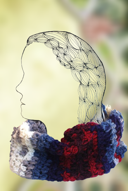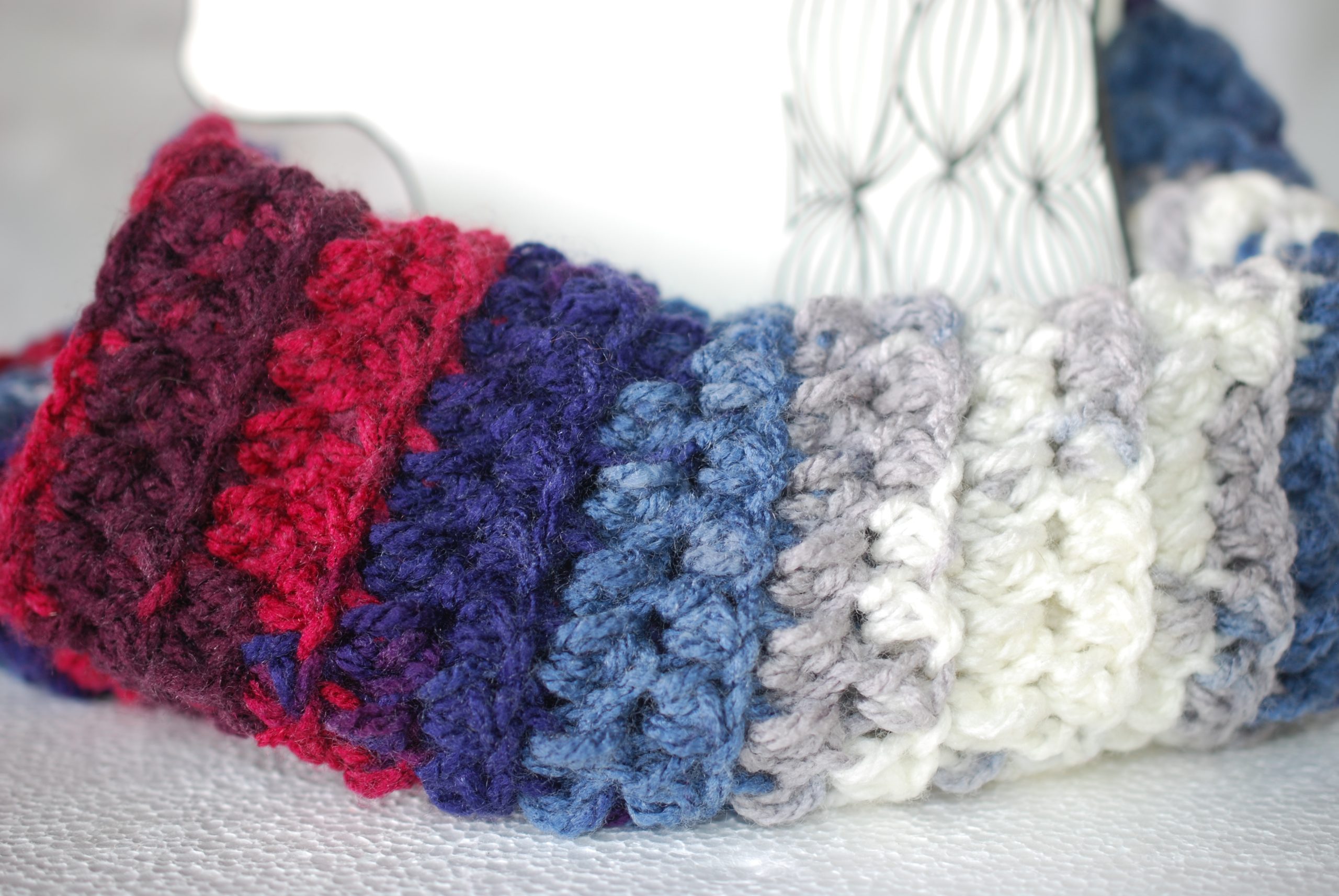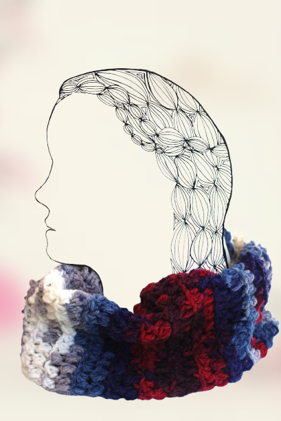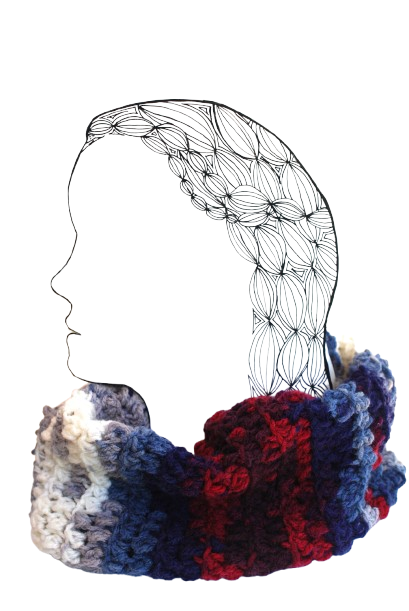 Χειροποίητος πλεκτός γιακάς σε αποχρώσεις του μπορντό, μπλε, λευκό και γκρι, πλεγμένος με το βελονάκι και συνθετικό νήμα. Είναι unisex και ταιριάζει σε όλες τις ηλικίες.