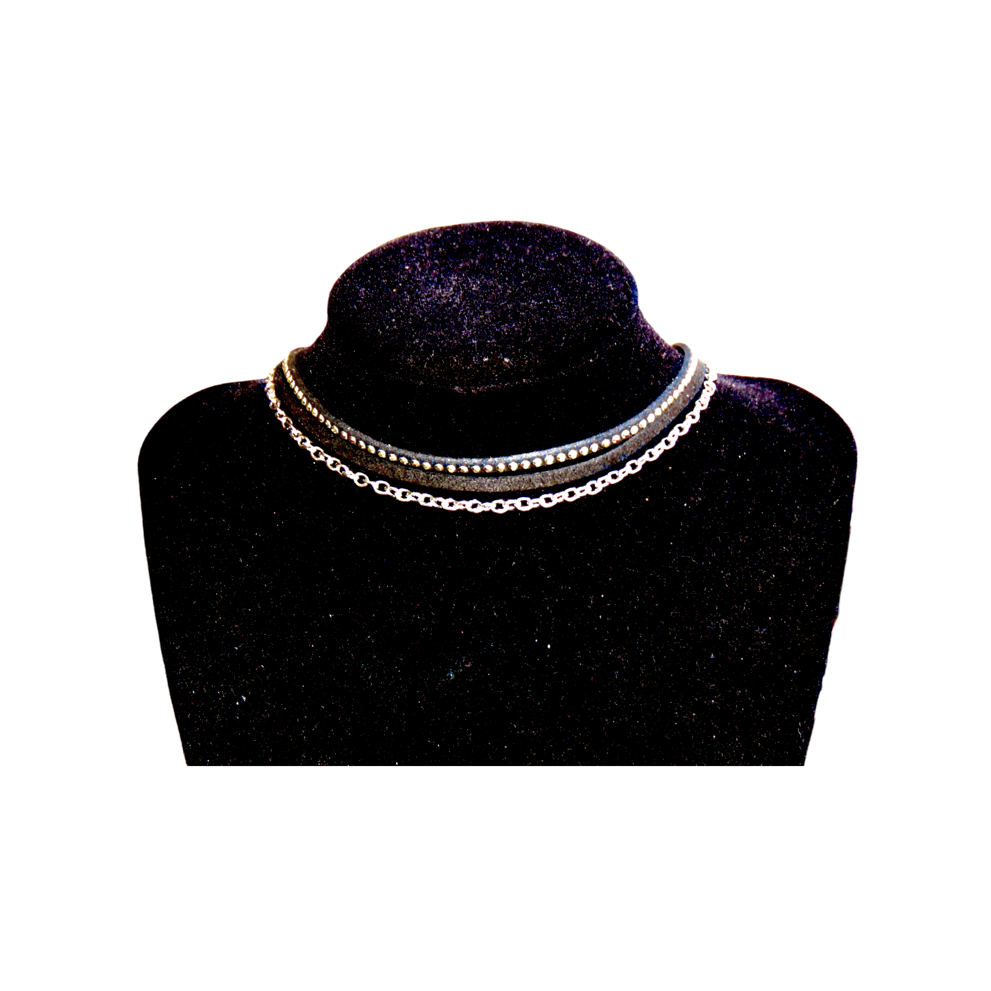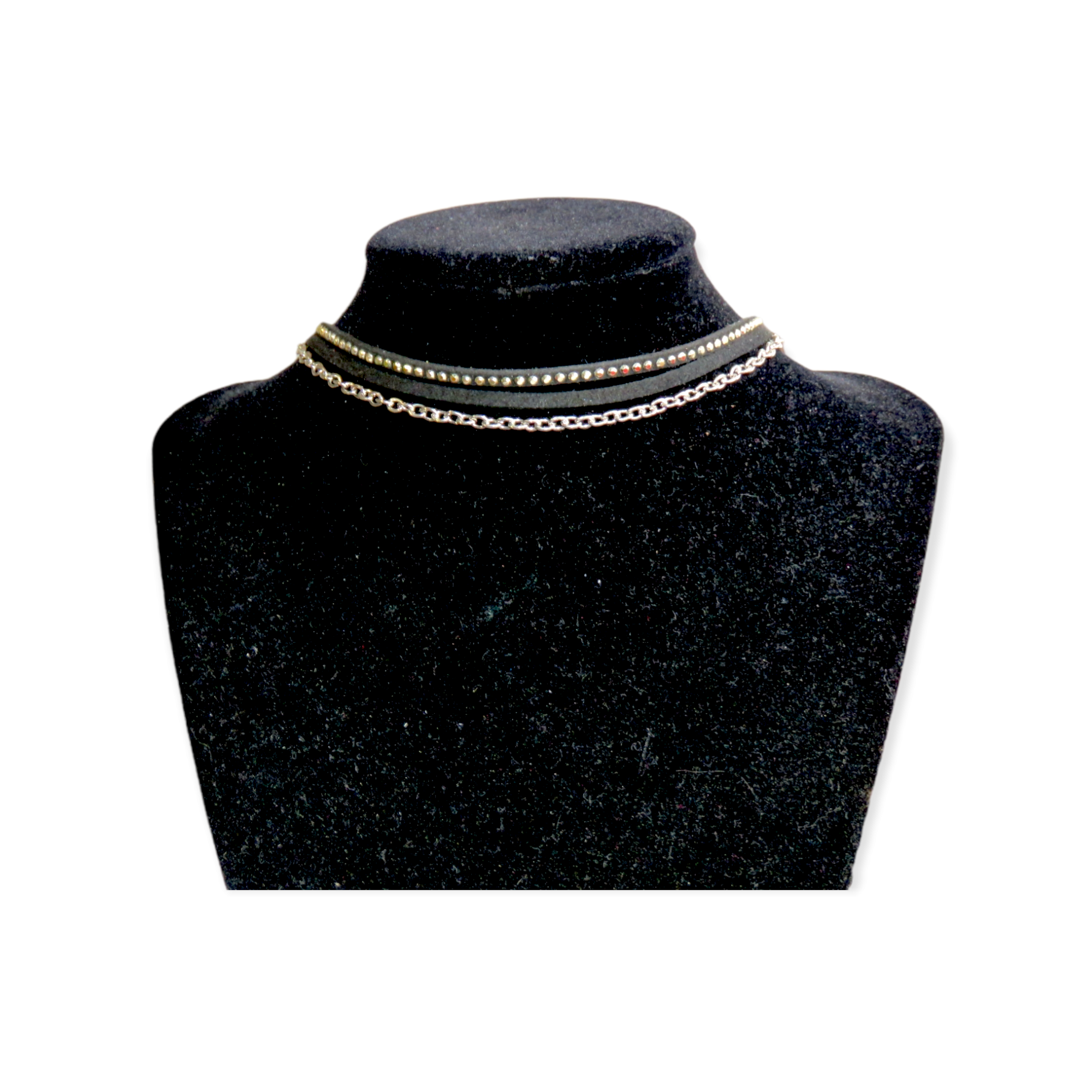 Τσόκερ τριπλό με δέρμα μαύρο και αλυσίδα ασημί