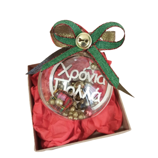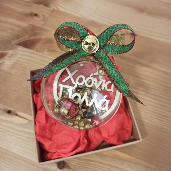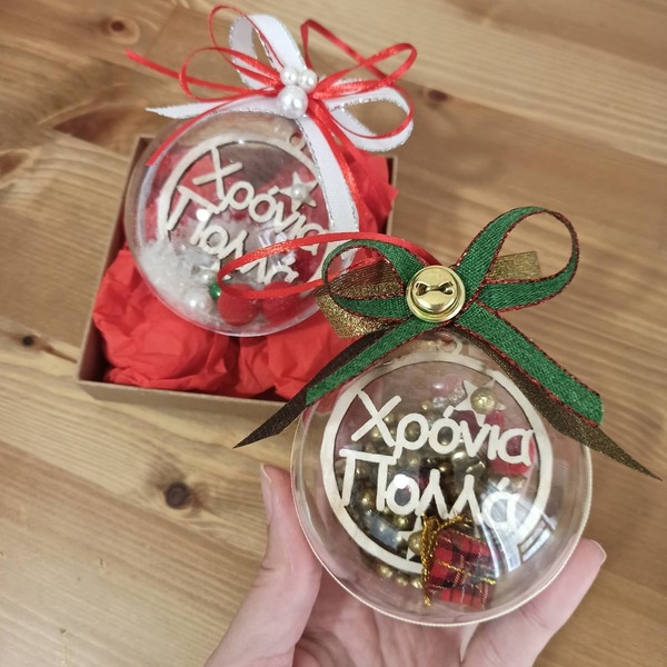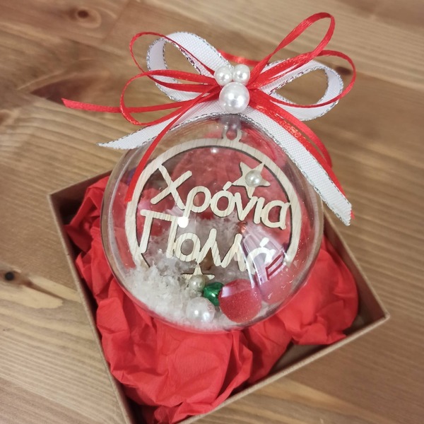 χριστουγεννιάτικη μπάλα 3d από plexiglass με ξύλινο στοιχείο ‘χρόνια πολλά ‘ στο εσωτερικό της και διαθέσιμη σε 2 χρωματικούς συνδυασμούς: