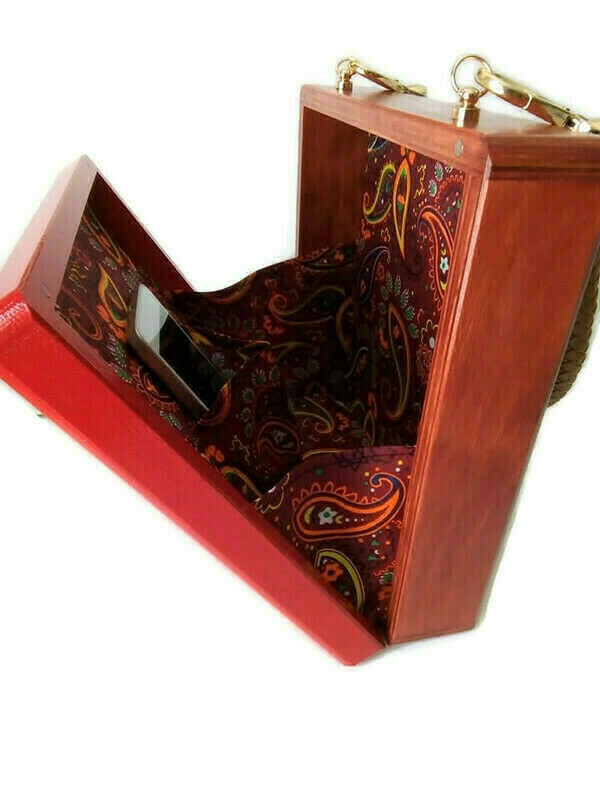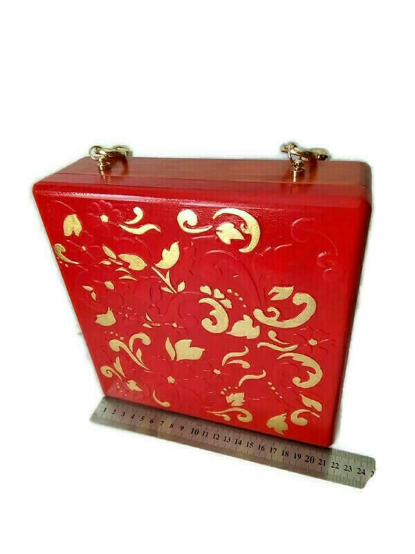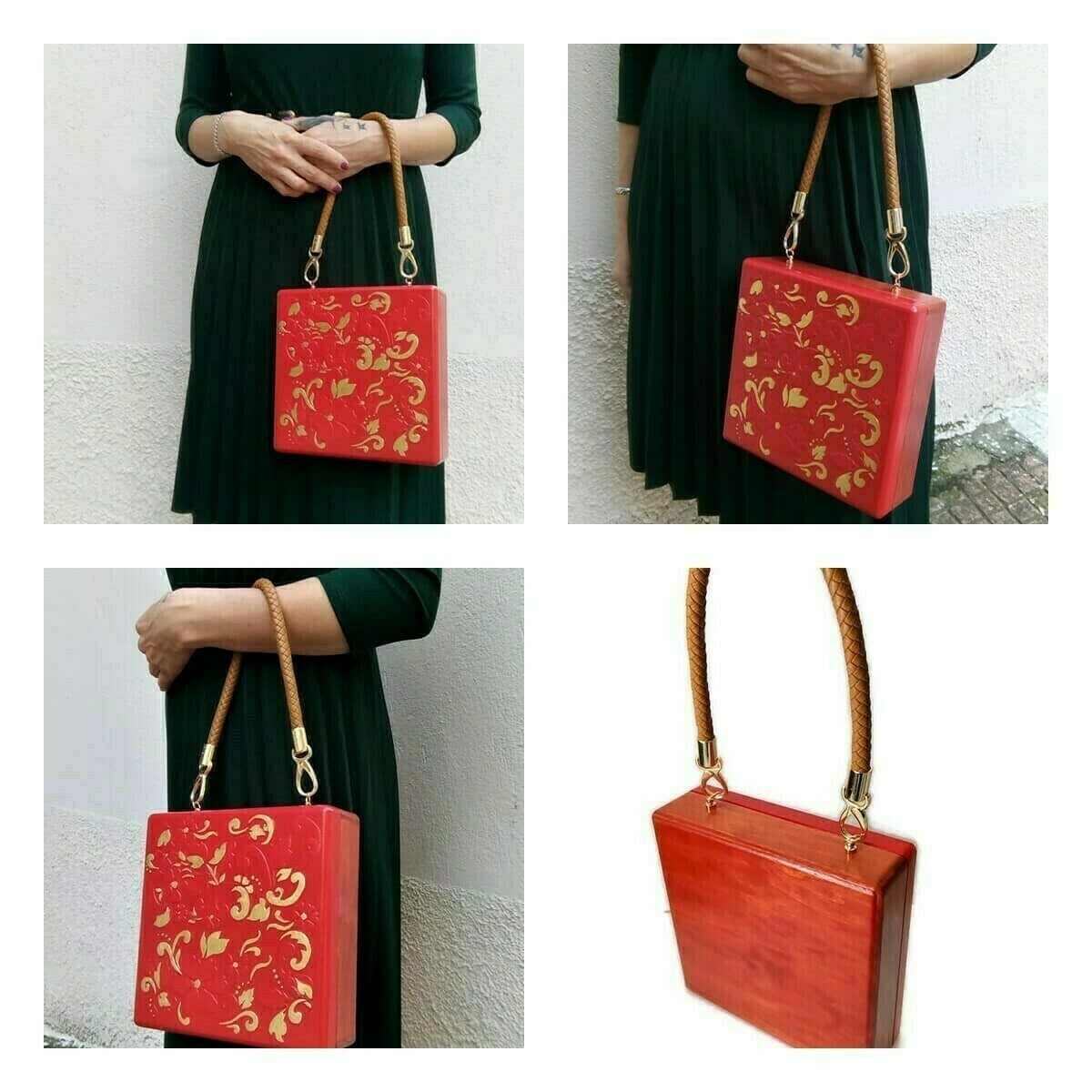 Ξύλινη Tσάντα 22 εκ.22 εκ.7  εκ. χειροποίητη σε κόκκινο-χρυσό-κεραμιδί χρώμα, με δερμάτινο χερούλι, υπάρχουν δύο μαγνήτες. Με βαμβακερή φόδρα.