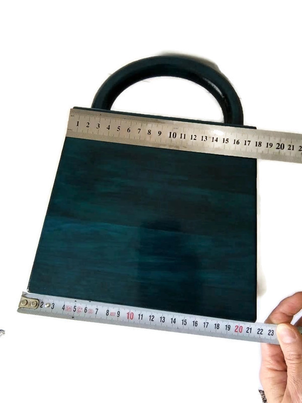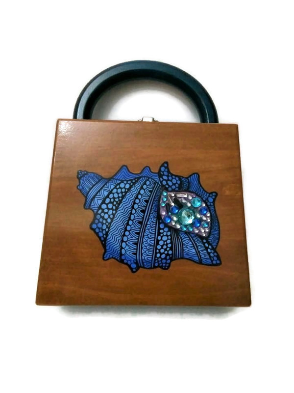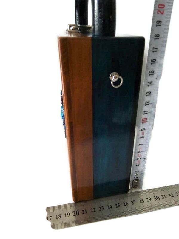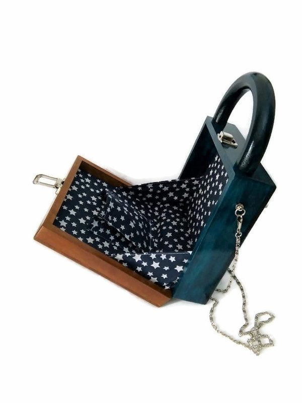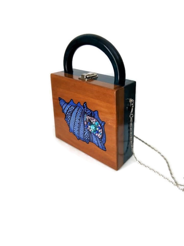 Ξύλινη Tσάντα 20,5187 εκ. χειροποίητη ζωγραφισμένη στο χέρι σε σχήμα τραπεζιού σε καφέ-μπλε χρώμα, με ξύλινο χερούλι, διακοσμημένη με στρας, με βαμβακερή φόδρα, μακριά μεταλλική αλυσίδα.