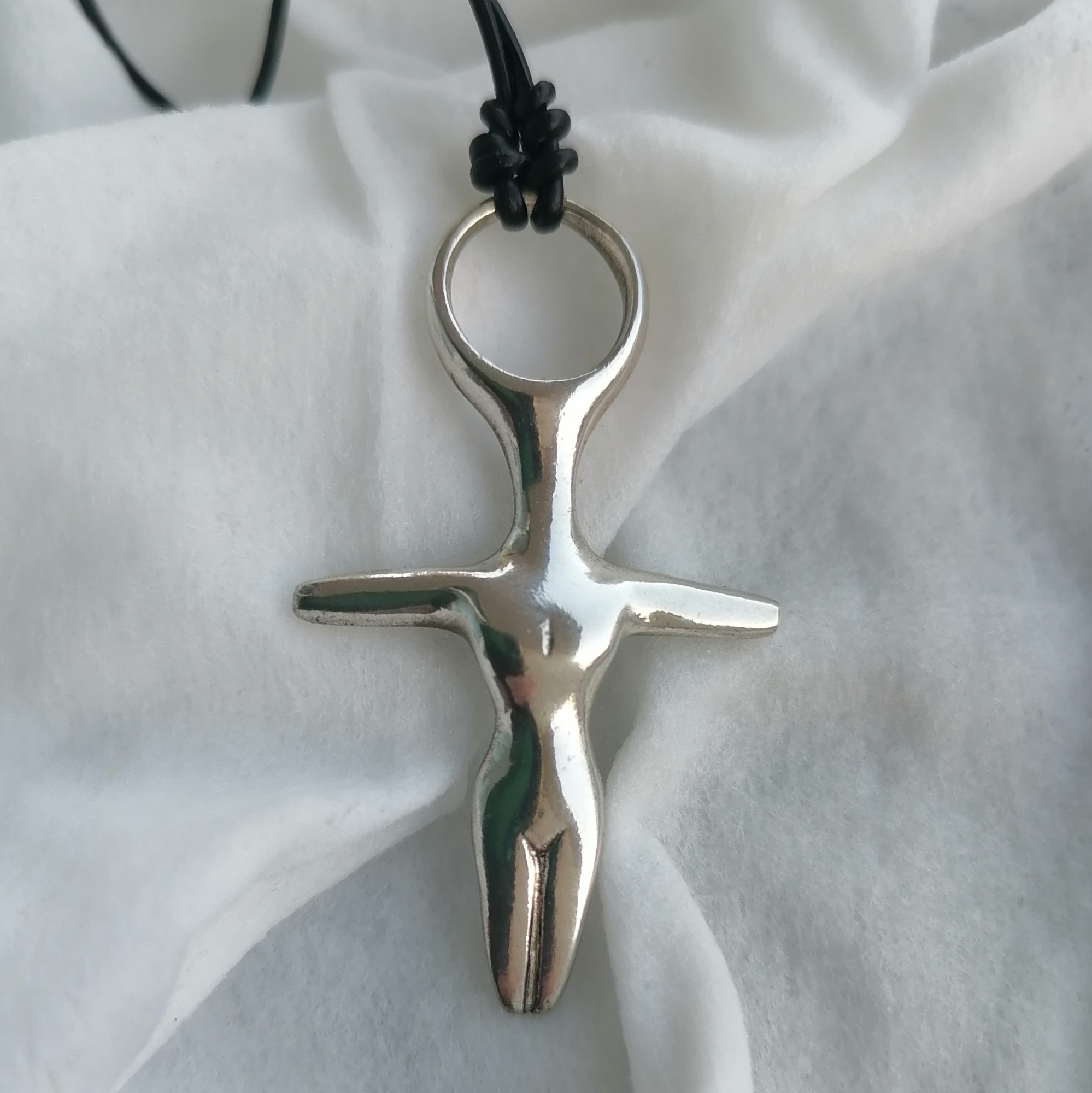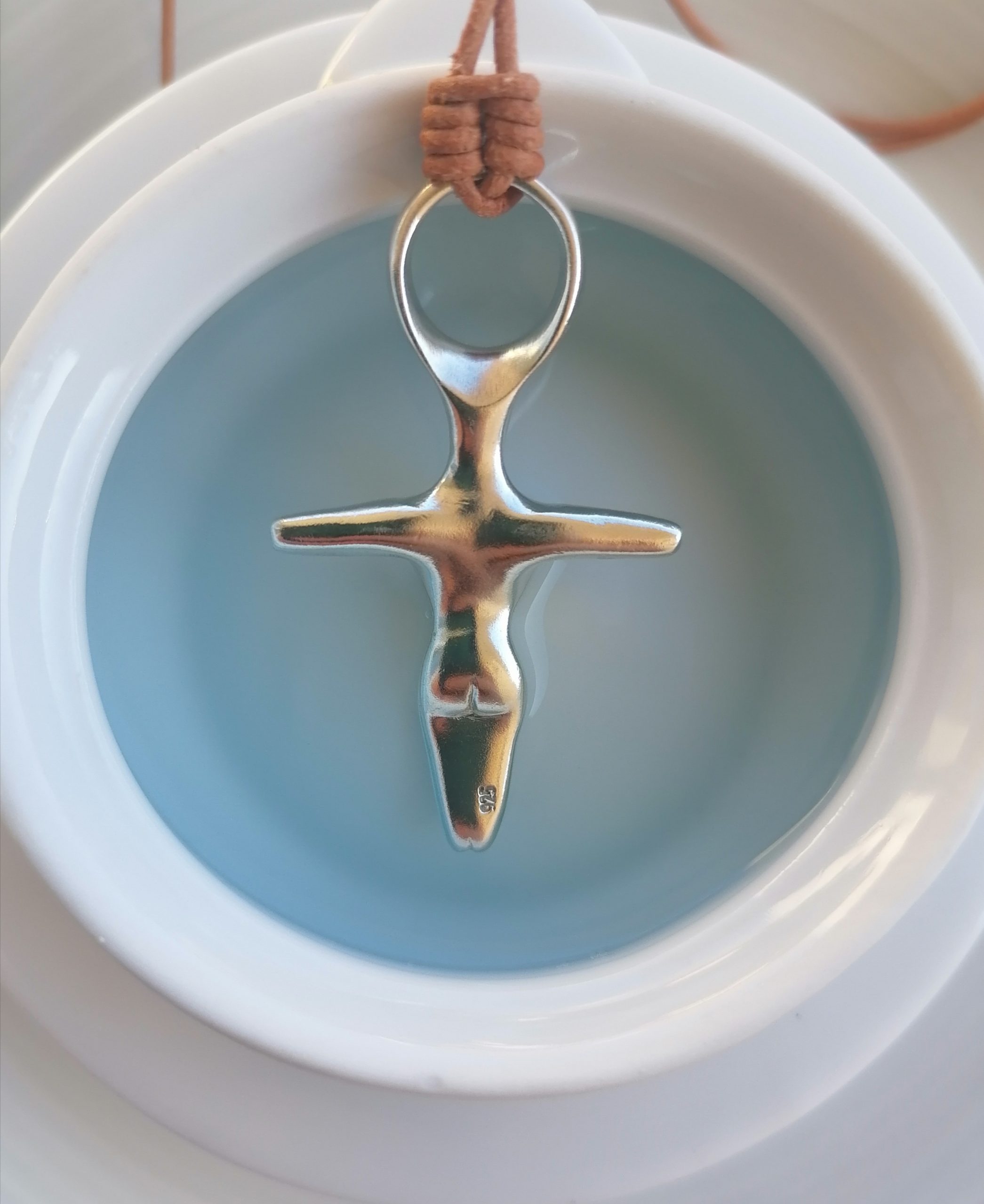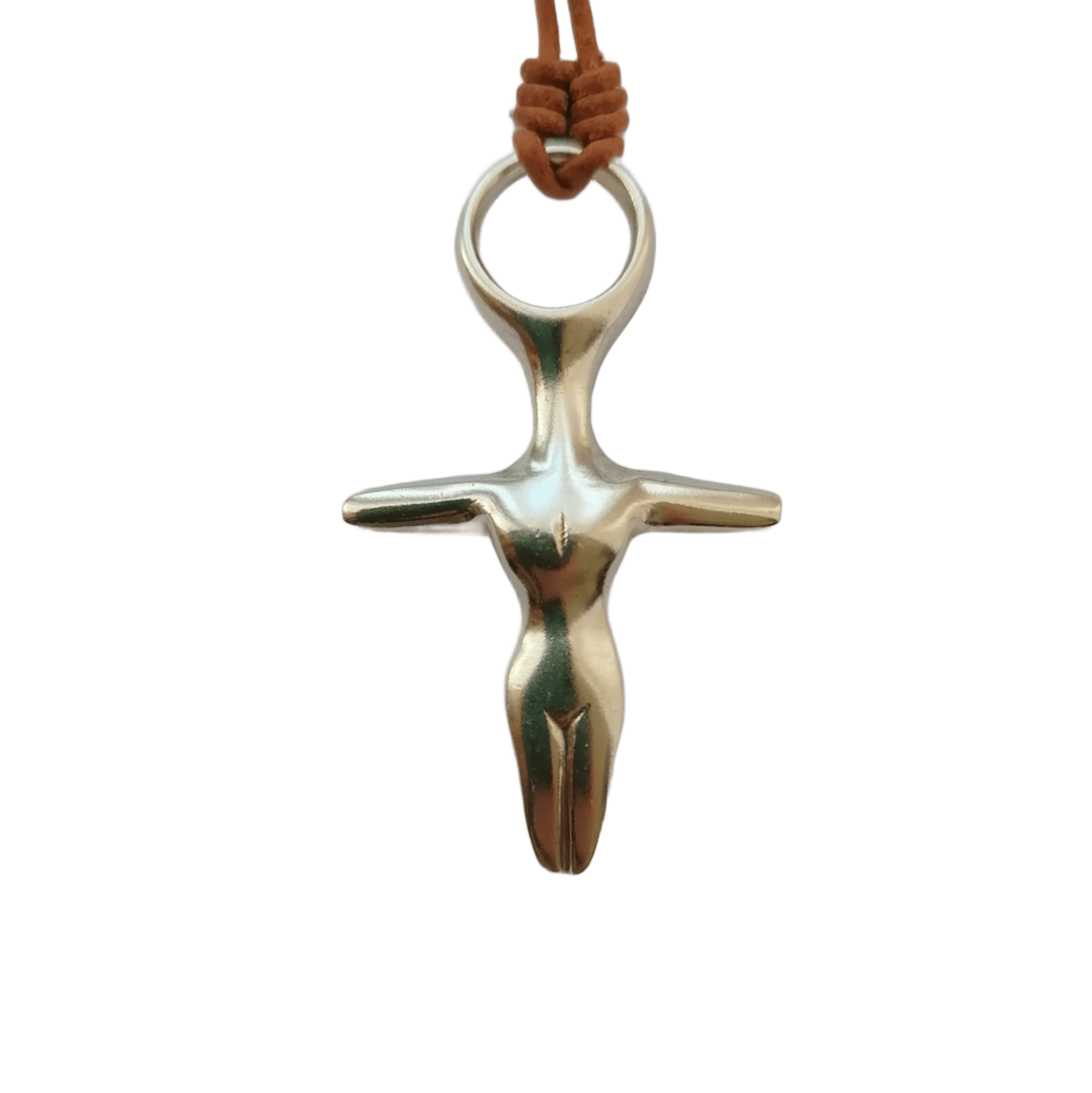 Σύμβολο γυναικείου φύλου ♁, κολιέ σε ασήμι 925, διαστάσεων περίπου 4cm x 2,4cm x 4mm, με ρυθμιζόμενου μήκους δερμάτινο κορδόνι, διατομής 1mm, σε χρώμα ανοικτό καφέ ή μαύρο.