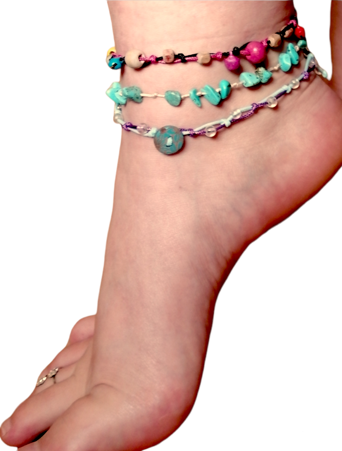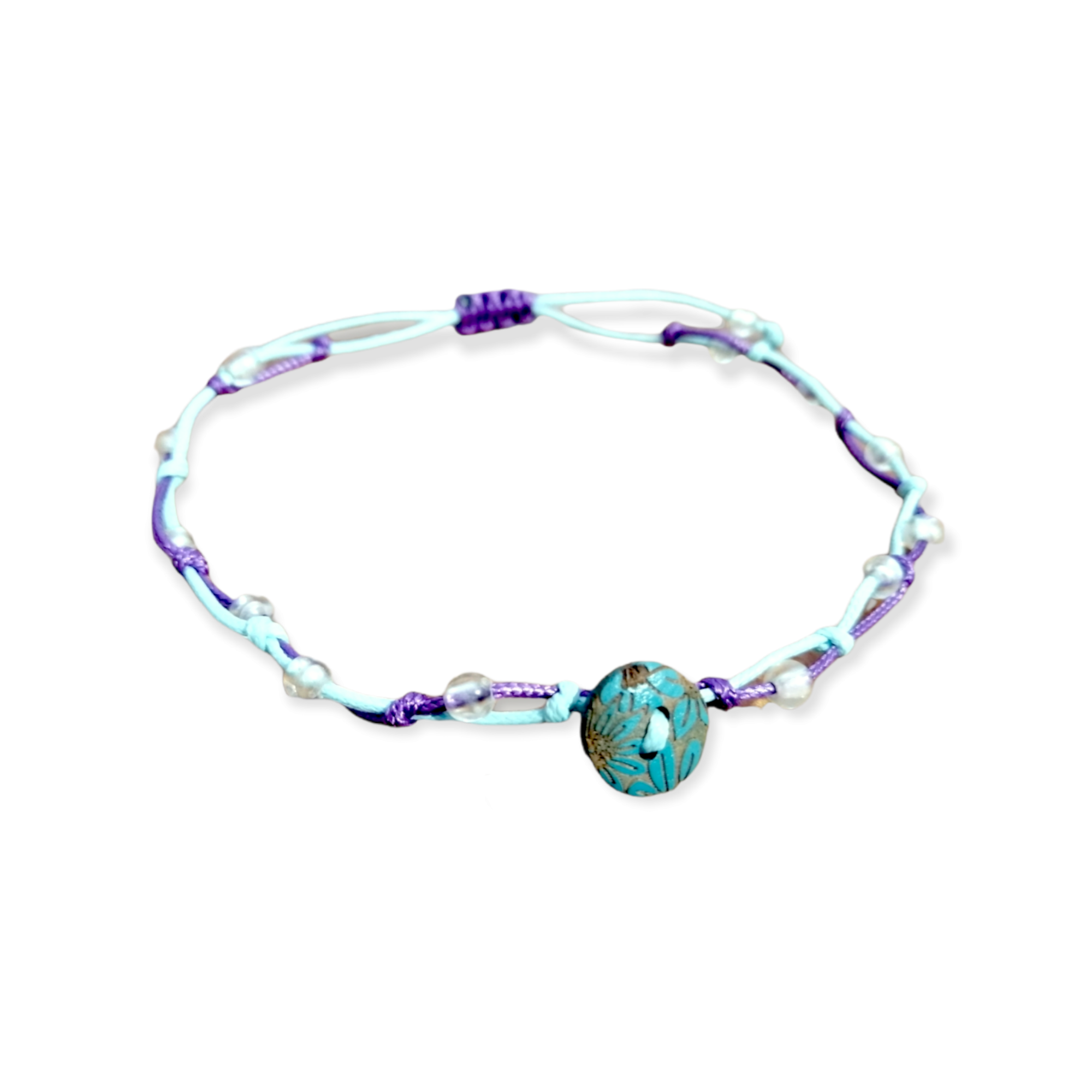Βραχιόλι ποδιού ρυθμιζόμενο με διπλό κορδόνι μωβ, γαλάζιο με διάφανες χάντρες και ξύλινο κουμπί με σχέδιο λουλούδια