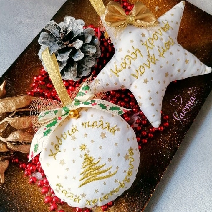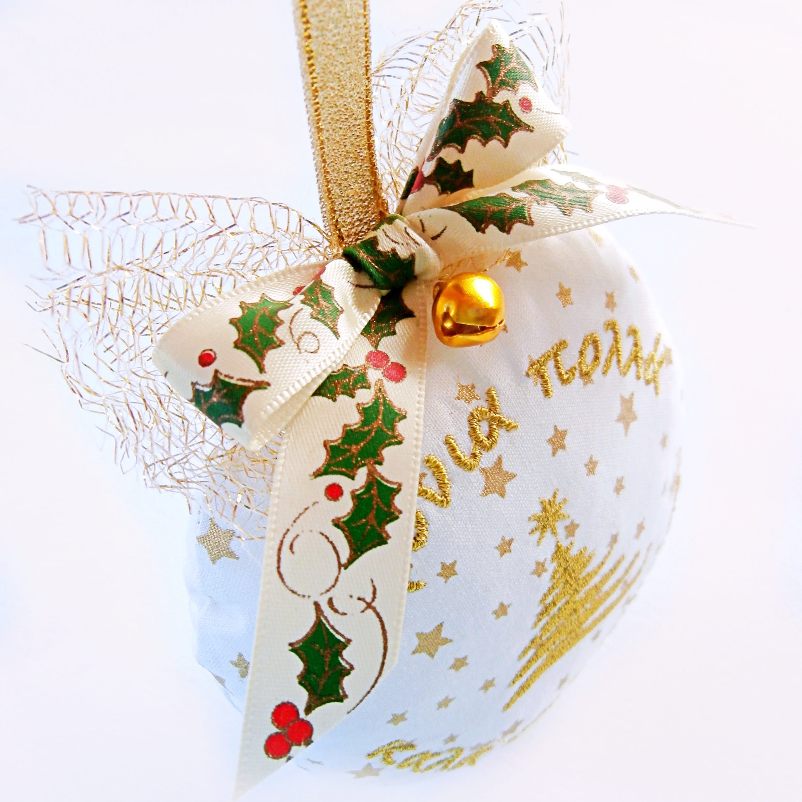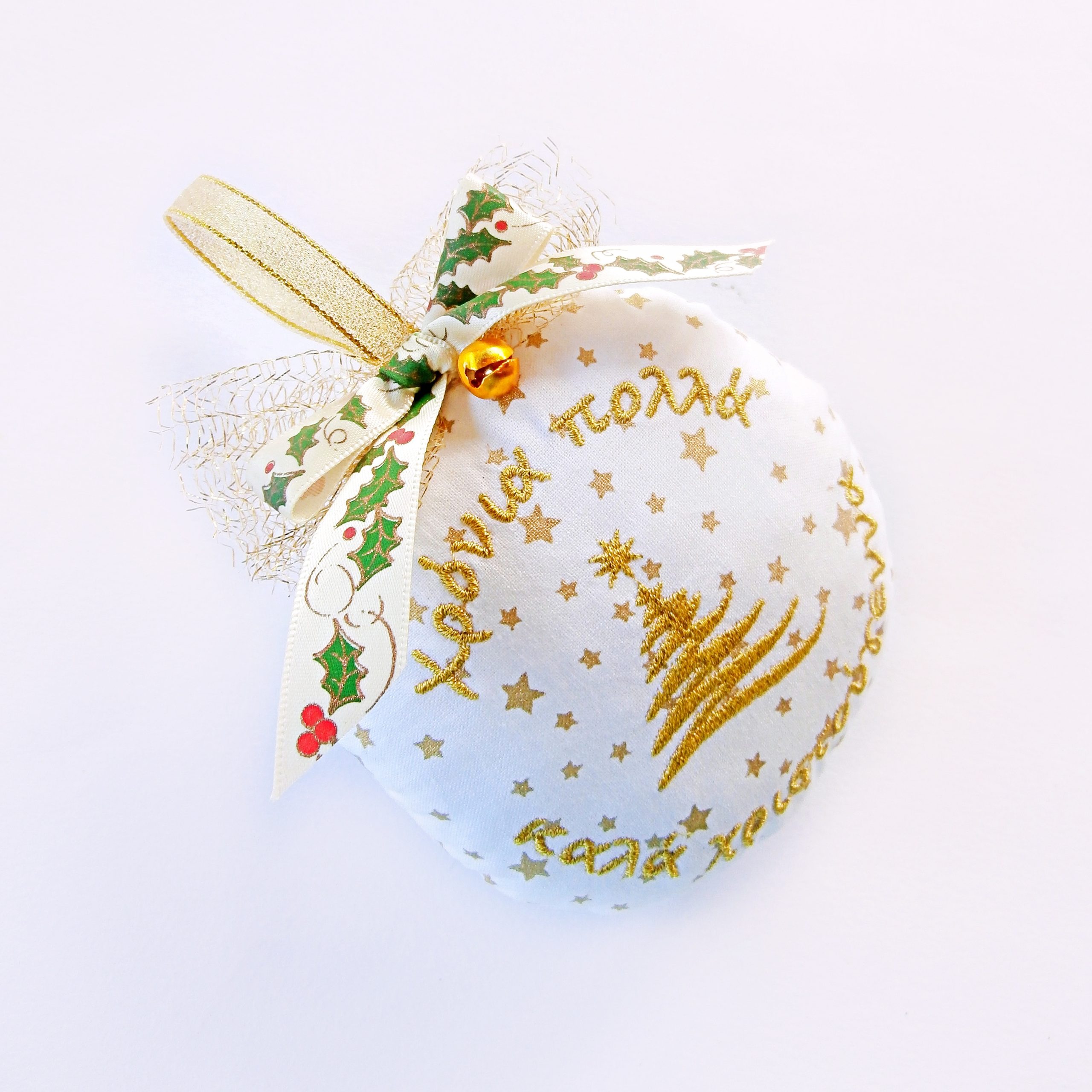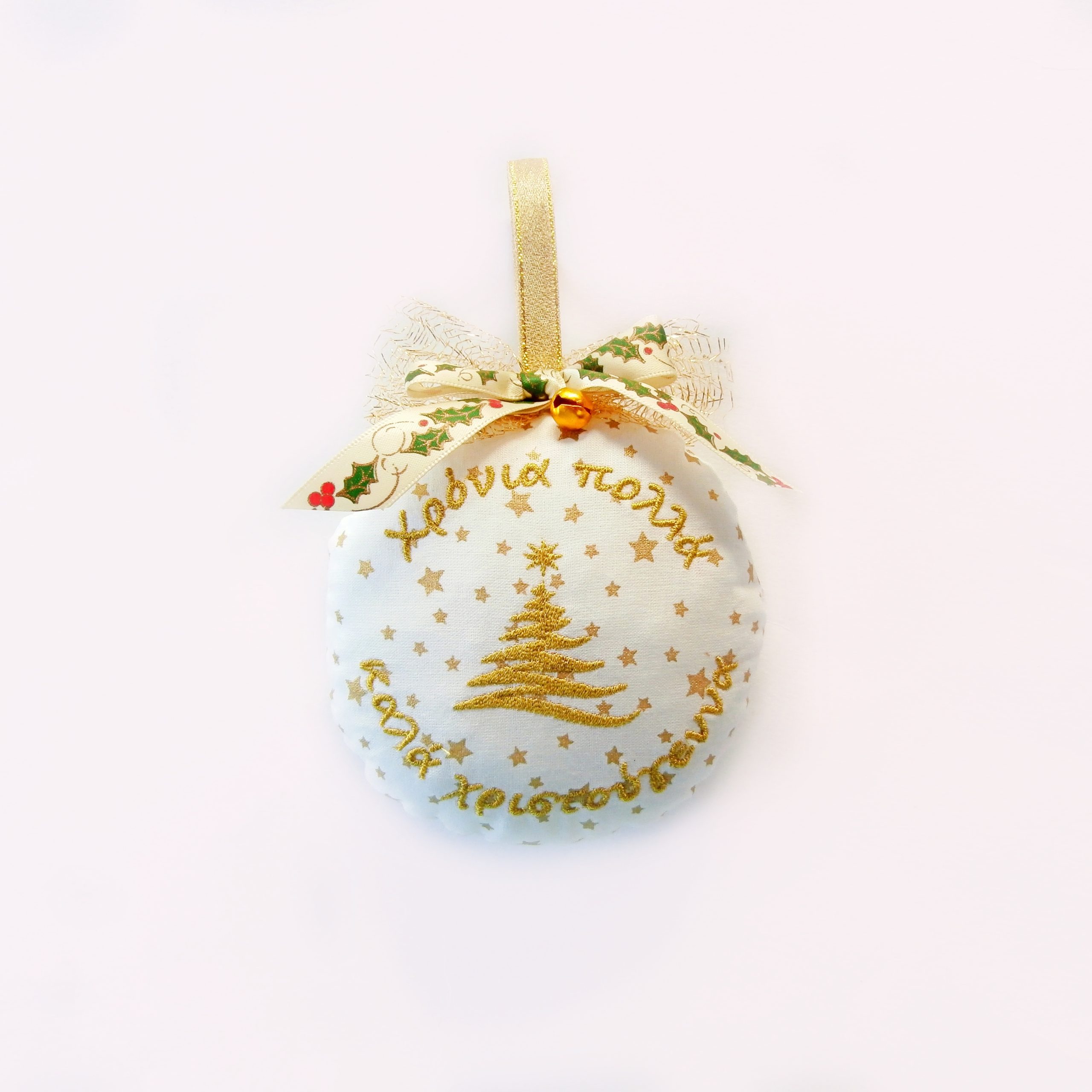 Χριστουγεννιάτικο υφασμάτινο στολίδι μπάλα προσωποποιημένο με ευχές λευκό με χρυσό κεντημένο δέντρο