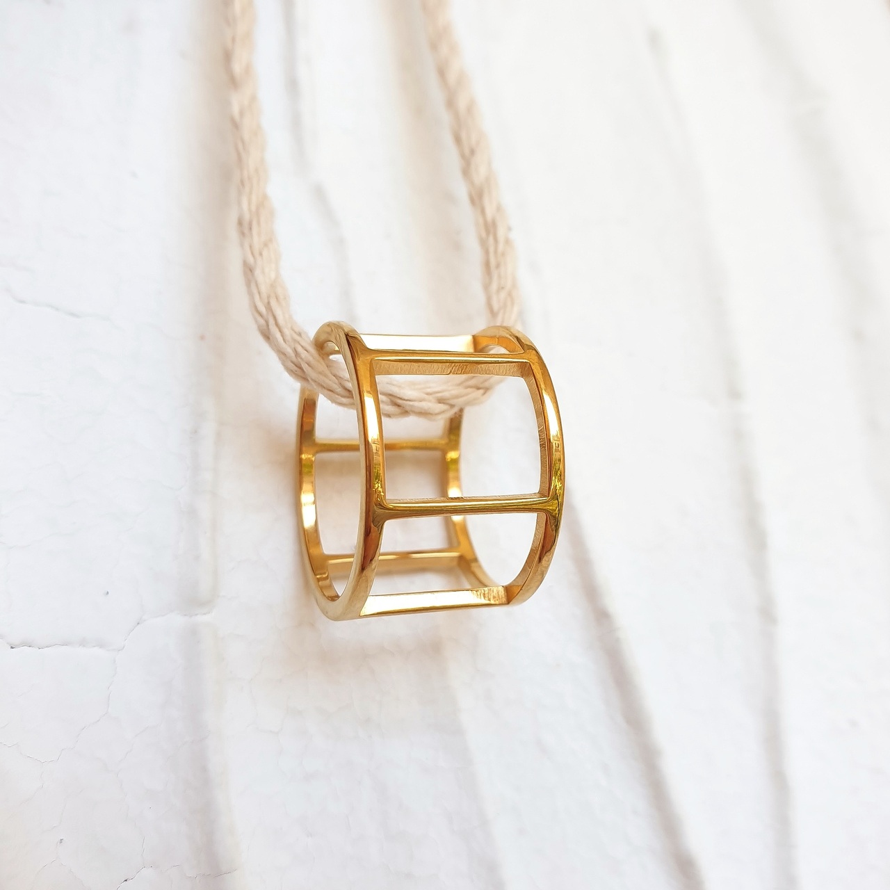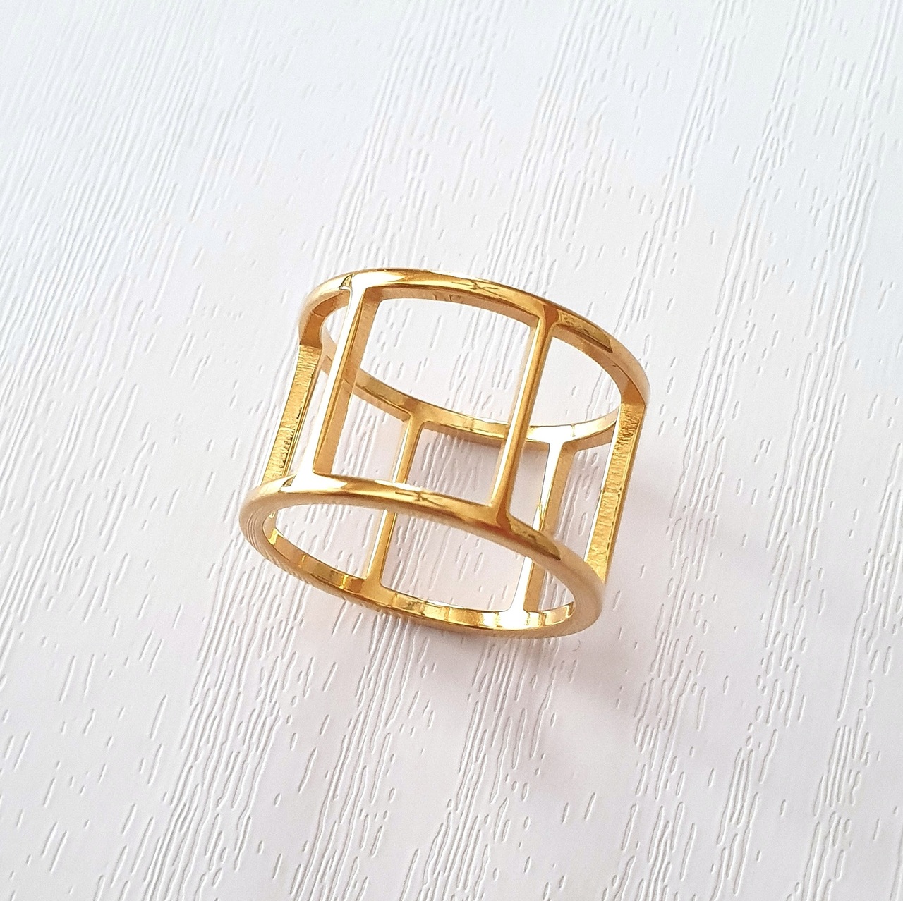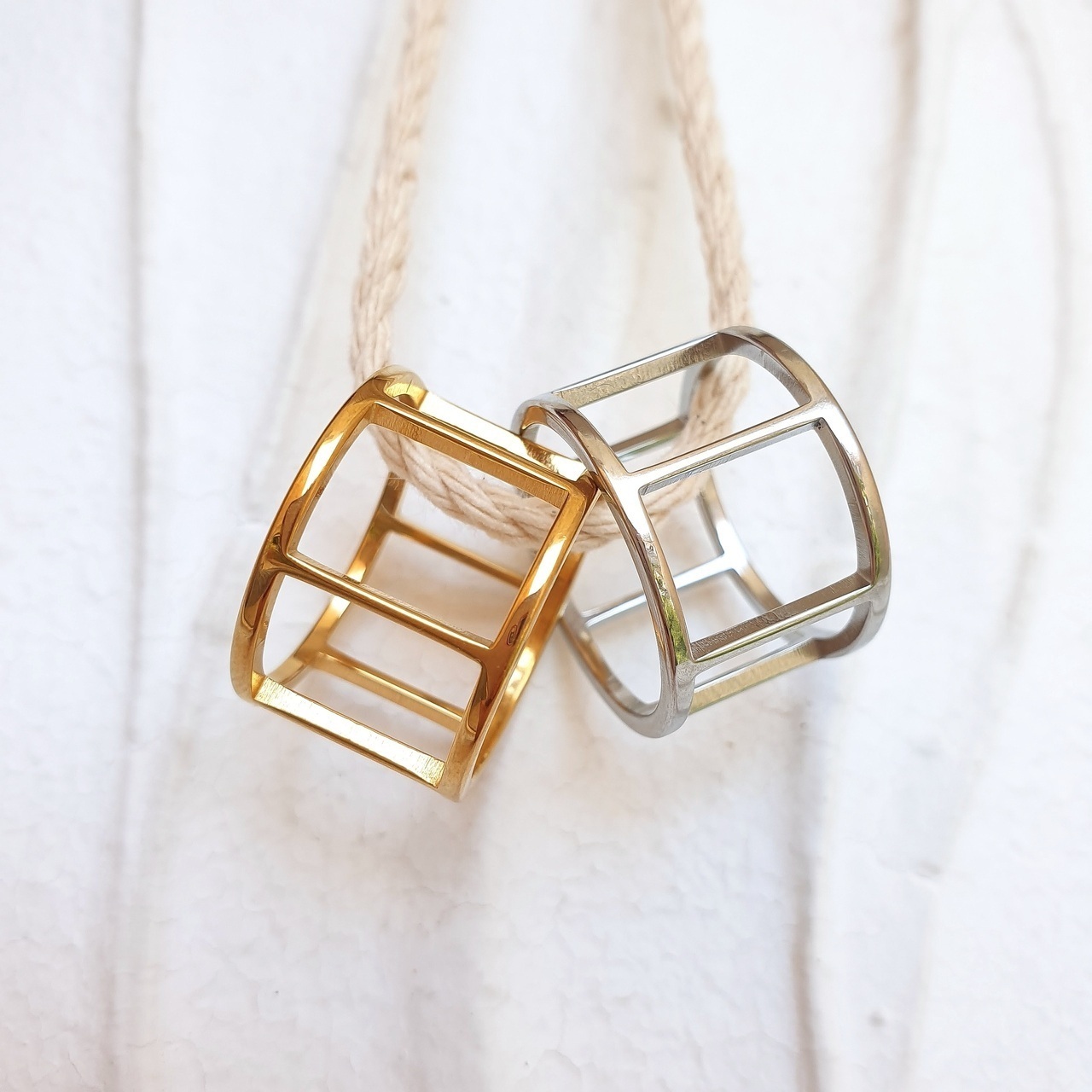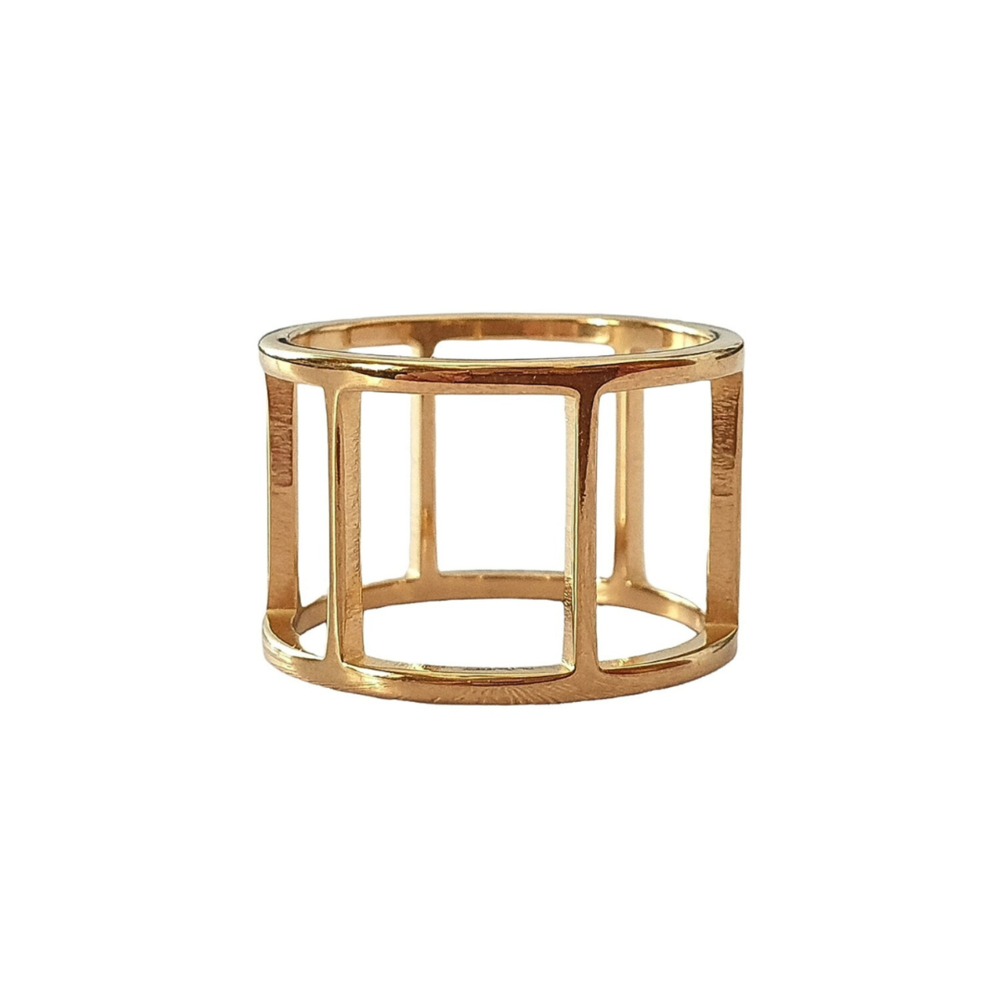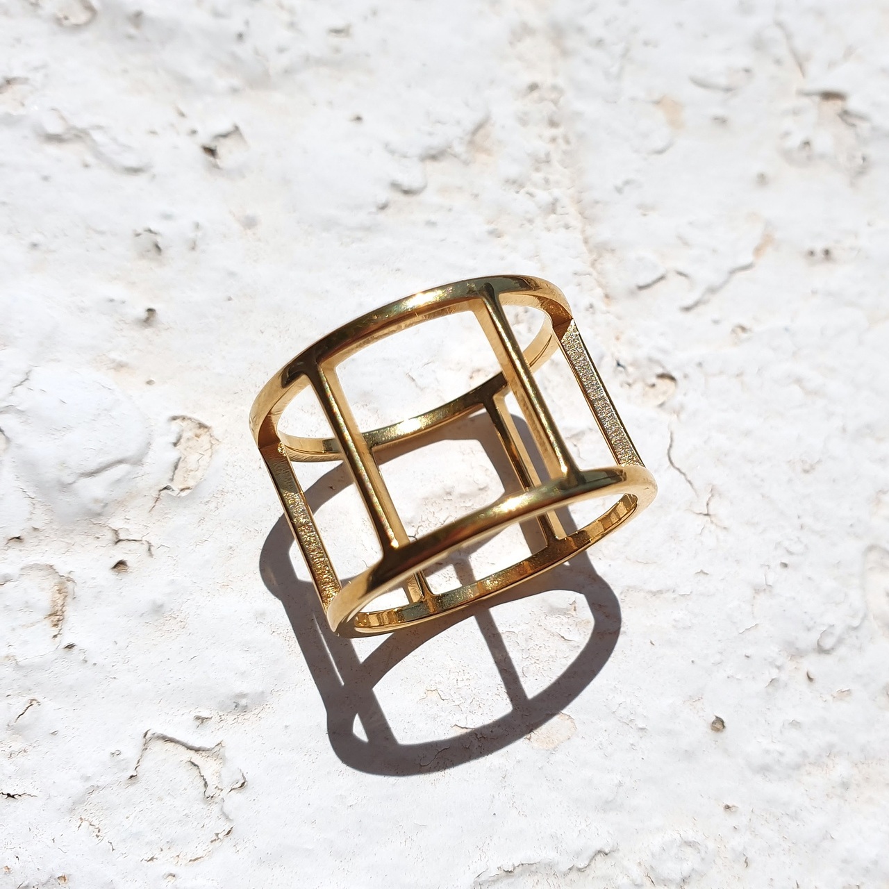 Εντυπωσιακό cage δαχτυλίδι με χρυσό επιχρύσωμα. Από ανοξείδωτο ατσάλι, δεν προκαλεί αλλεργίες και παραμένει αναλλοίωτο.