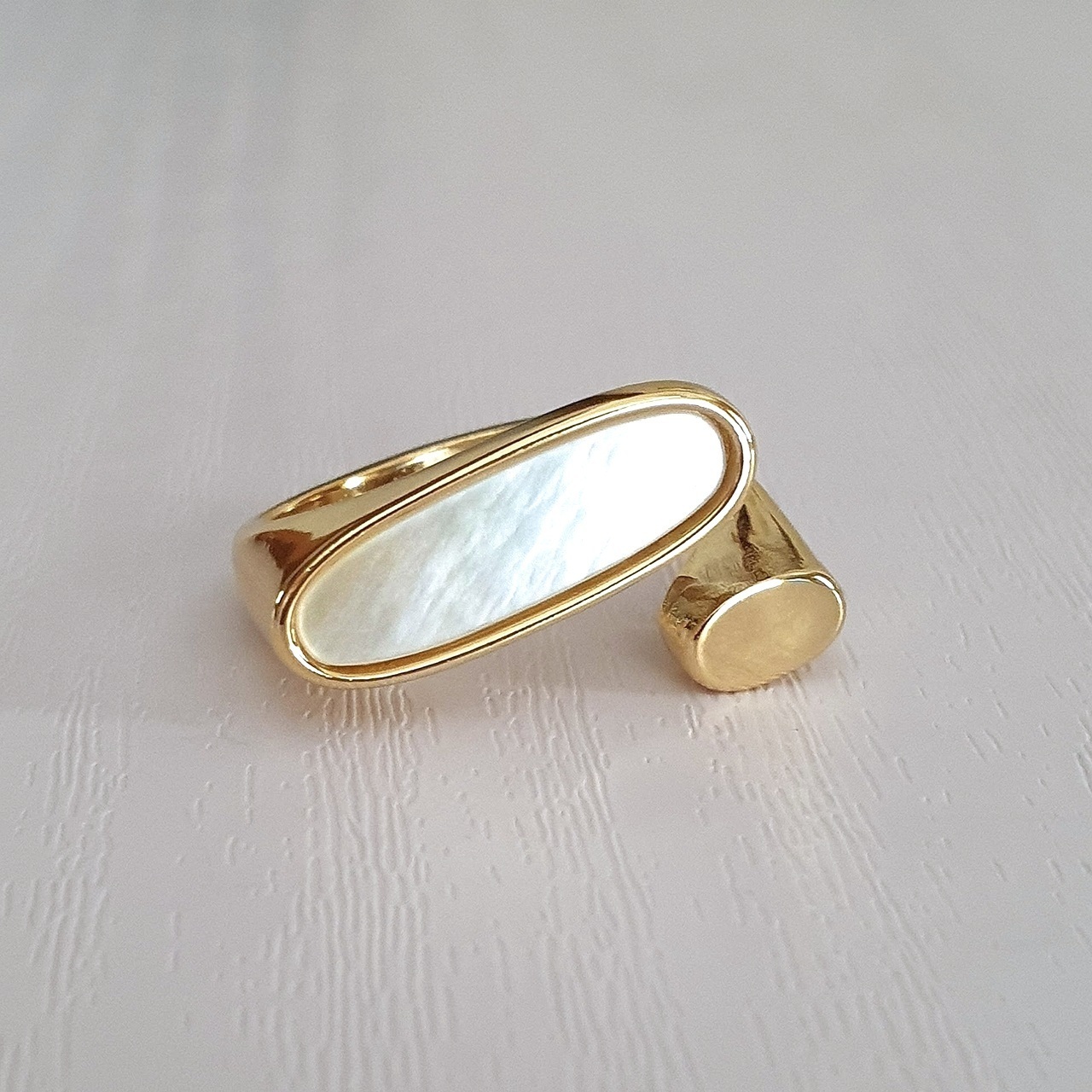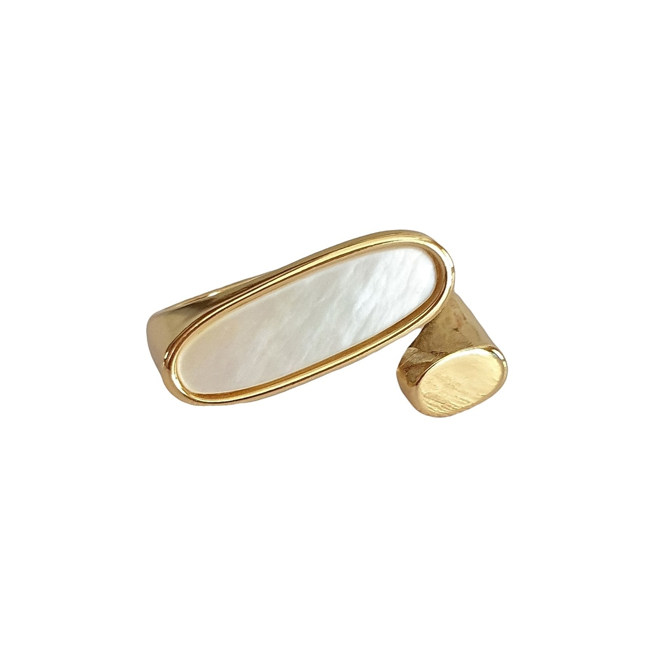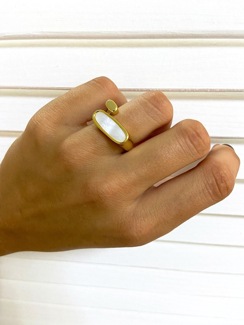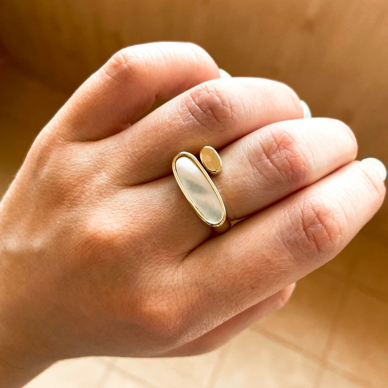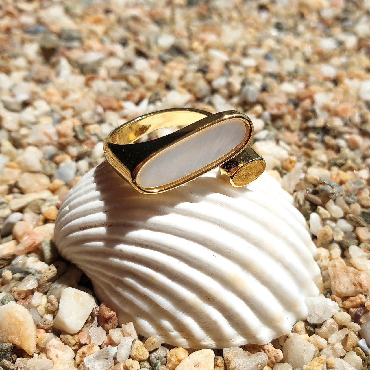 Δαχτυλίδι από ασήμι 925 με χρυσό επιχρύσωμα στολισμένο με λευκή ιριδίζον πέτρα mother of pearl.