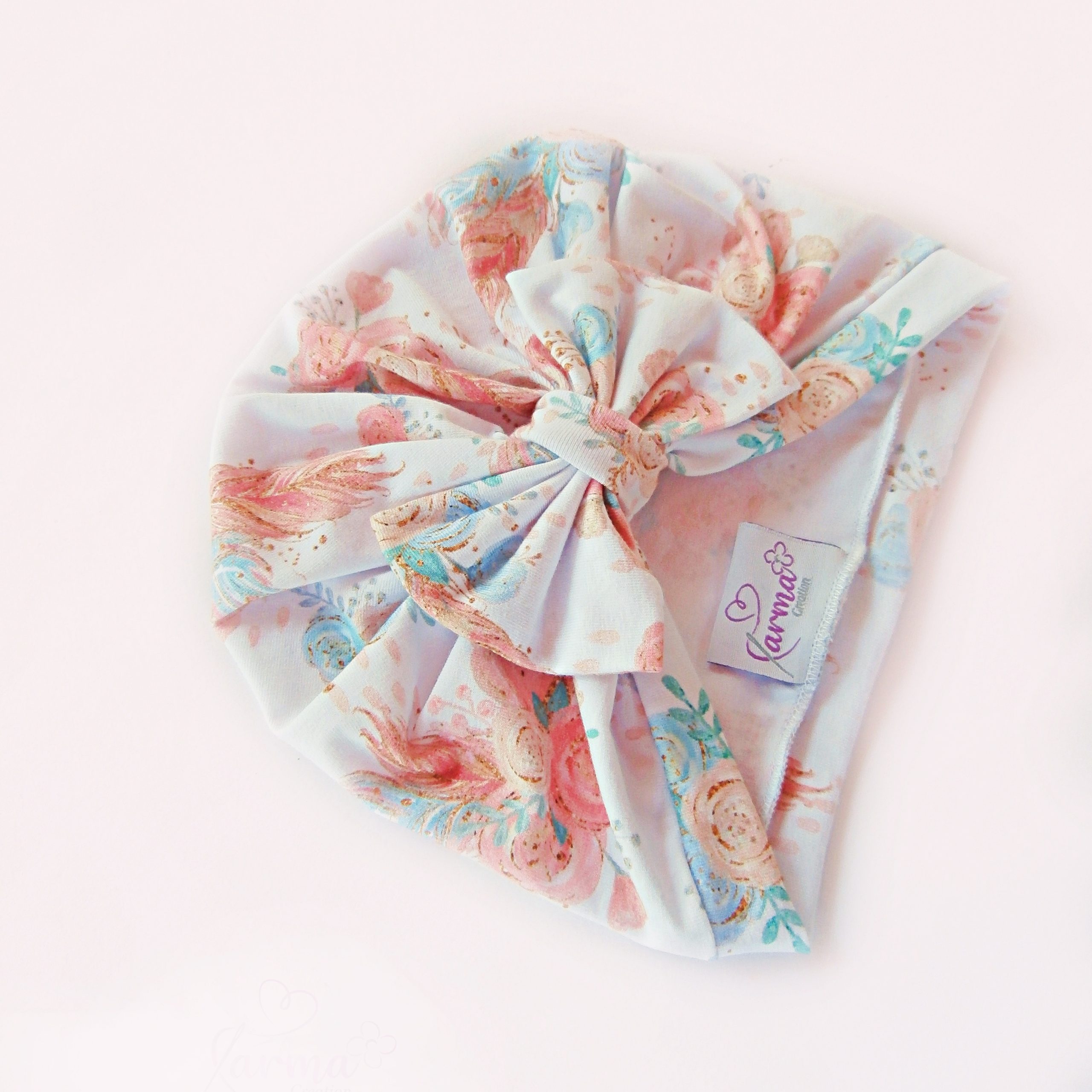 Χειροποίητο τουρμπάνι με απόχρωση λευκό με φτερά και ίδιο λουλούδι.