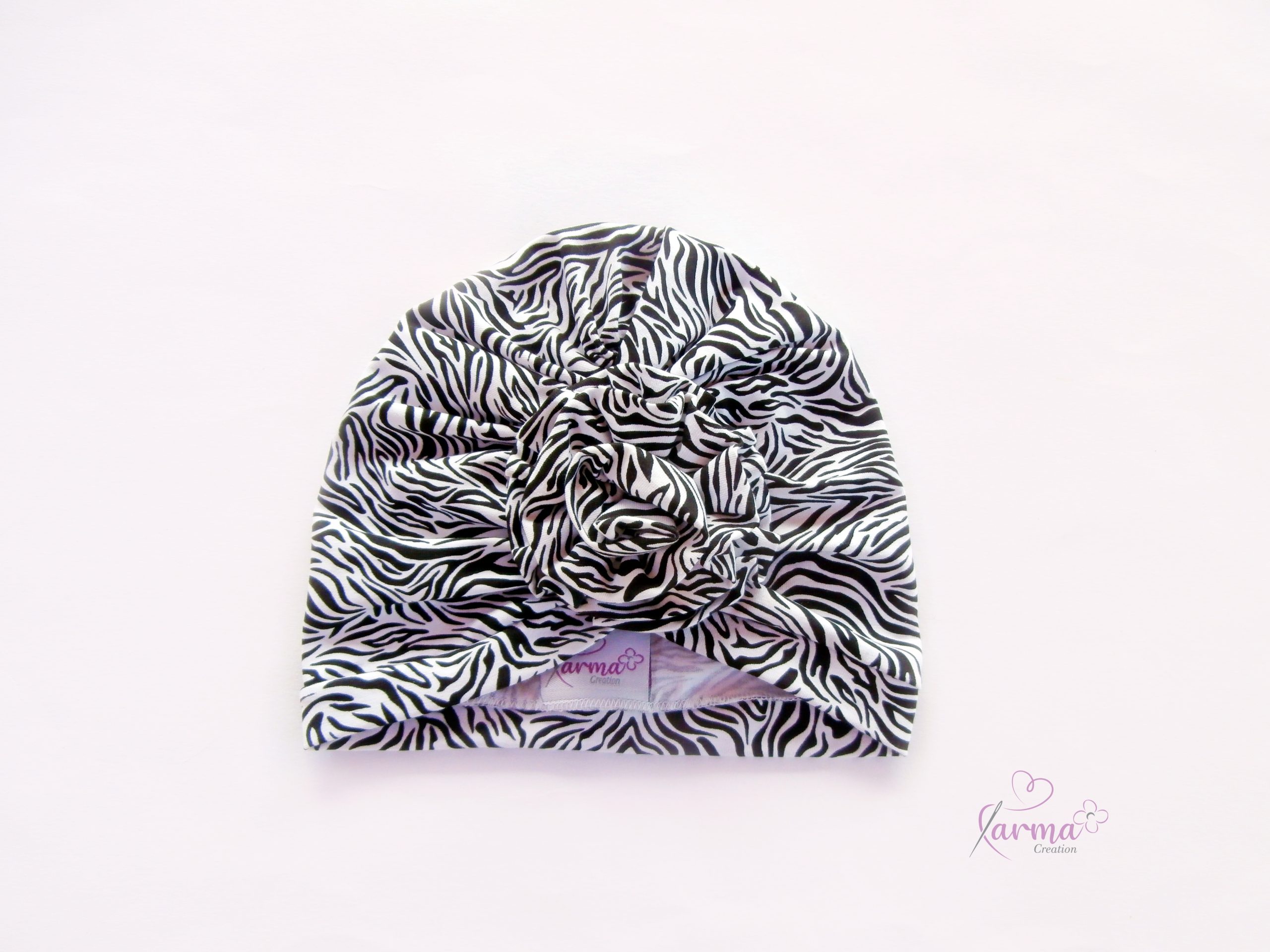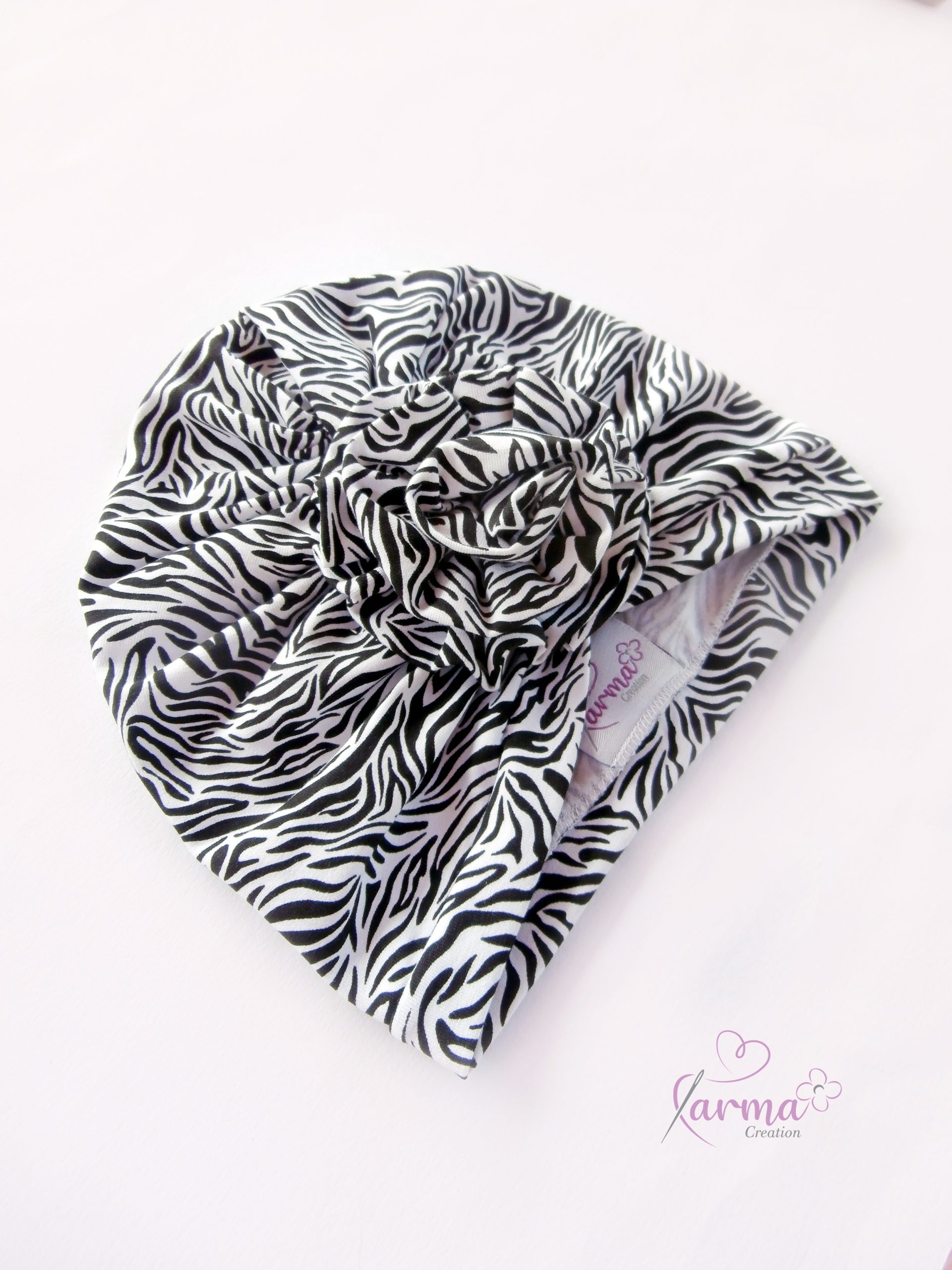 Χειροποίητο τουρμπάνι με απόχρωση λευκό με μαύρο τιγρέ και ίδιο λουλούδι.