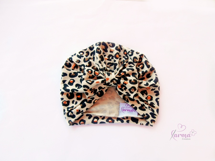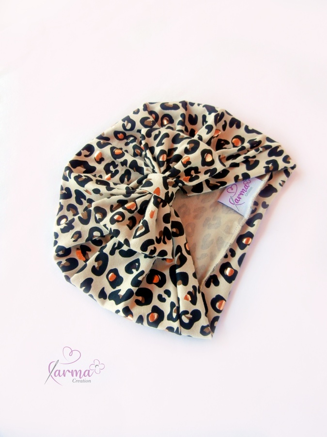 Χειροποίητο τουρμπάνι λεοπάρ σε μπεζ μαύρη απόχρωση με ίδιο φιόγκο και χρυσές λεπτομέρειες.