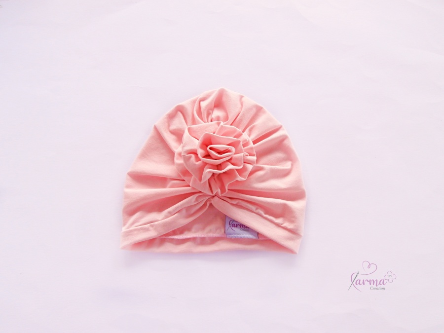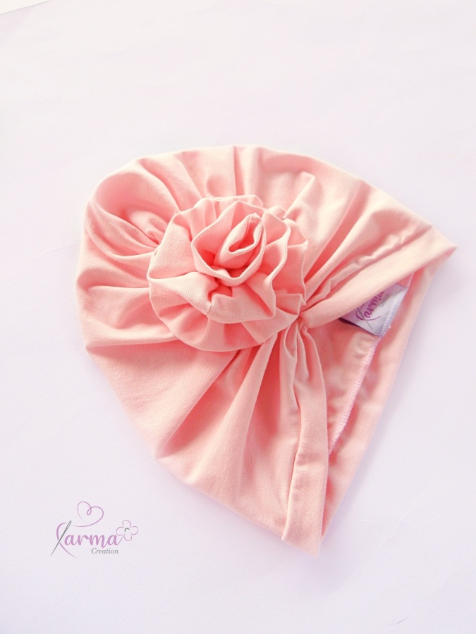 Χειροποίητο τουρμπάνι σε ροζ απαλή απόχρωση με ροζ ίδιο λουλούδι.