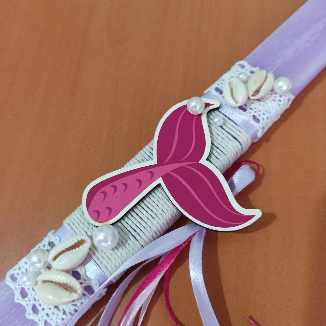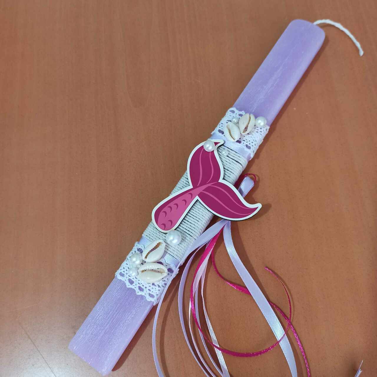 Αρωματική λαμπάδα 30 cm, πλακέ,ξυστή 30 cm διακοσμημένη με ξύλινη ροζ γοργονοουρά, κοχυλάκια,πέρλες, σπάγγο, κορδέλες και δαντέλα.