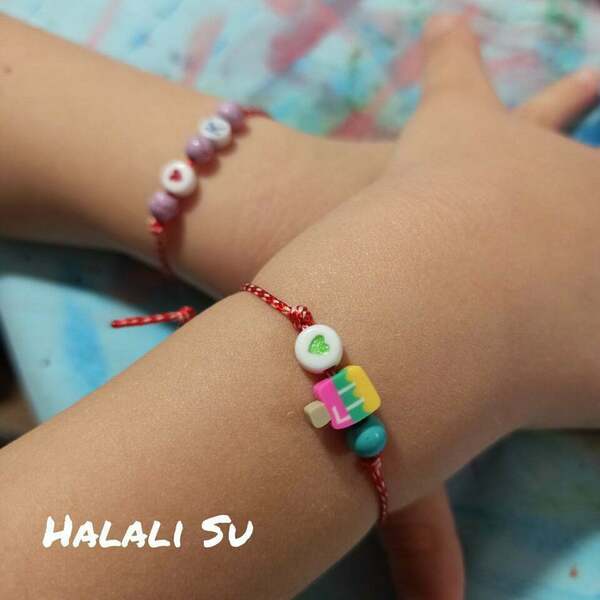 Μαρτάκι με ακρυλικό στοιχείο μονόγραμμα από το όνομα του παιδιού ( λατινικοί χαρακτήρες ), καρδιά σε διάφορα χρώματα (τυχαία επιλογή) και πέτρες χαολίτη .