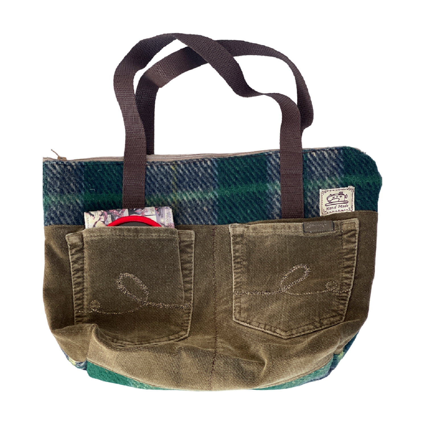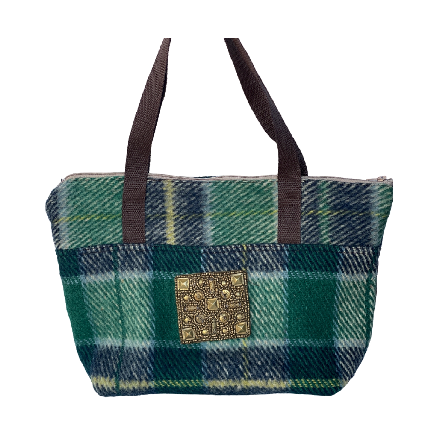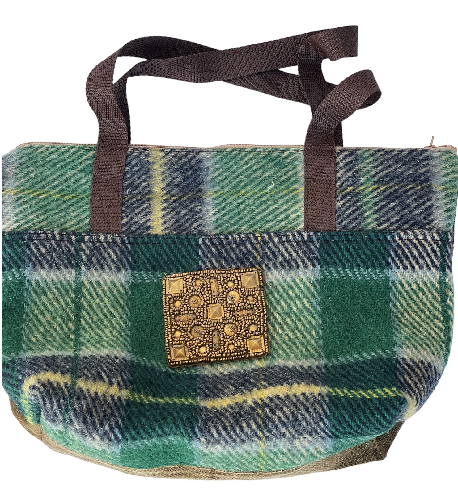 Μοναδική πρωτότυπη χειροποίητη τσάντα χειρός με φερμουάρ, από μάλλινο σκωτσέζικο καρό και καφέ τύπου σουέτ υφάσματα. Μπροστά έχει μεταλλικό μπρονζέ διακοσμητικό, ενώ στην πίσω πλευρά υπάρχουν δύο τσέπες τύπου παντελονιού. Εσωτερικά είναι επενδεδυμένη με 100% βαμβακερό ύφασμα και έχει μια τσέπη. Αρκετά μεγάλης χωρητικότητας και διαστάσεις Υ25 x Μ37 x Π12 εκ περίπου, ενώ τα χερούλια από καφέ ιμάντα έχουν μήκος 43 εκ περίπου.