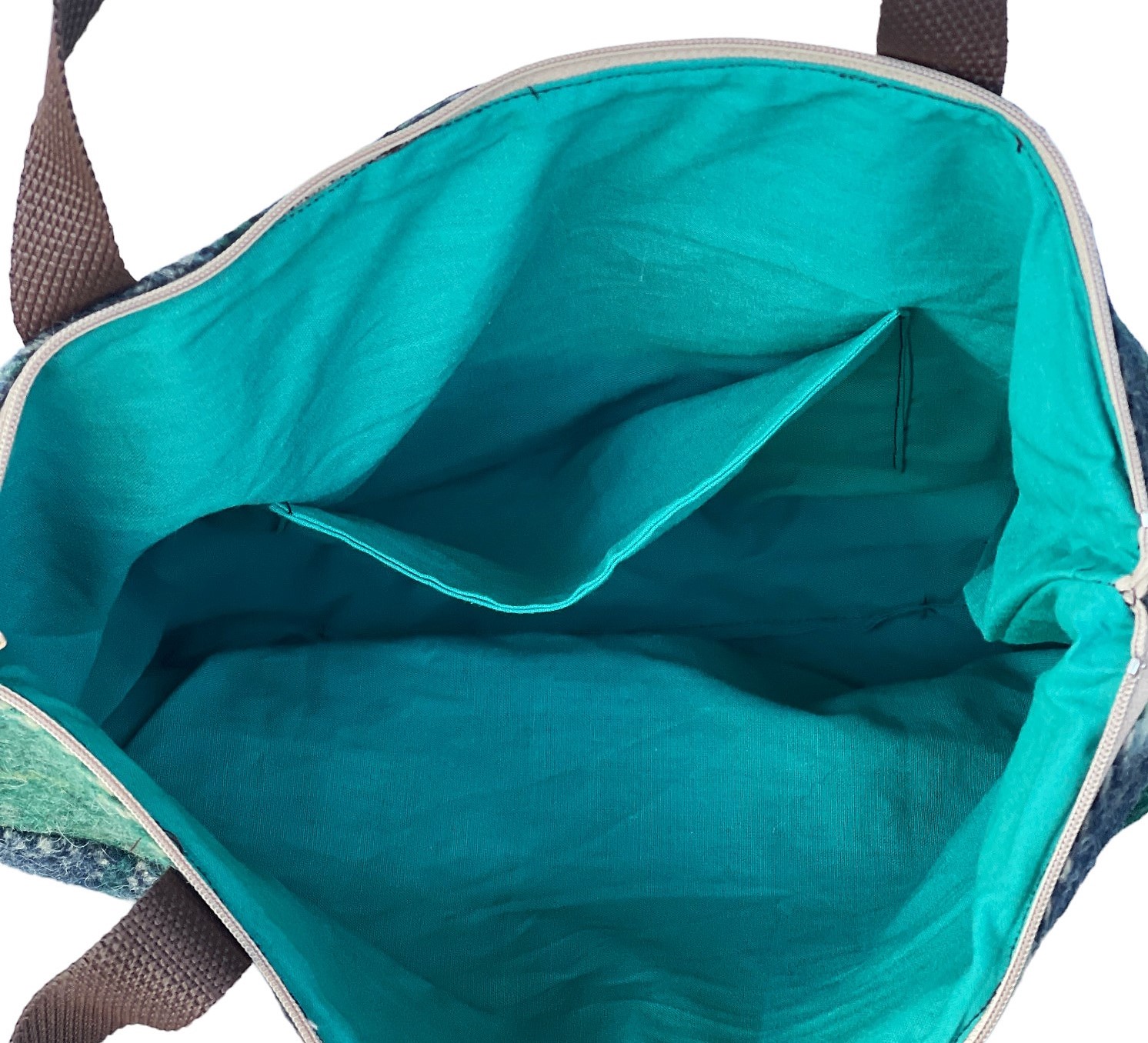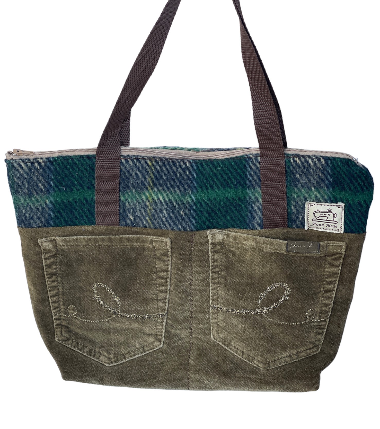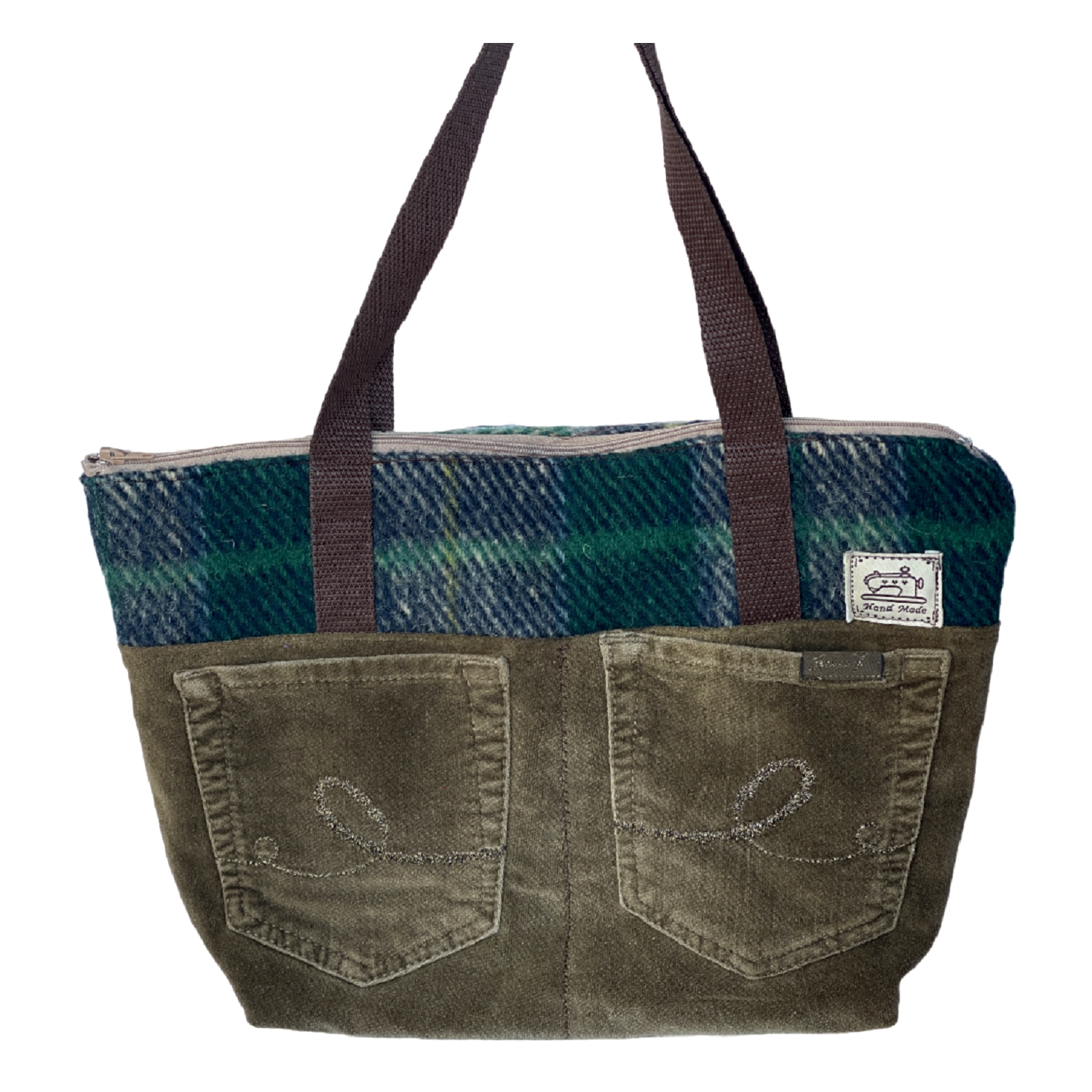 Μοναδική πρωτότυπη χειροποίητη τσάντα χειρός με φερμουάρ, από μάλλινο σκωτσέζικο καρό και καφέ τύπου σουέτ υφάσματα. Μπροστά έχει μεταλλικό μπρονζέ διακοσμητικό, ενώ στην πίσω πλευρά υπάρχουν δύο τσέπες τύπου παντελονιού. Εσωτερικά είναι επενδεδυμένη με 100% βαμβακερό ύφασμα και έχει μια τσέπη. Αρκετά μεγάλης χωρητικότητας και διαστάσεις Υ25 x Μ37 x Π12 εκ περίπου, ενώ τα χερούλια από καφέ ιμάντα έχουν μήκος 43 εκ περίπου.