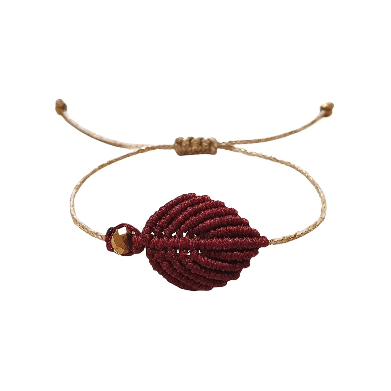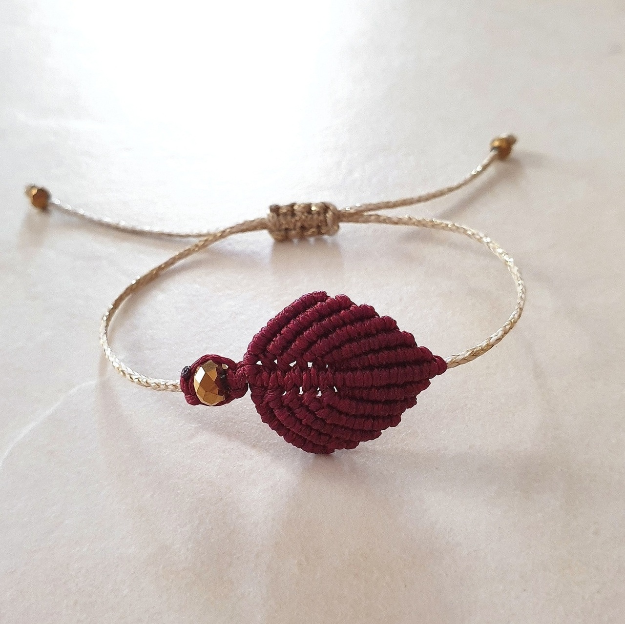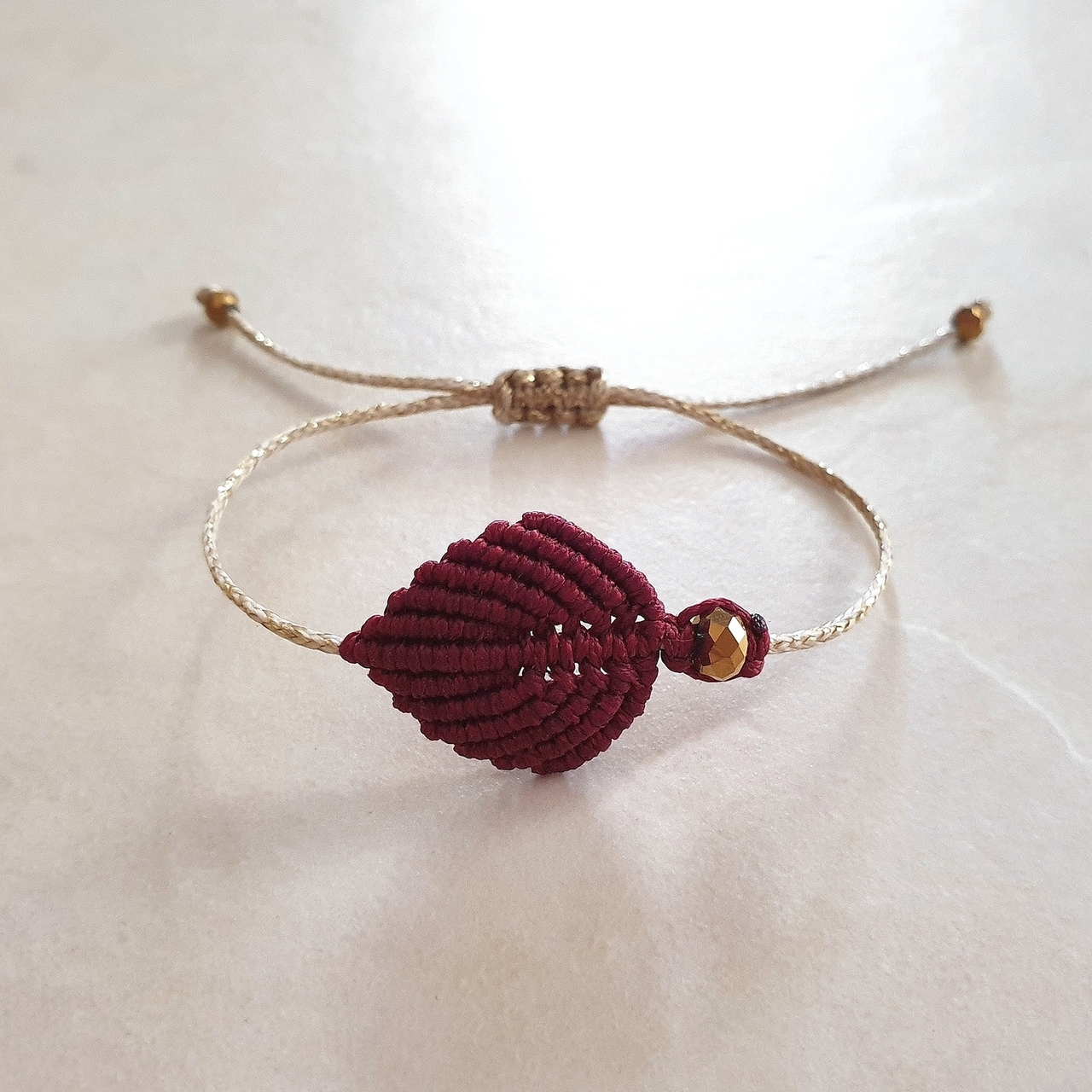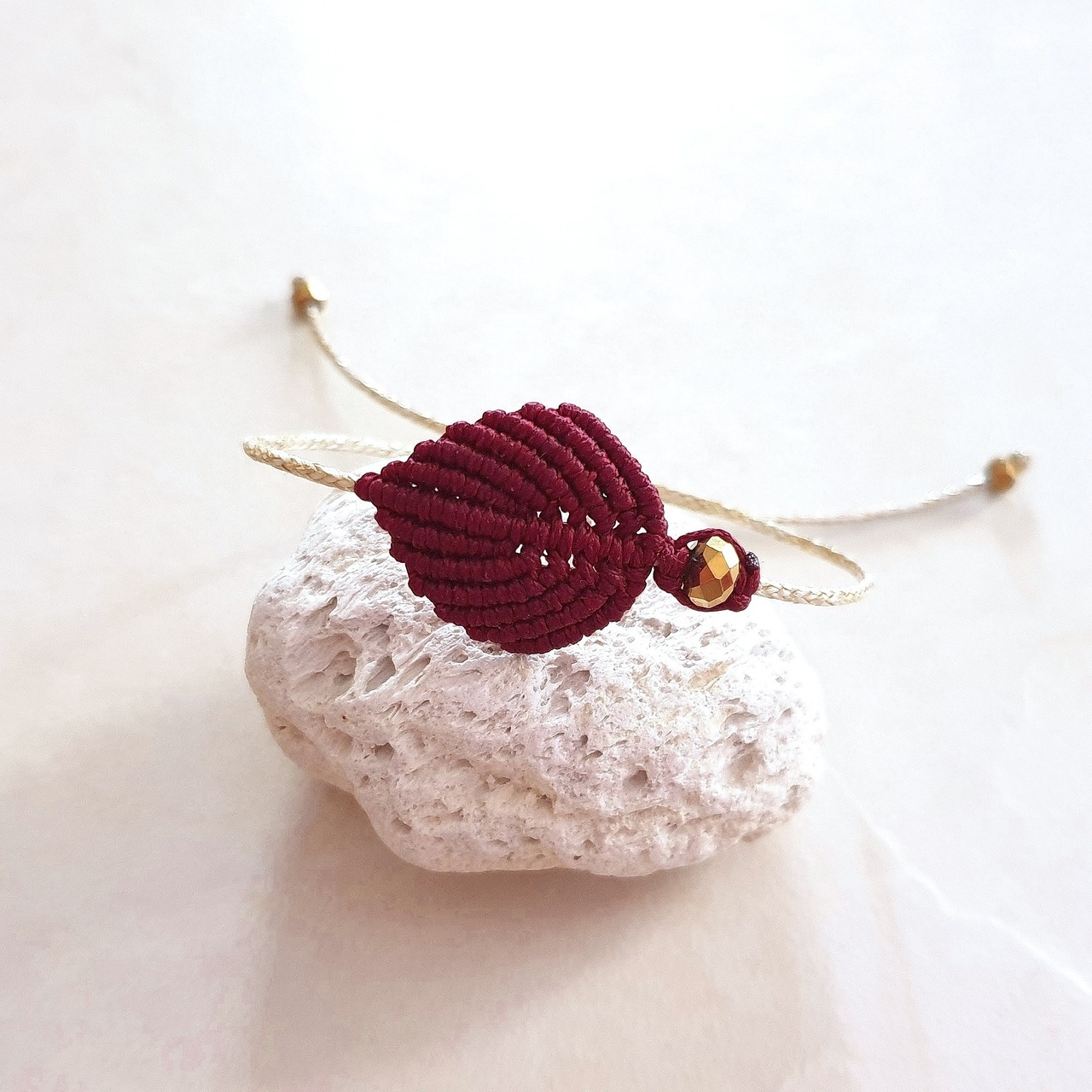 Βραχιόλι φύλλο χειροποίητο μακραμέ σε μπορντό χρώμα πλεγμένο πάνω σε εκρού χρυσό μεταλιζέ κορδόνι. Με κούμπωμα αυξομείωσης για να ταιριάζει σε όλα τα μεγέθη. Το φύλλο και οι άκρες του βραχιολιού στολίζονται με χρυσές κρυστάλλινες χάντρες.