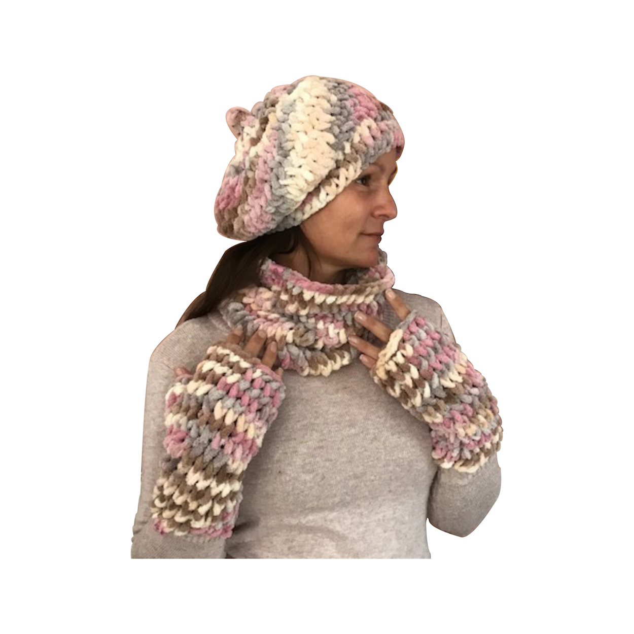Σετ χειροποίητων πλεκτών: μπερέ, λαιμός και γάντια χωρίς δάχτυλα. Είναι πολύ μαλακά και ζεστά, επίσης πολύ ελαφρύ. Ιδανικό για να περάσετε μια κρύο ημέρα με στιλ.