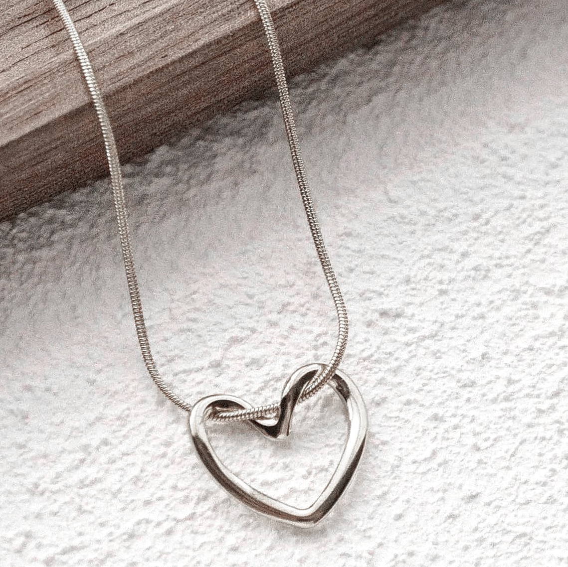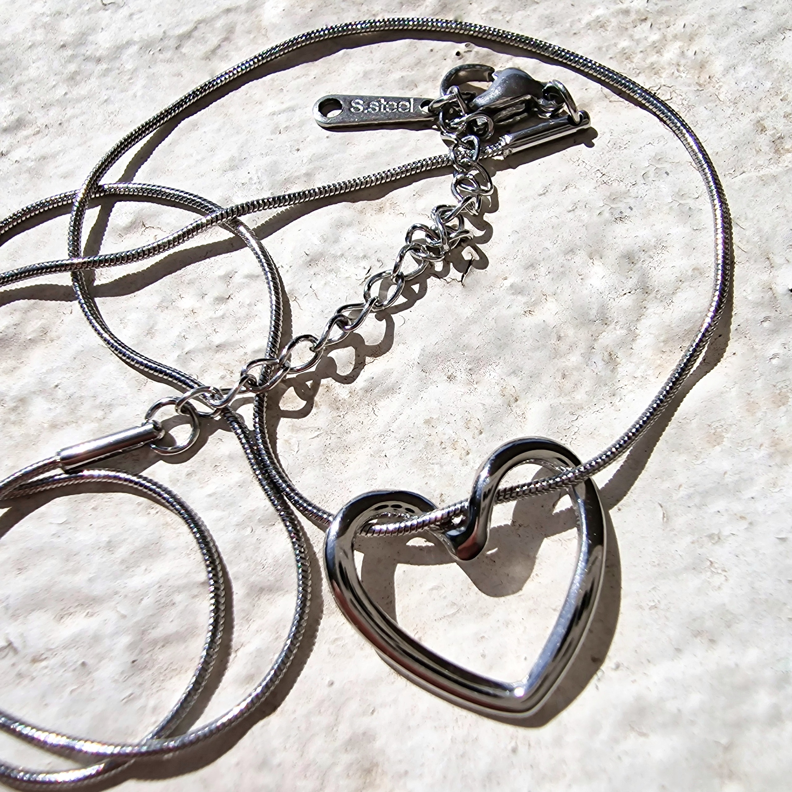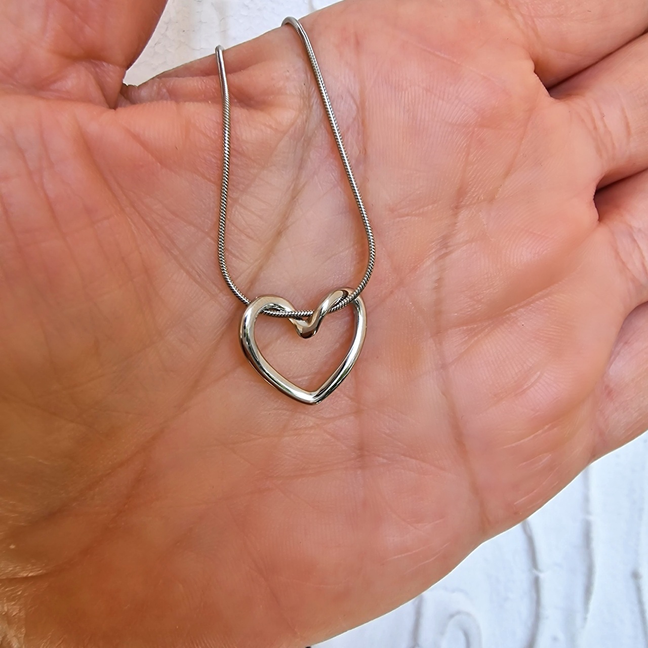 Kολιέ minimal αισθητικής με καρδιά infinity αιωρούμενη περαστή σε ατσάλινη αλυσίδα φίδι.