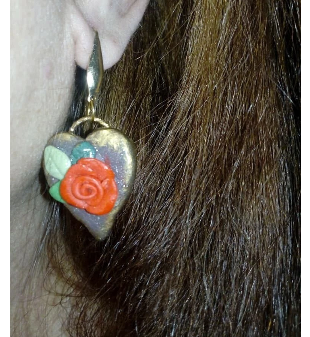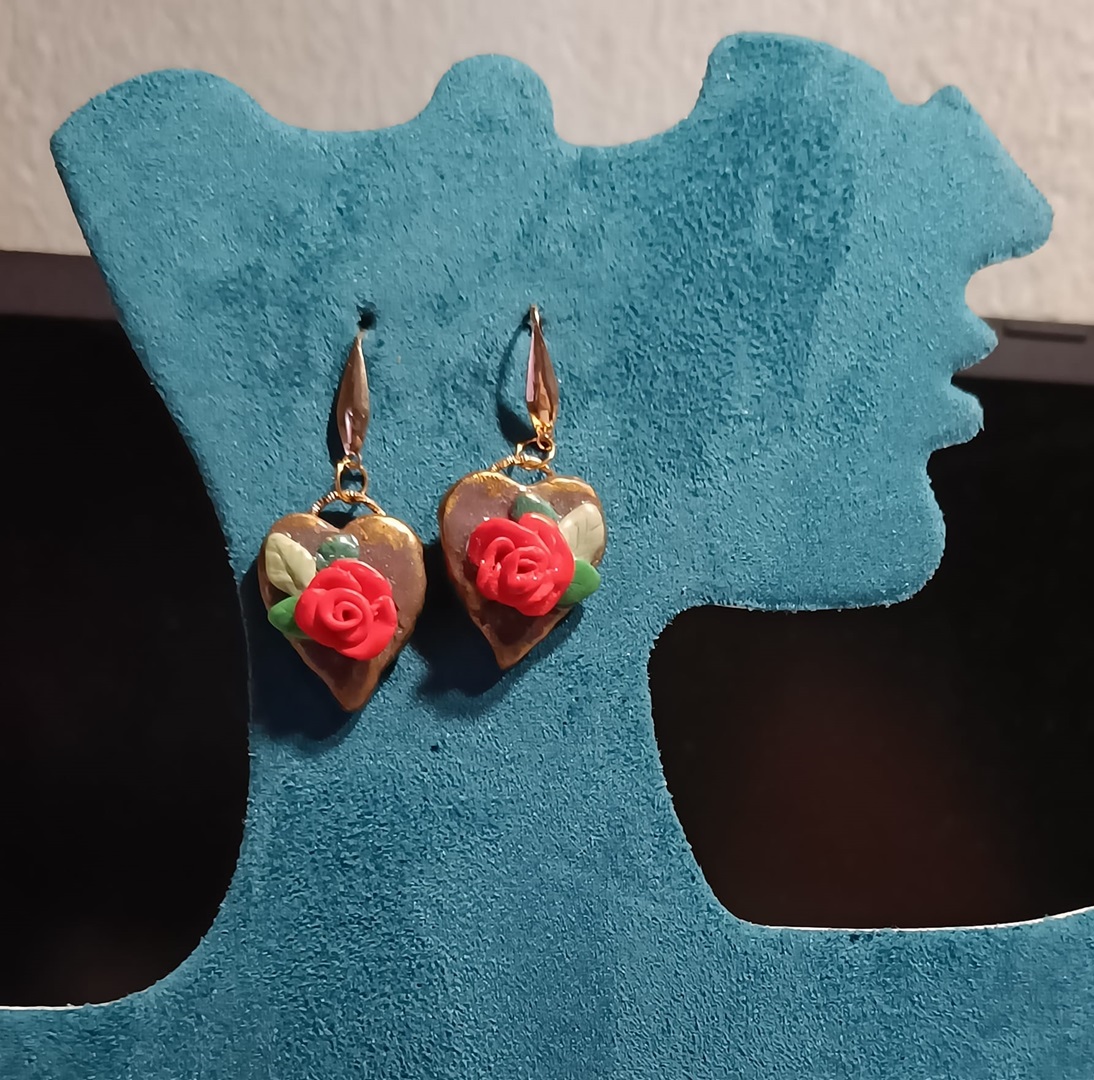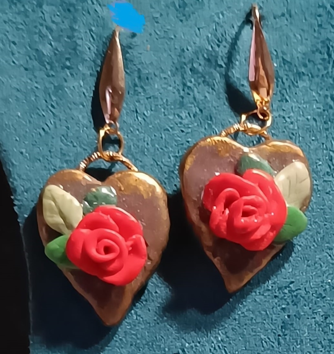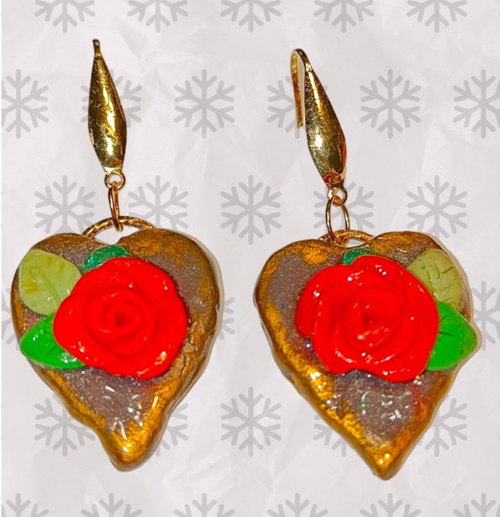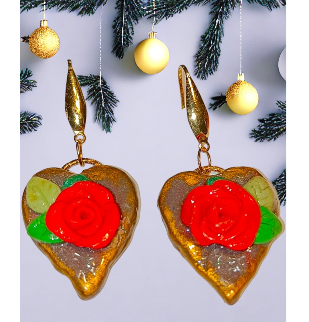 Χειροποίητα Κρεμαστά Σκουλαρίκια από πολυμερή πηλό με ανάγλυφα τριαντάφυλλα, πινελιές από σκόνη χρυσού και επικαλυμμένα με υγρό γυαλί για λάμψη και προστασία.