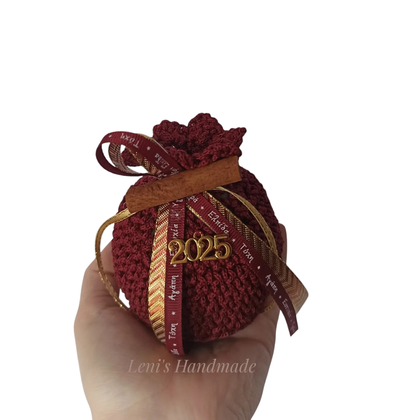 Χειροποίητο πλεκτό γούρι ρόδι σε μπορντό απόχρωση με χρυσές λεπτομέρειες. Ήξερες ότι το ρόδι σαν γούρι συμβολίζει την καλοτυχία και την αφθονία;