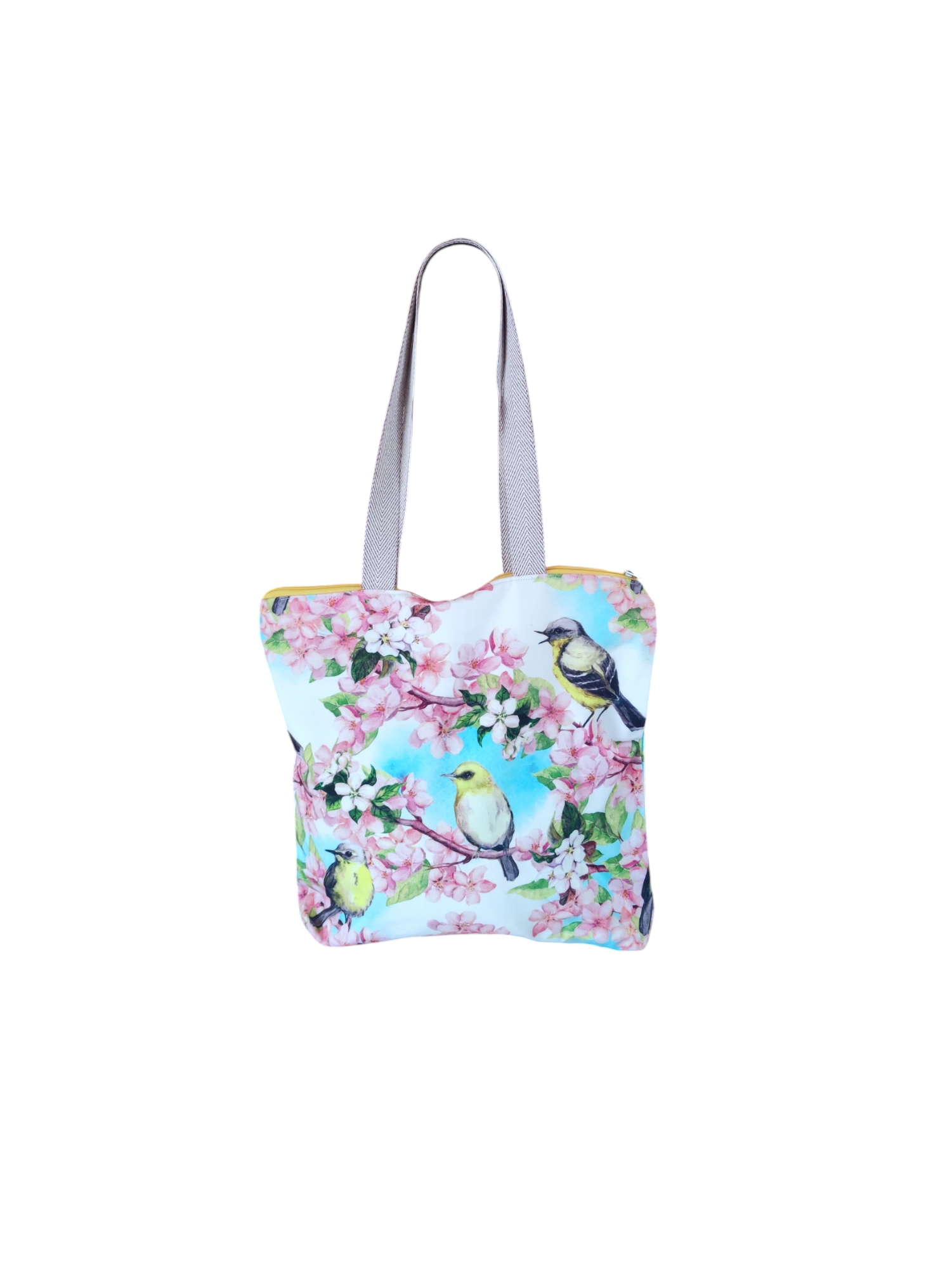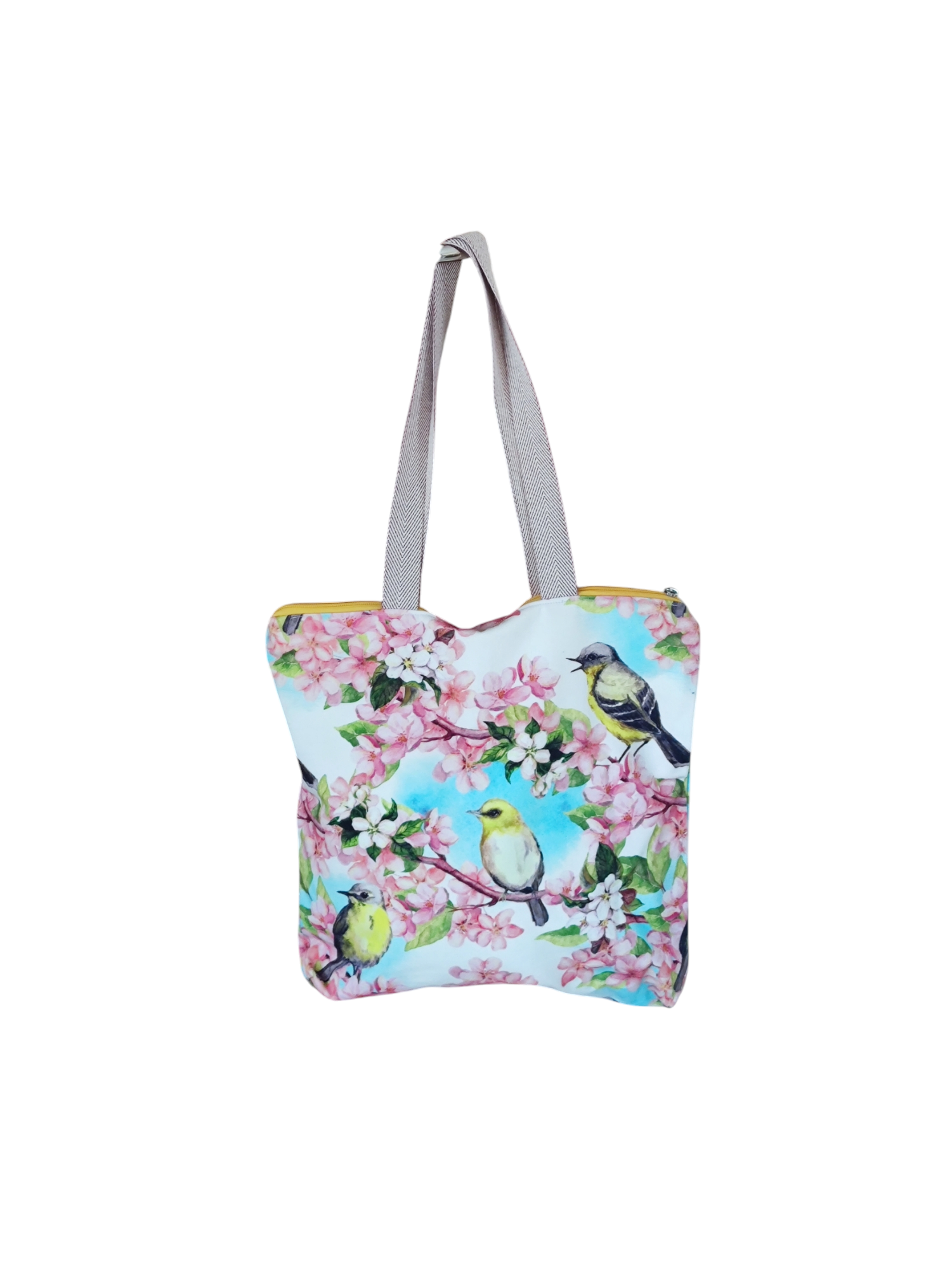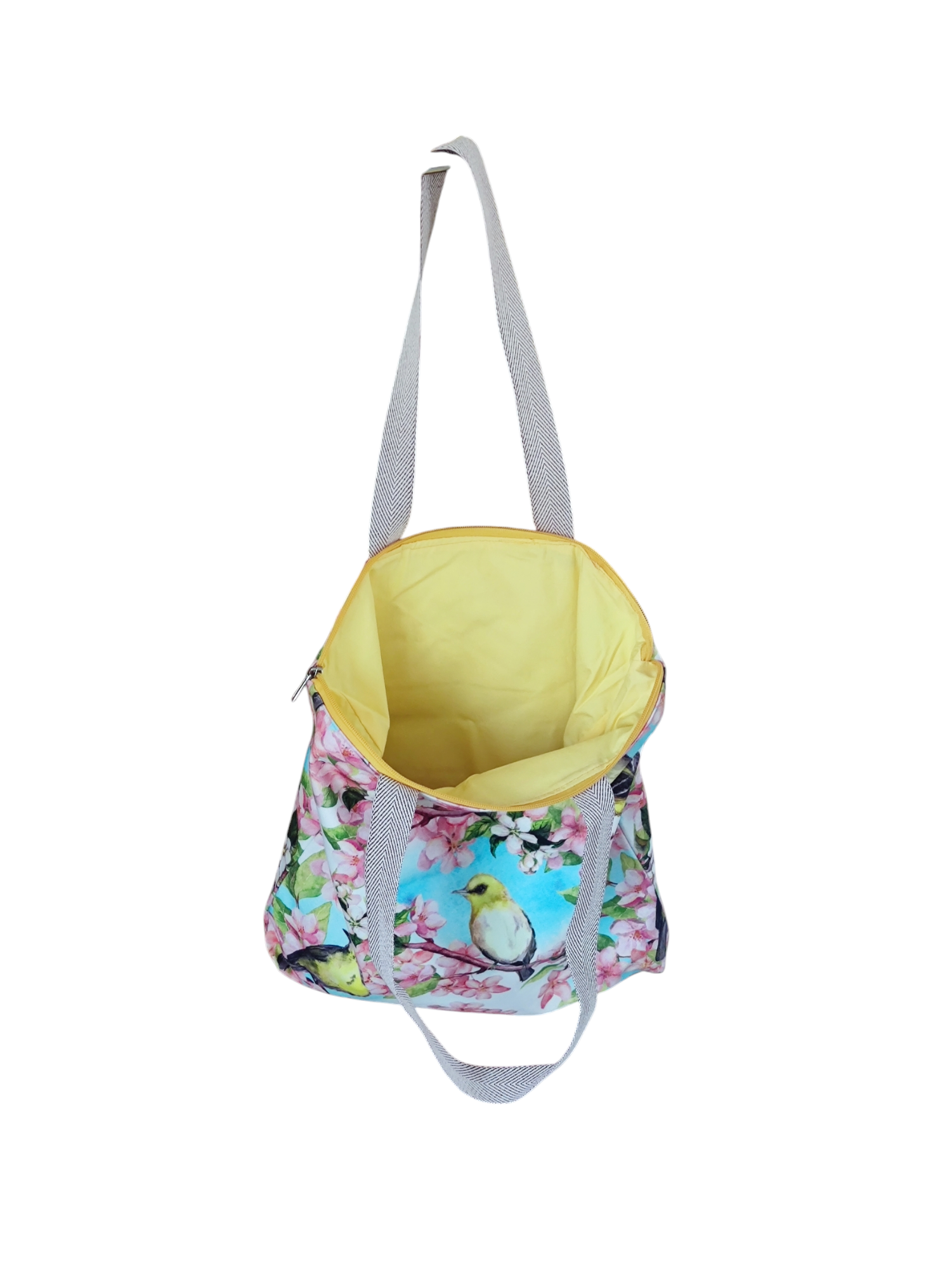 Χειροποίητη τσάντα ώμου υφασμάτινη, πολλαπλών χρήσεων, με εσωτερική επένδυση βαμβακερό ύφασμα, έχει τσέπη, κουμπώνει με φερμουάρ, κρατιέται με ιμάντα βαμβακερή.Ιδανική για δραστηριότητες, εκδρομές, βόλτες, ή για δώρο.
