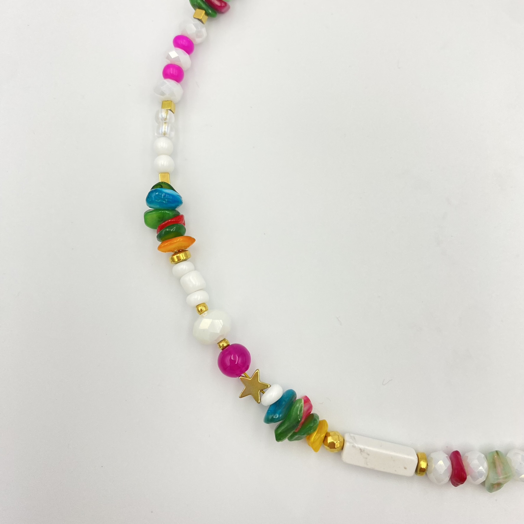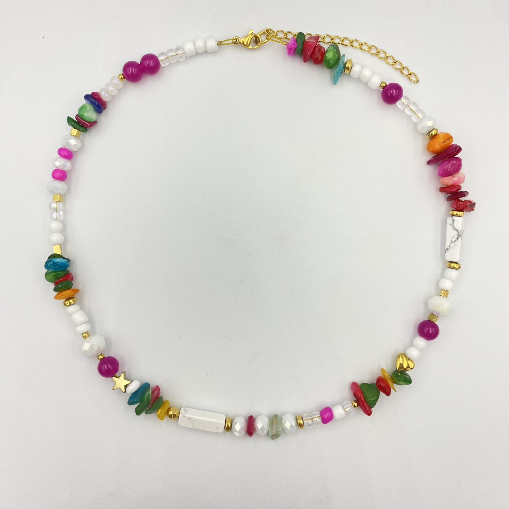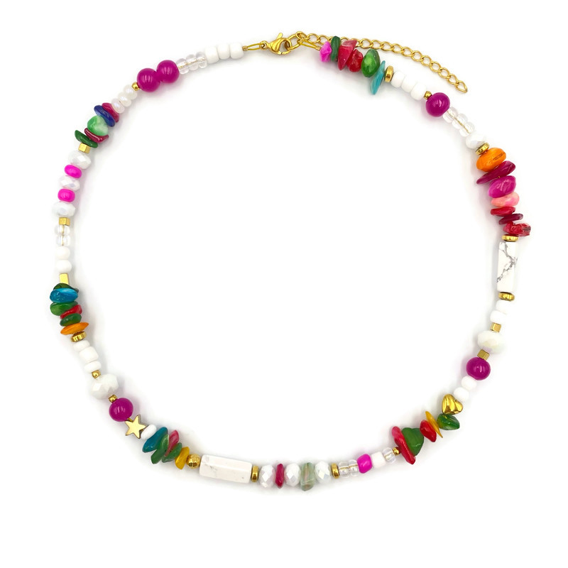 Μοντέρνο Κολιέ με ημιπολύτιμους λίθους που αποτελείται απο αιματίτη, χαολίτη, πολύχρωμο κοχύλι ακανόνιστο, κρύσταλλα και χάντρες.
