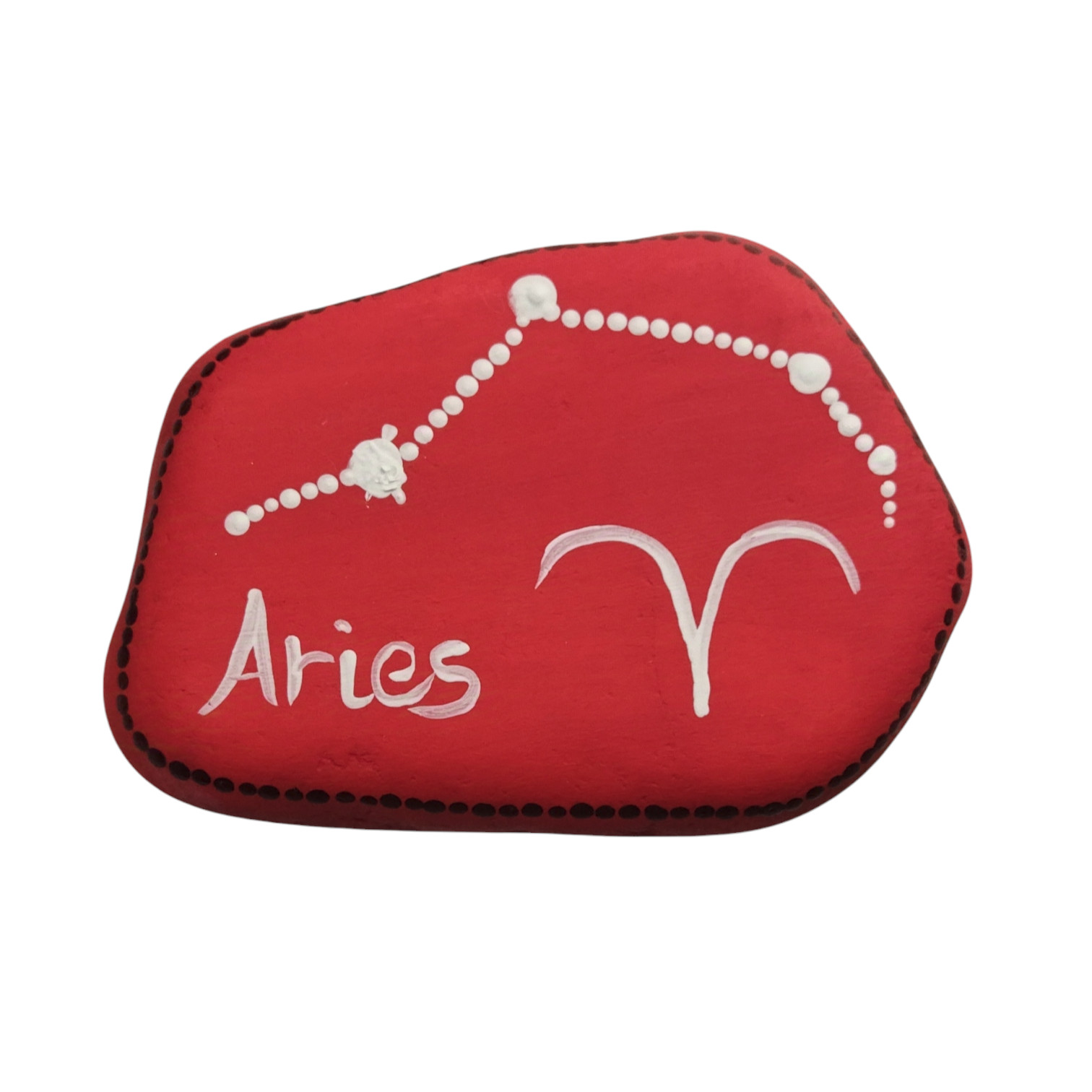 Πέτρα ζωγραφισμένη στο χέρι που αποτυπώνει τον αστερισμό του Κριού σε κόκκινο χρώμα που αντιπροσωπεύει το ζώδιο αυτό. Ιδανικό για δώρο σε αγαπημένα πρόσωπα ή για να στολίσετε τον δικό σας χώρο με έναν προσωπικό συμβολισμό.