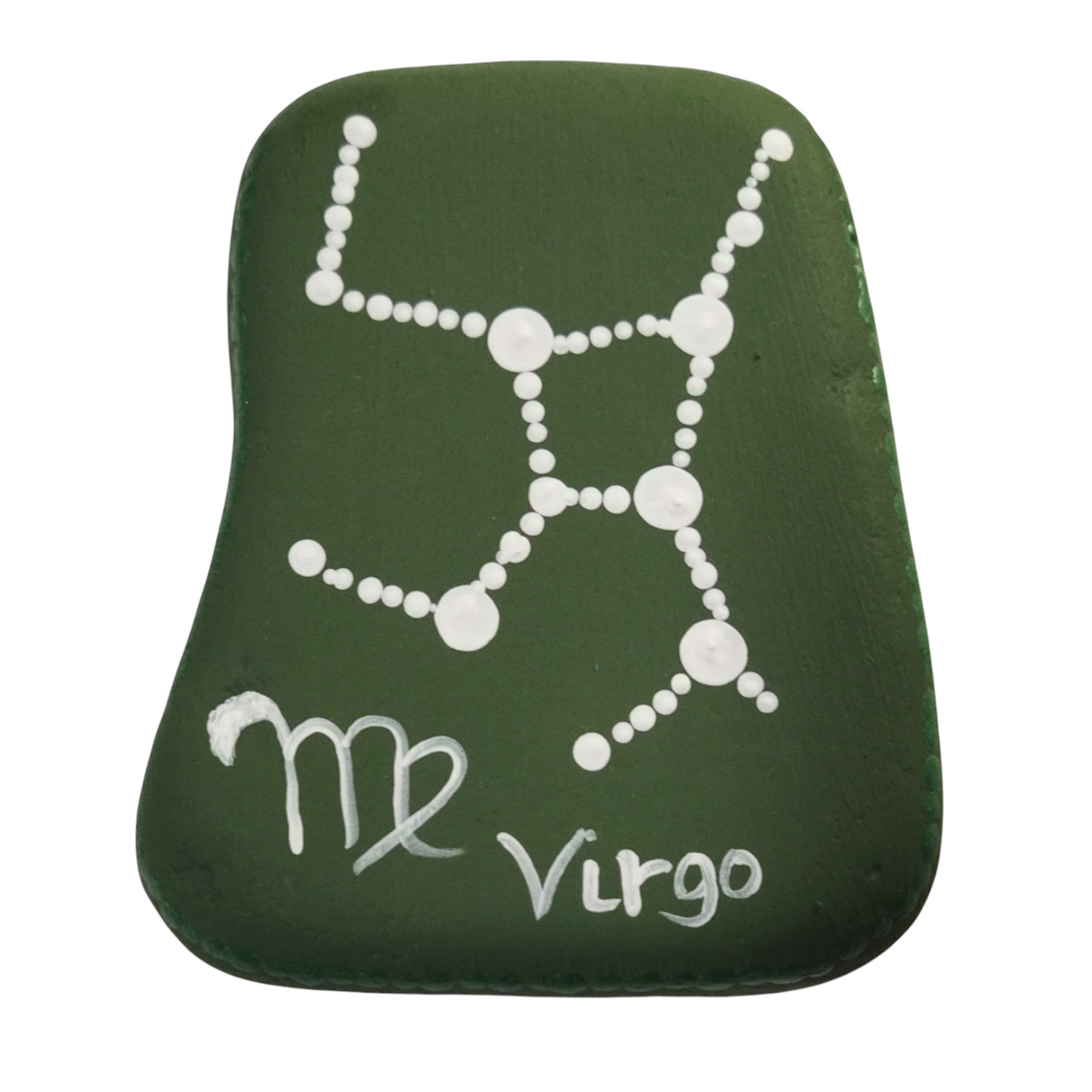 Πέτρα ζωγραφισμένη στο χέρι που αποτυπώνει τον αστερισμό της Παρθένου σε λαδί χρώμα που αντιπροσωπεύει το ζώδιο αυτό. Ιδανικό για δώρο σε αγαπημένα πρόσωπα ή για να στολίσετε τον δικό σας χώρο με έναν προσωπικό συμβολισμό.
