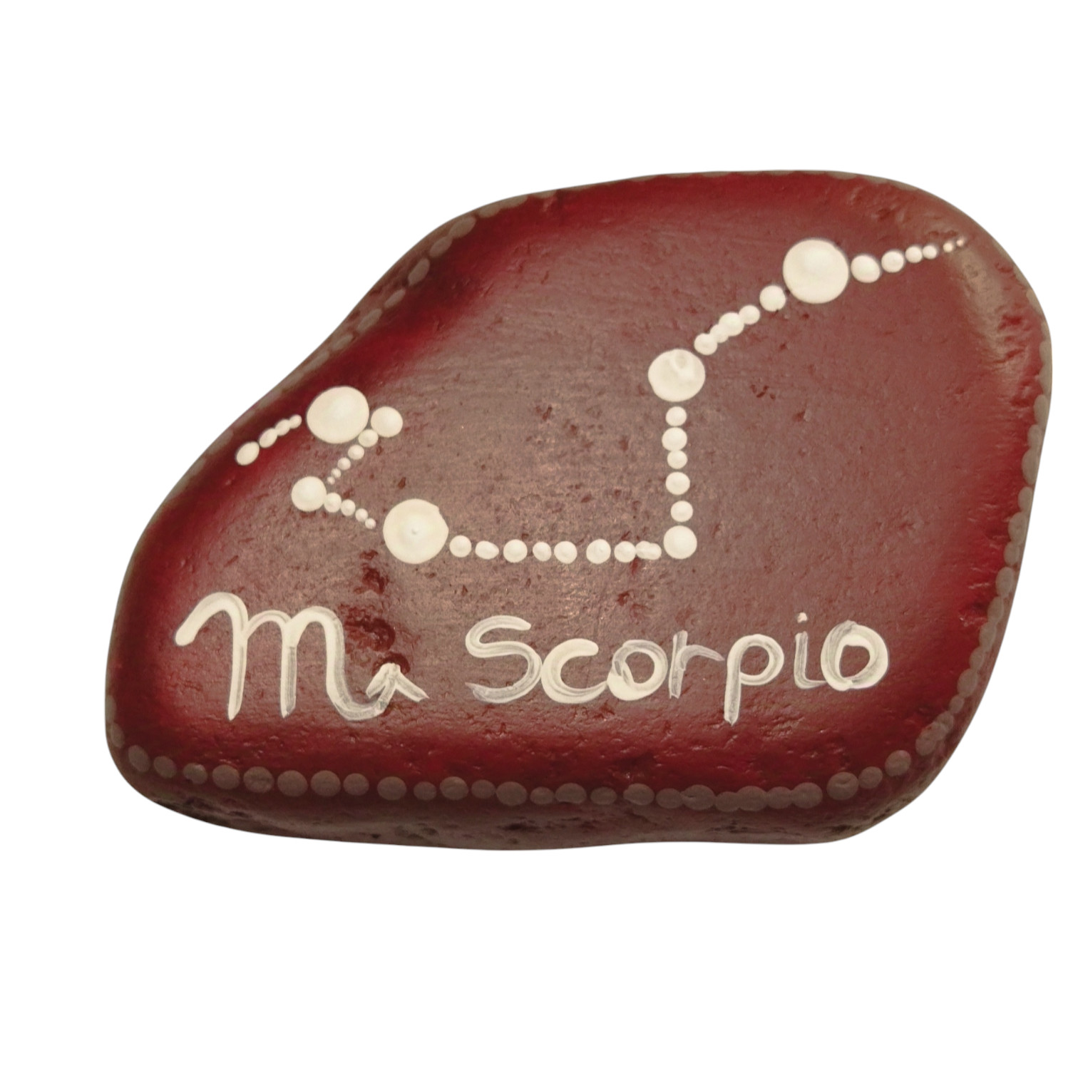 Πέτρα ζωγραφισμένη στο χέρι που αποτυπώνει τον αστερισμό του Σκορπιού σε μπορντώ χρώμα που αντιπροσωπεύει το ζώδιο αυτό. Ιδανικό για δώρο σε αγαπημένα πρόσωπα ή για να στολίσετε τον δικό σας χώρο με έναν προσωπικό συμβολισμό.