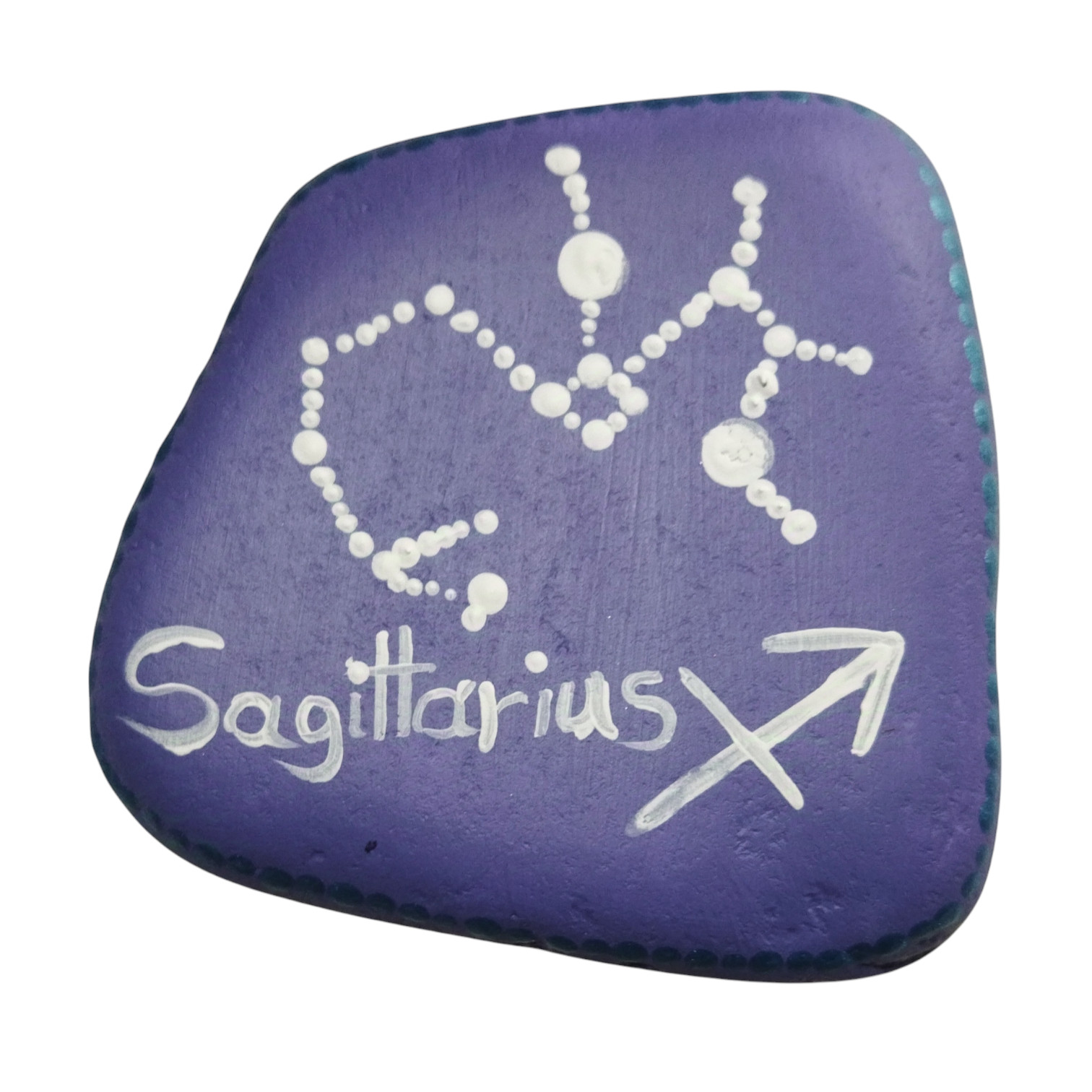 Πέτρα ζωγραφισμένη στο χέρι που αποτυπώνει τον αστερισμό του Τοξότη σε μωβ-μπλε χρώμα που αντιπροσωπεύει το ζώδιο αυτό. Ιδανικό για δώρο σε αγαπημένα πρόσωπα ή για να στολίσετε τον δικό σας χώρο με έναν προσωπικό συμβολισμό.