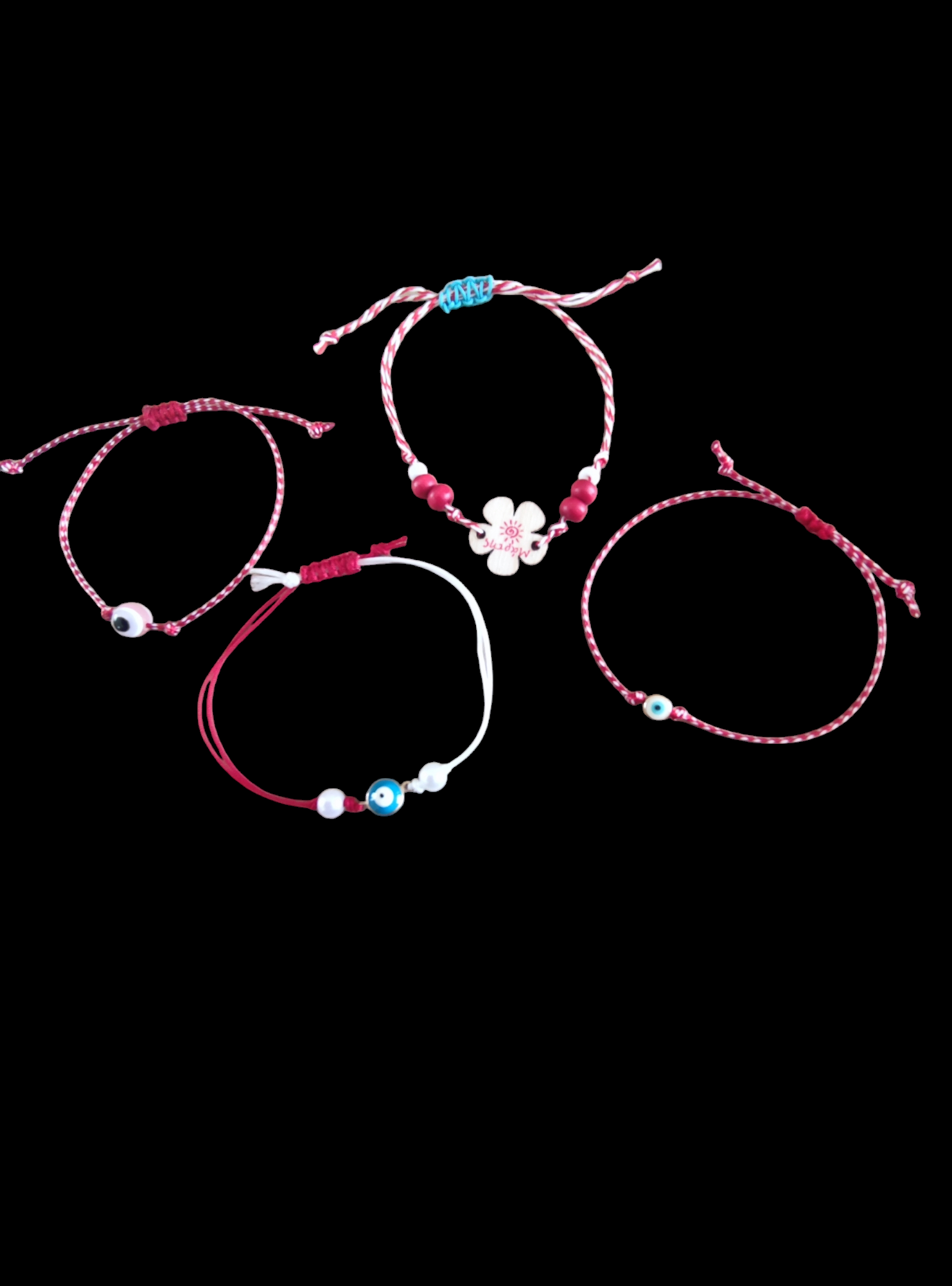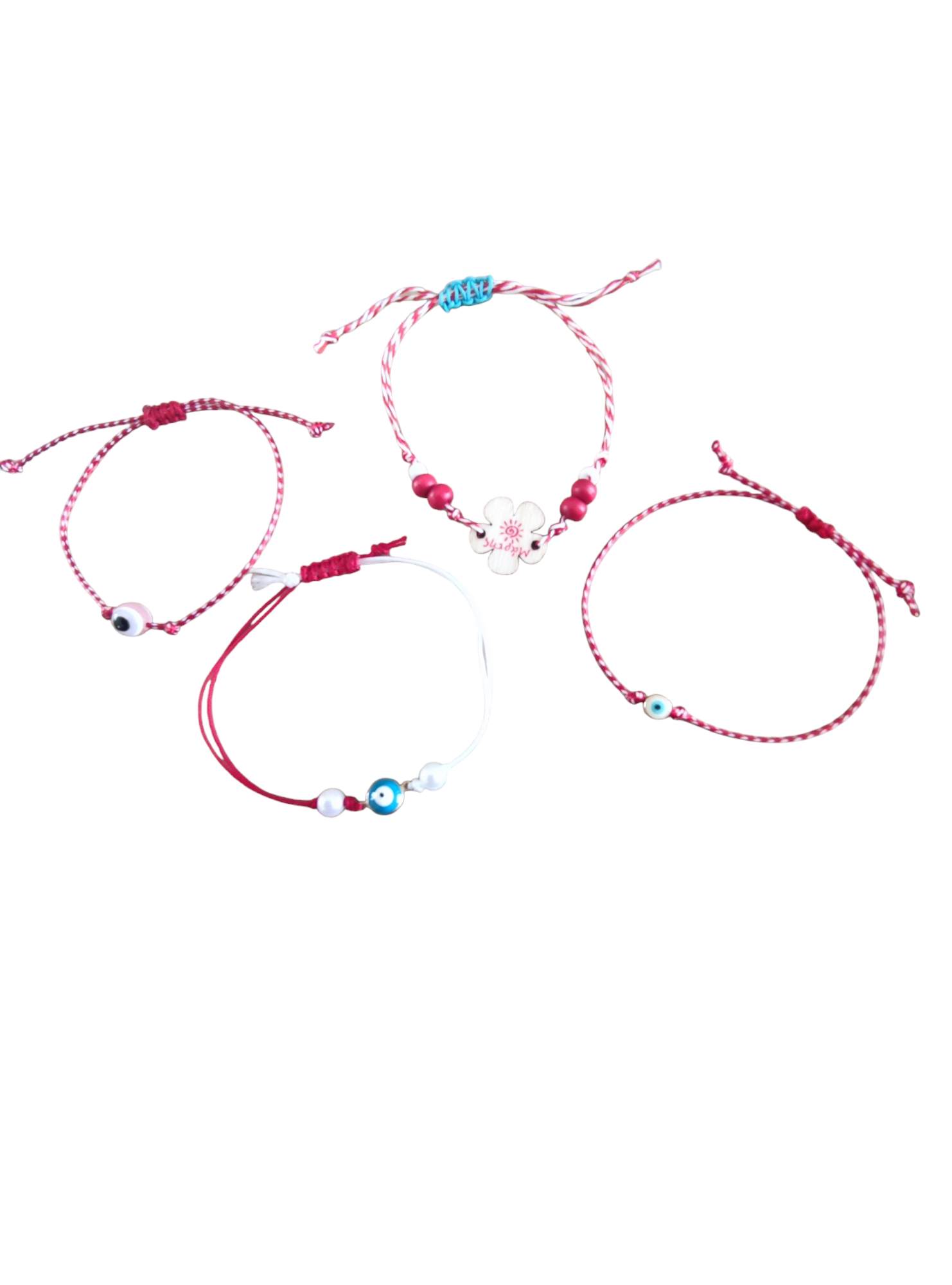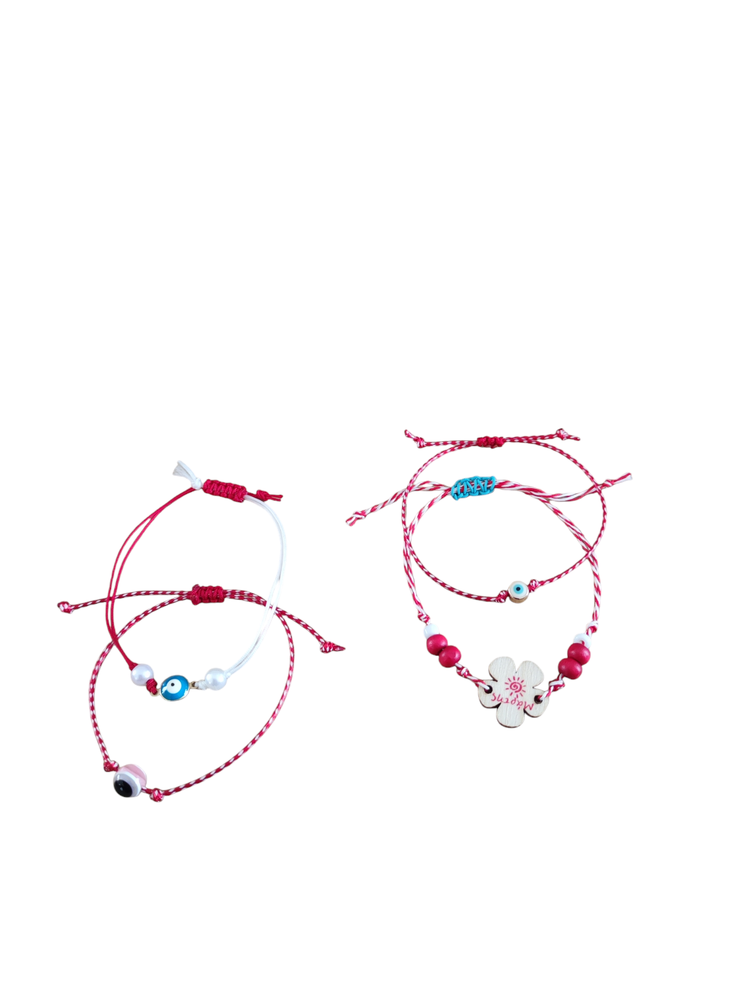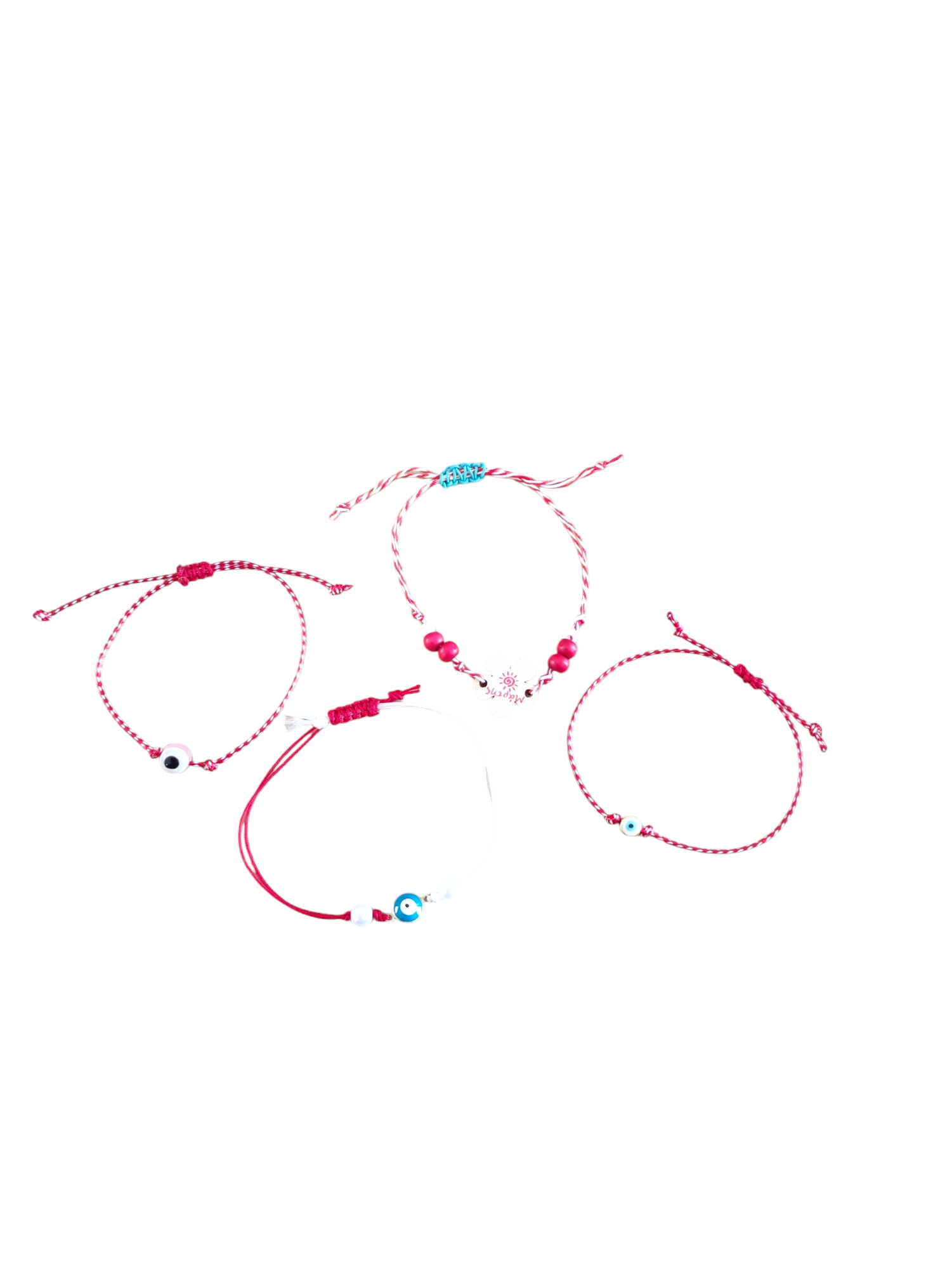 Σετ, 4 ΤΕΜ. Χειροποίητα μαρτακια, διαφορετικά το καθένα, αποτελούνται από ματάκια, ξύλινο στοιχείο, χάντρες, κορδόνια συνθετικά.