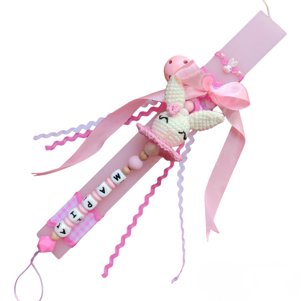 Ροζ λαμπάδα με κλιπ πιπίλας λαγουδάκι με όνομα μωρού