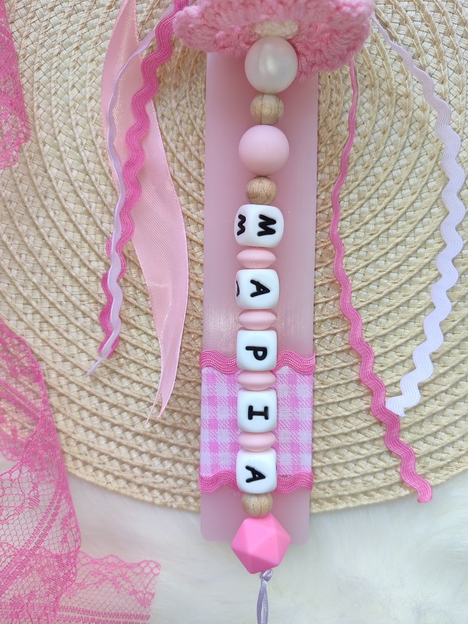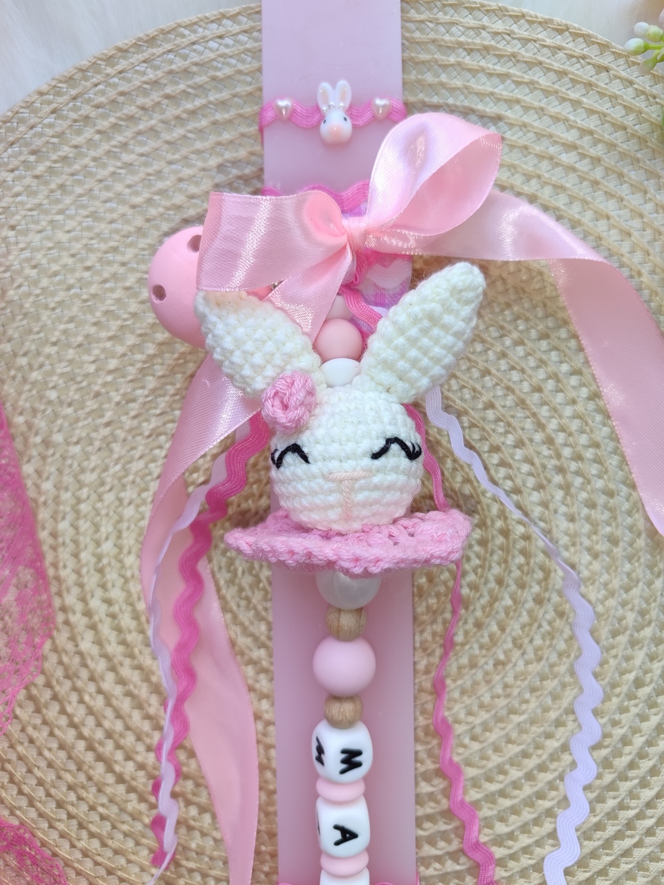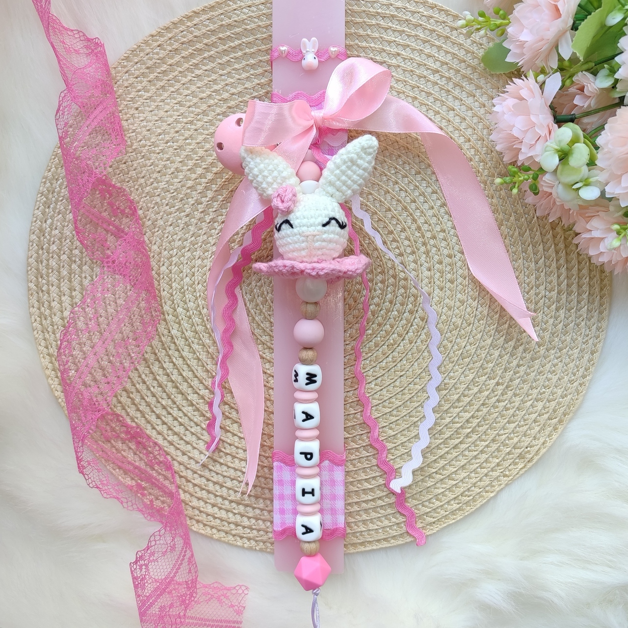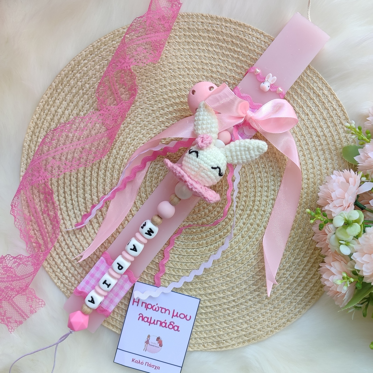 Ροζ λαμπάδα στολισμένη με ροζ καρό ύφασμα, ροζ κορδέλες και κλιπ πιπιλας. Το κλιπ πιπίλας αποτελείται από: Ροζ ξύλινο κλιπ, πλεκτή λαγουδίτσα με ροζ λουλούδι, ροζ φρουρού και μασητικές χάντρες σιλικόνης λευκές, ροζ που σχηματίζουν το όνομα του μωρού σας. Υπάρχει η δυνατότητα να τοποθετηθεί ταμπελακι “Η πρώτη μου λαμπάδα” με ροζ γράμματα, όπως φαίνεται στη δεύτερη φωτογραφία.