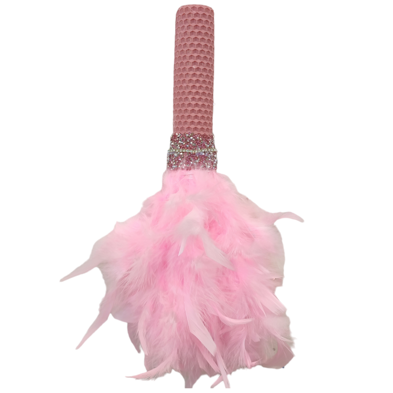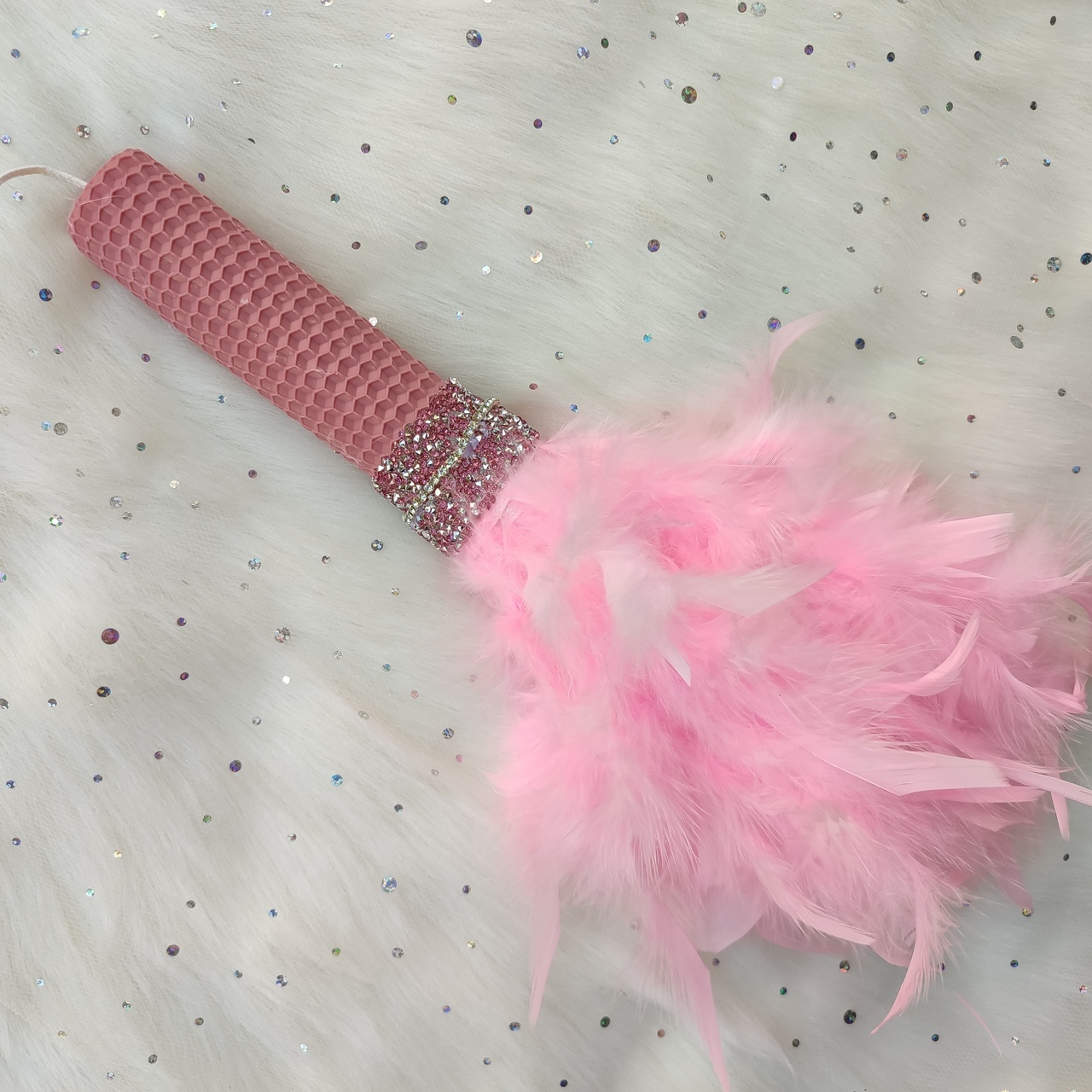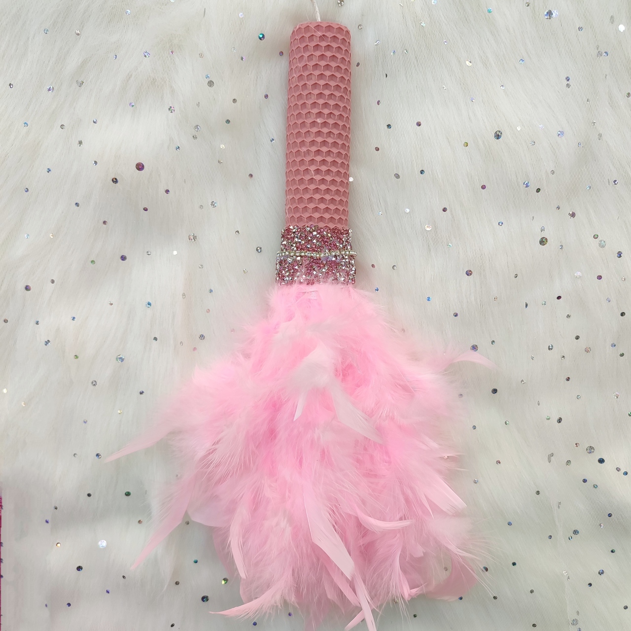 Εντυπωσιακή λαμπάδα από μελισσοκέρι, 28 εκ, σε ροζ στολισμένη με φτερά στο ίδιο χρώμα και στρας σε φούξια και ασημί. Θα τη λάβετε σε συσκευασία δώρου.