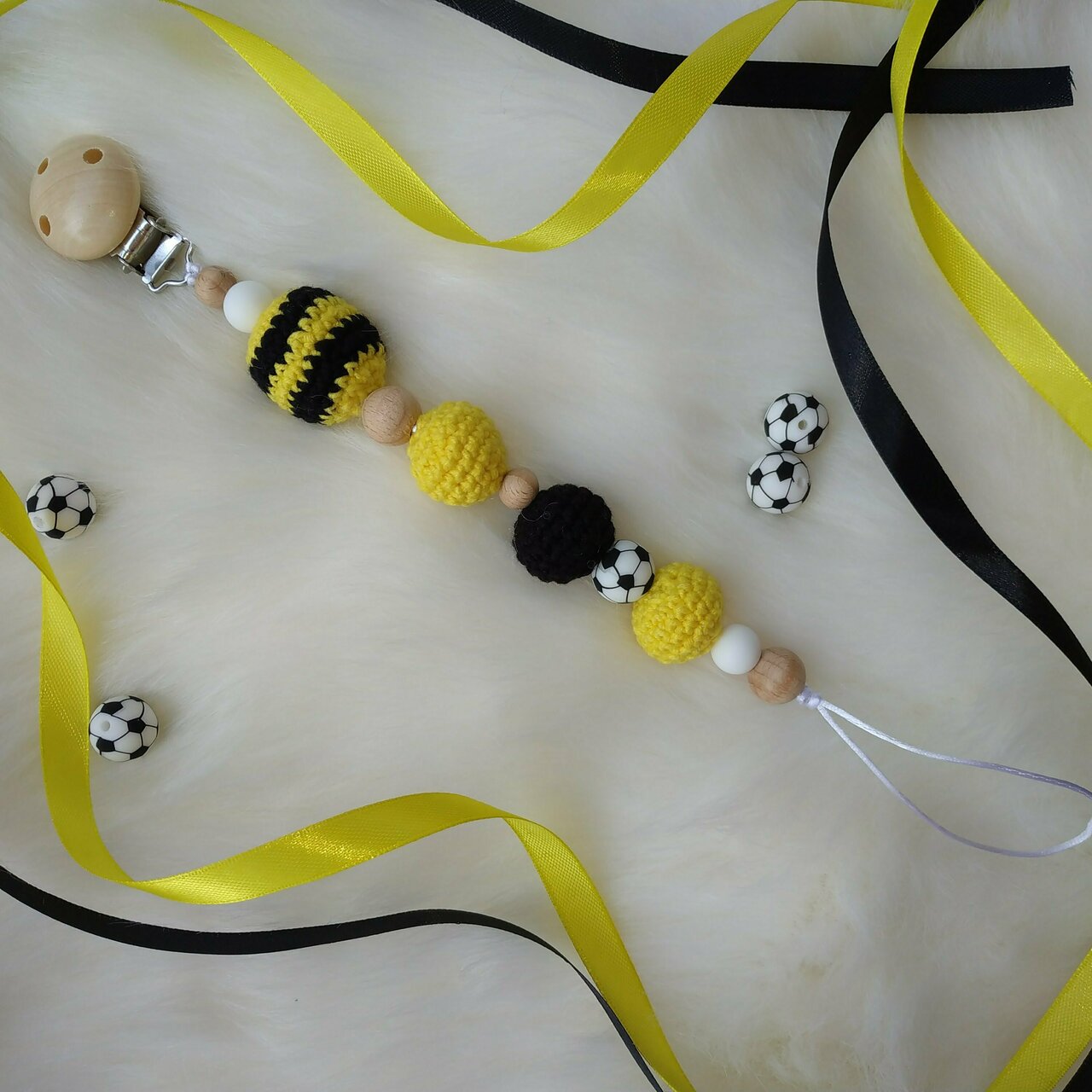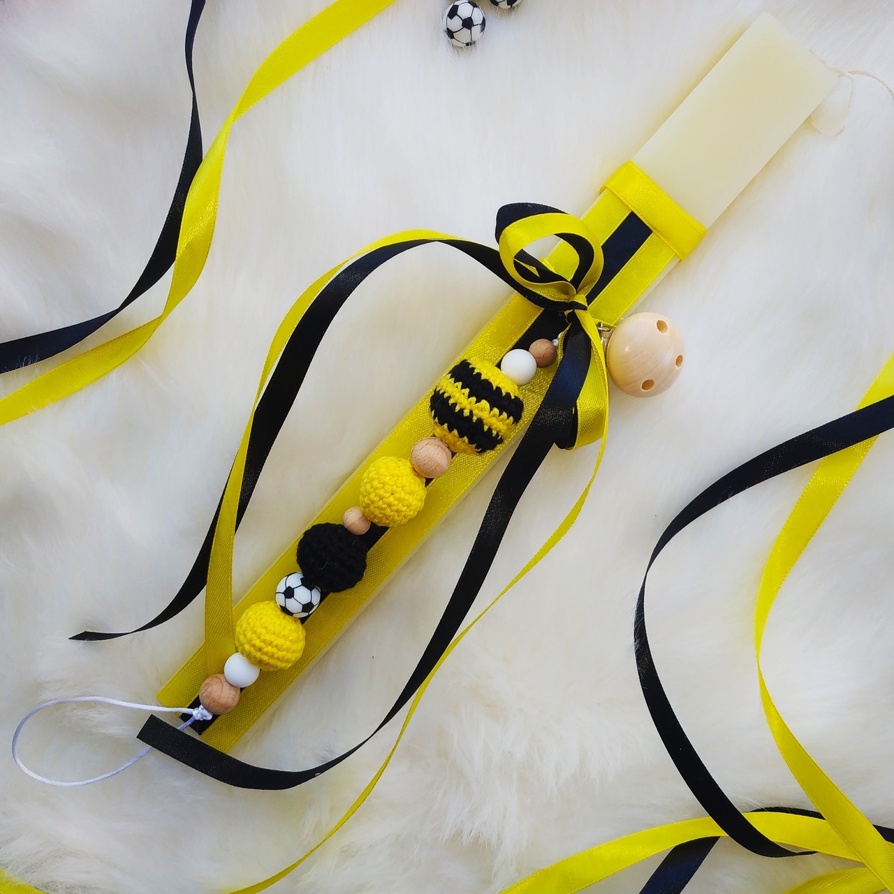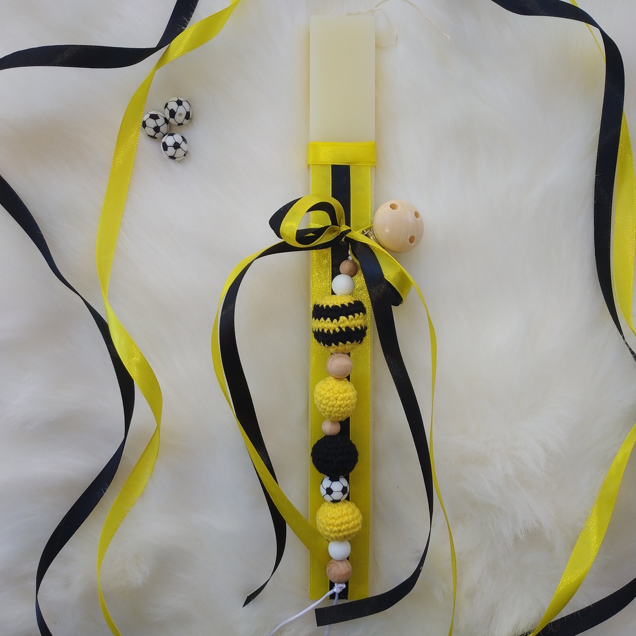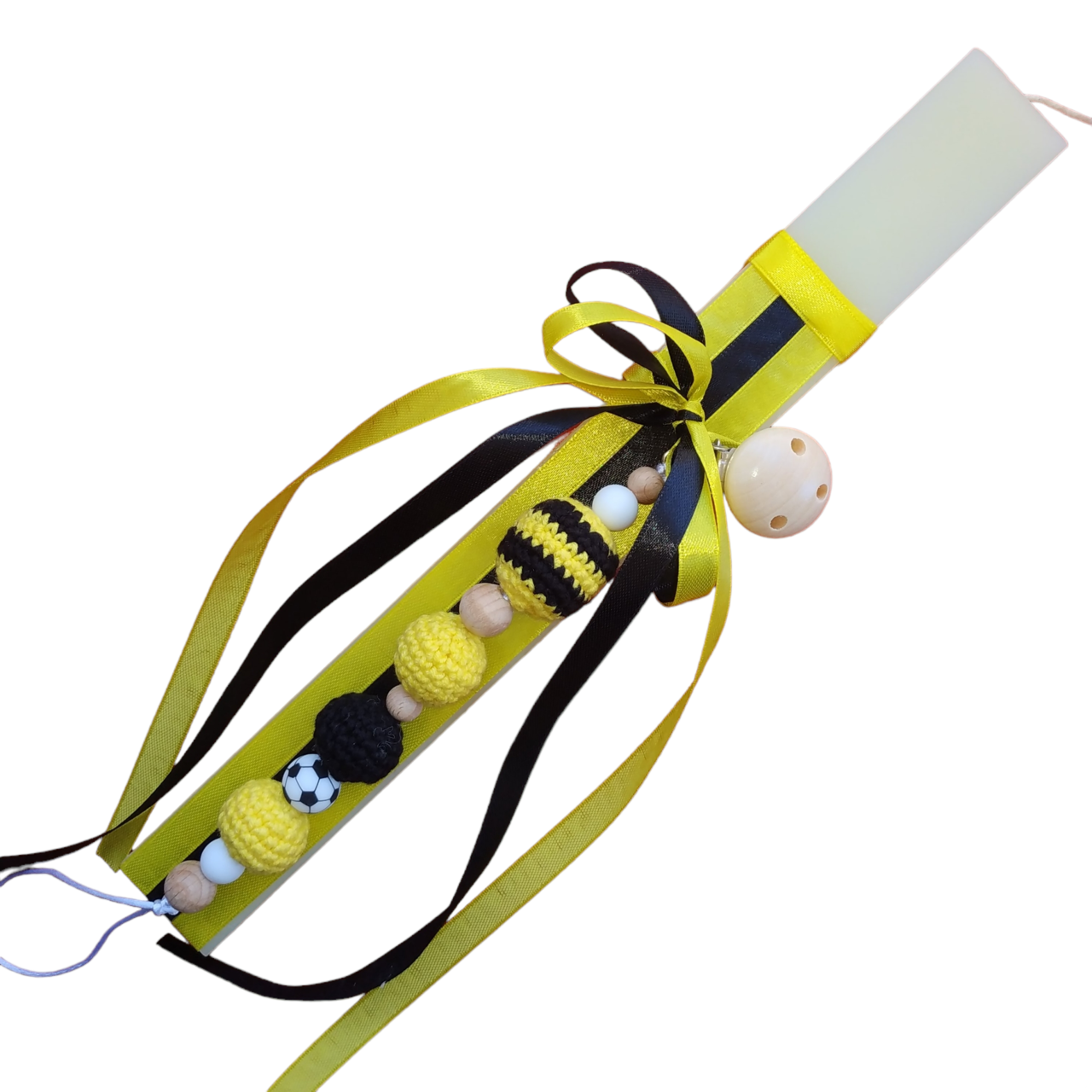 Κιτρινόμαυρη λαμπάδα με ξύλινο κλιπ πιπίλας με ένα μεγάλο πλεκτό στρογγυλό κίτρινο μαύρο, δυο πλεκτά στρογγυλά κίτρινα, ένα μαύρο (νήμα ειδικό για κουκλάκια και γέμιση υποαλλεργικη), χάντρα μασητική σιλικόνης μπάλα, λευκές χάντρες μασητικες σιλικόνης και ξύλινες (κατάλληλες για μωρά (Latex free, BPA free, PVC free, Nitrosamine free, Phthalate free). Η λαμπάδα είναι στολισμένη με κιτρινόμαυρες κορδέλες.